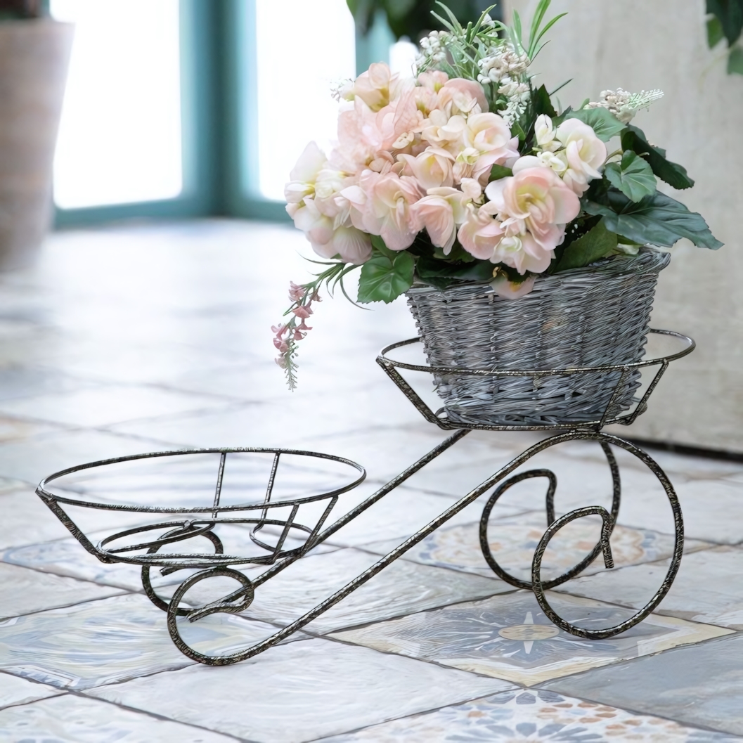 Модель выполнена из металла и оснащена двумя круглыми корзинами для горшков. Одна из них расположена выше, другая — ниже, что делает цветочную композицию более объемной и аккуратной. Посадочный размер каждой корзины рассчитан на горшок диаметром около 14,5 см, благодаря чему подставка подходит для большинства стандартных комнатных растений.