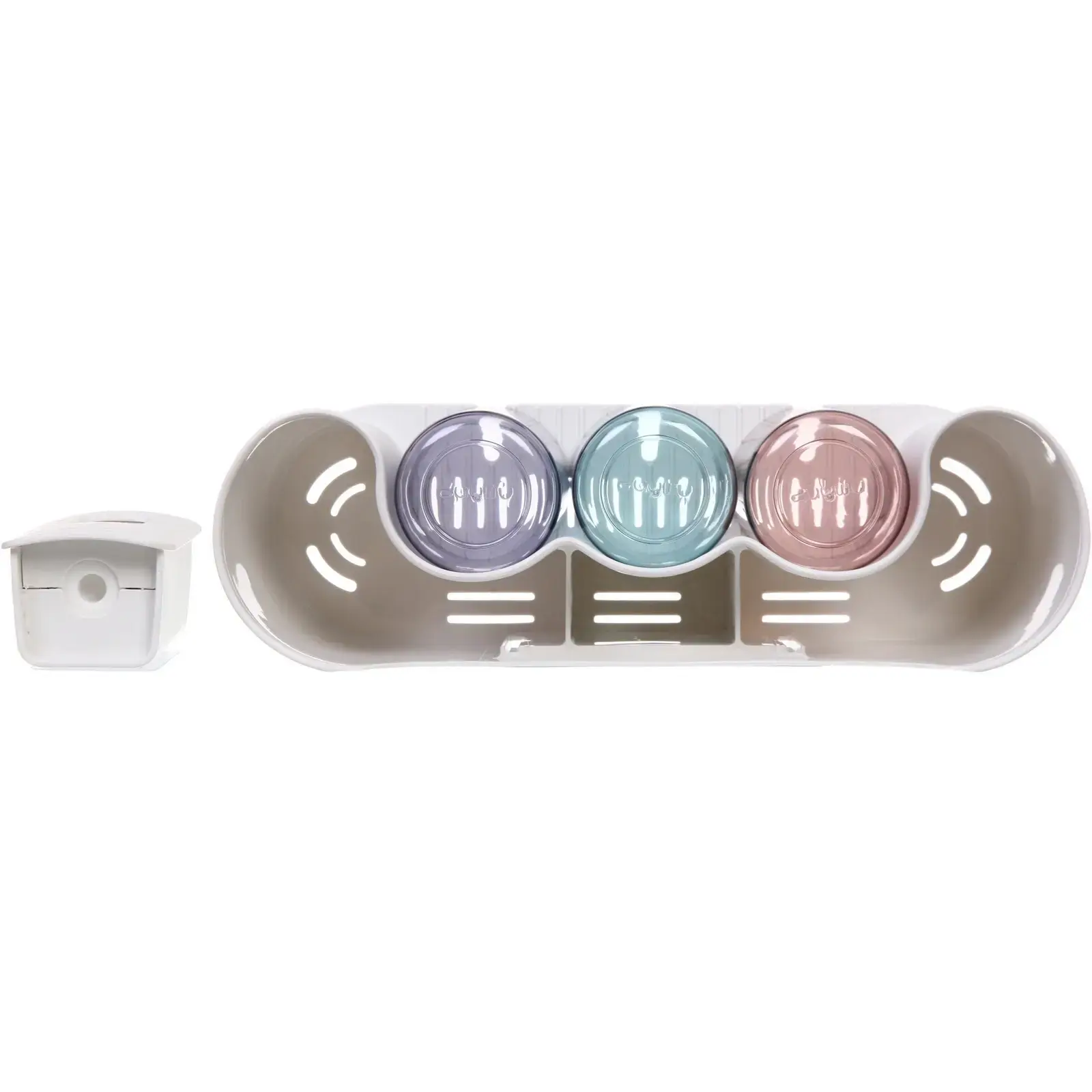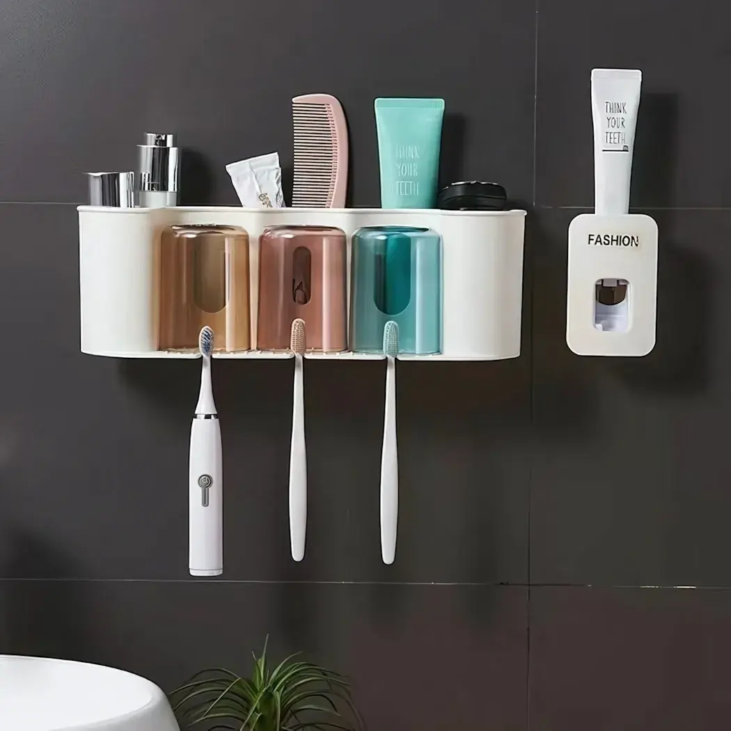 Подставка включает три стакана для зубных щеток и дозатор для зубной пасты, что позволяет удобно разместить все необходимые предметы для умывания. Разделитель с ячейками предотвращает соприкосновение зубных щеток, обеспечивая их гигиеничность. Подставка подходит для использования как в ванной, так и на кухне, что делает её универсальным аксессуаром для вашего дома.
