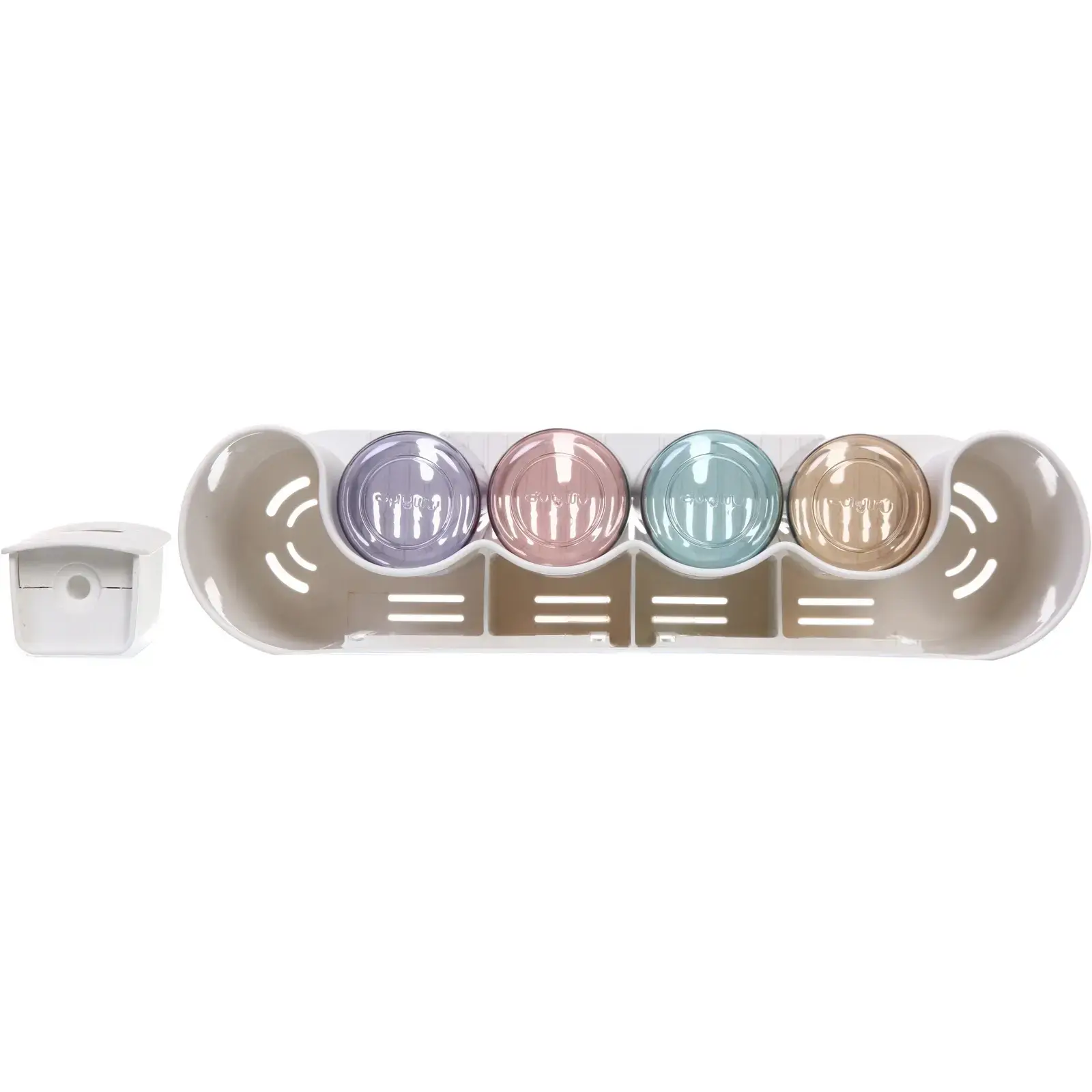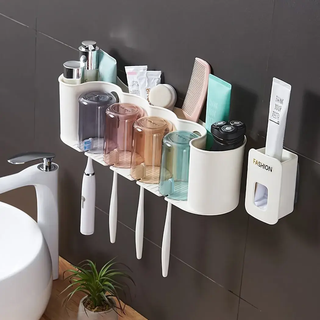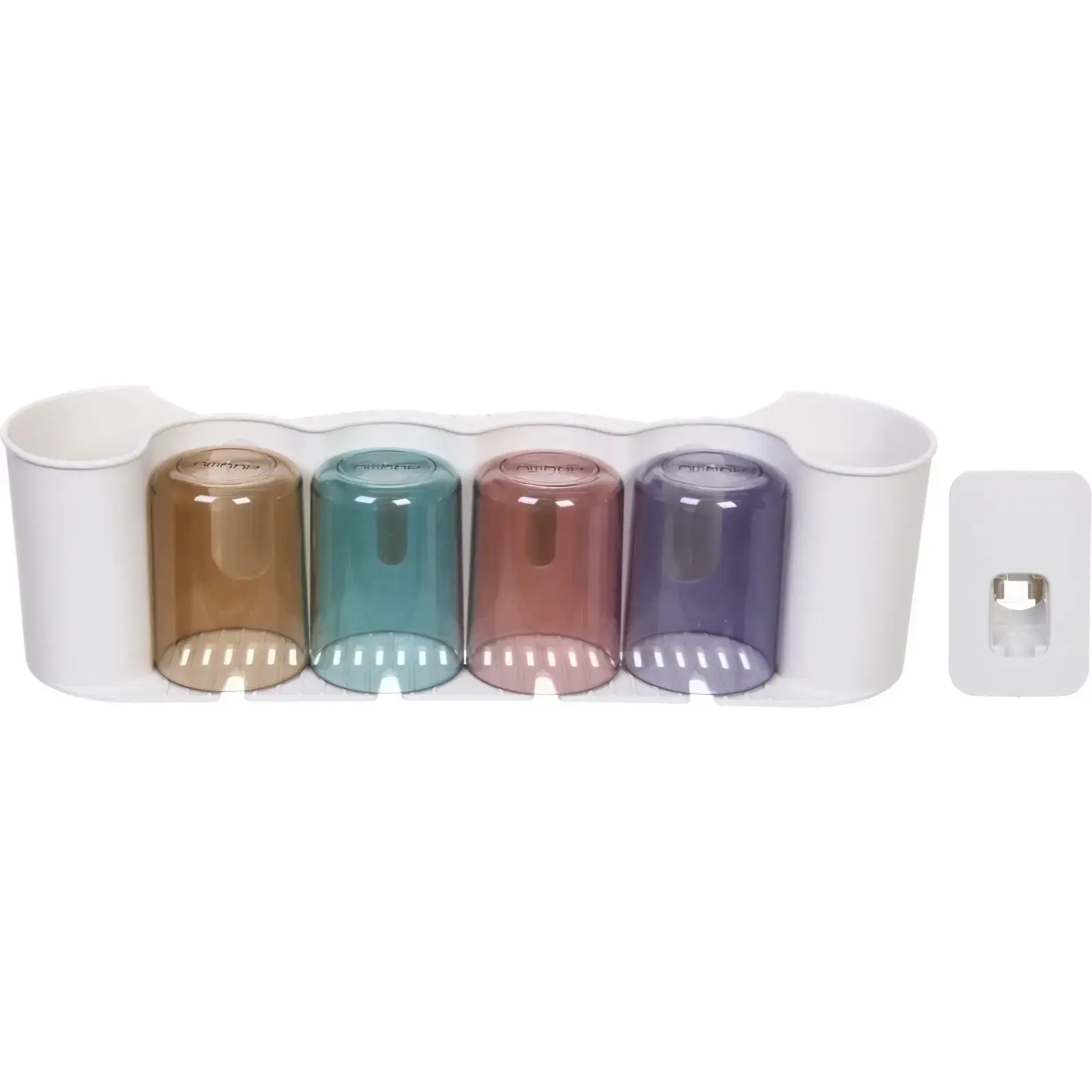 Подставка включает 4 стакана для зубных щёток и дозатор для зубной пасты, что делает её многофункциональной. Она идеально подходит для семейного использования, обеспечивая каждому члену семьи своё место для личной гигиены. Благодаря разделителю с ячейками, вы сможете разместить все необходимые принадлежности компактно и удобно.