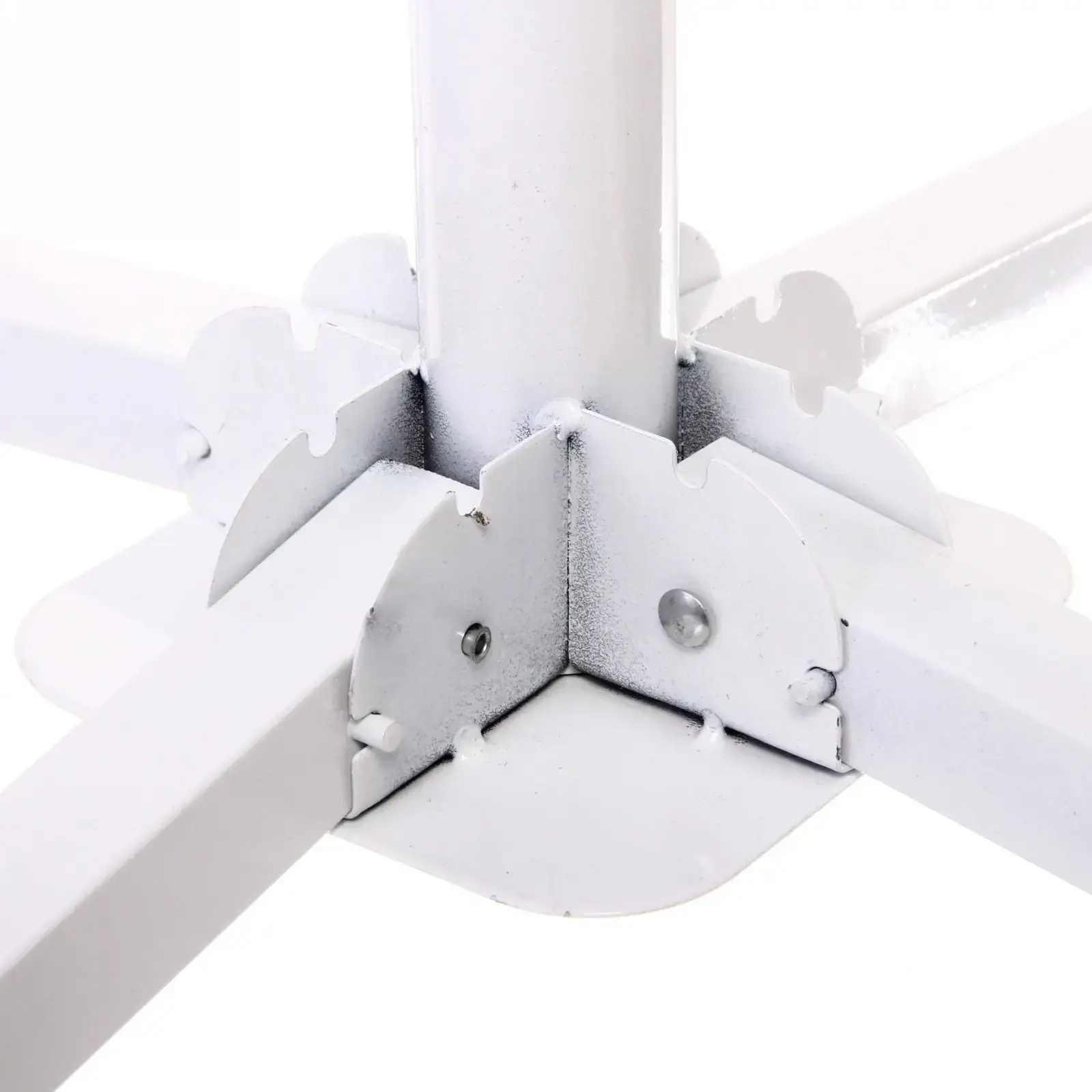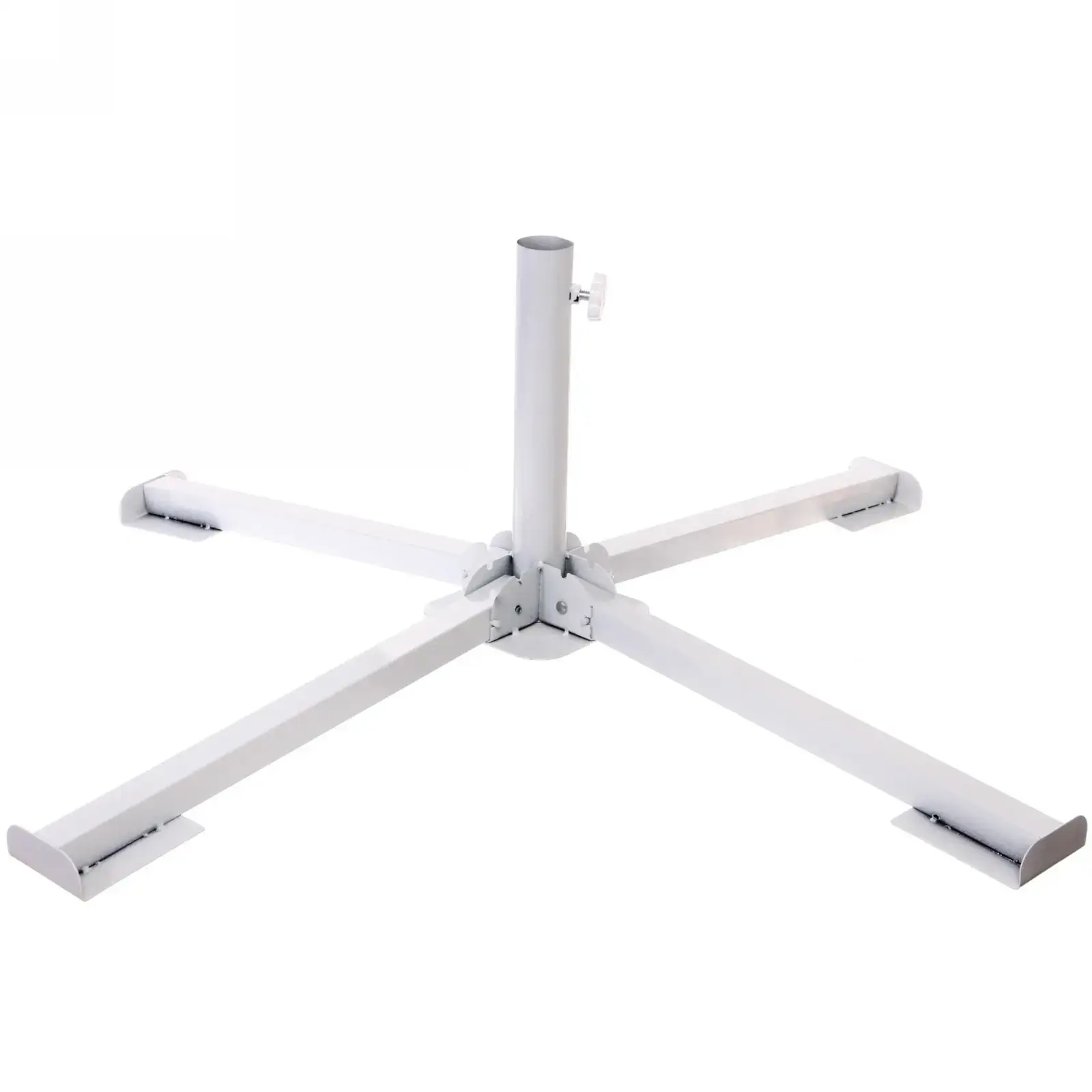 Подставка имеет крестовидную форму, что обеспечивает равномерное распределение нагрузки. Широкие опоры с плоскими основаниями гарантируют стабильность на любой поверхности. Высота подставки составляет 27 см, а ширина опор — 40 см, что делает ее идеальной для использования с различными моделями садовых зонтов.