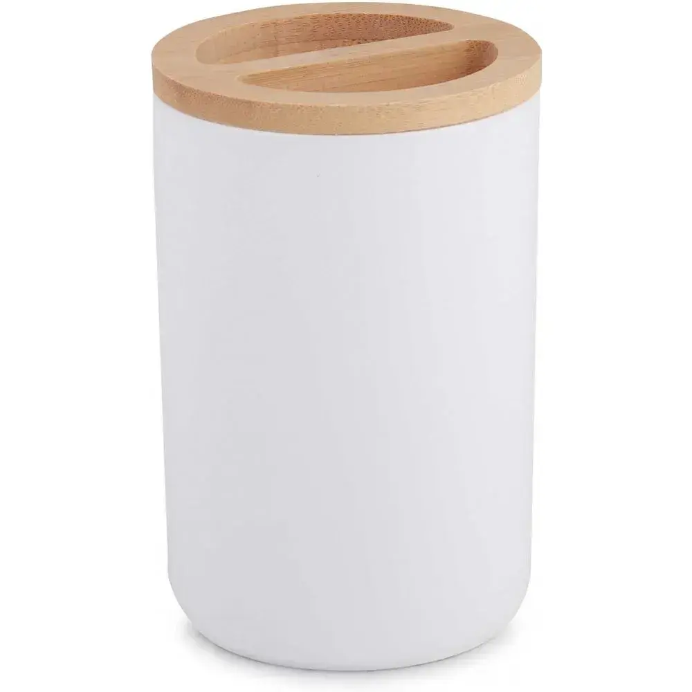 Корпус выполнен из ударопрочного пластика белого цвета, крышка — из шлифованного бамбука. Все элементы набора имеют одинаковые размеры (Ø8 см × высота 20 см) и прошли проверку качества. Совместимы с большинством стандартных зубных щеток и стаканов.