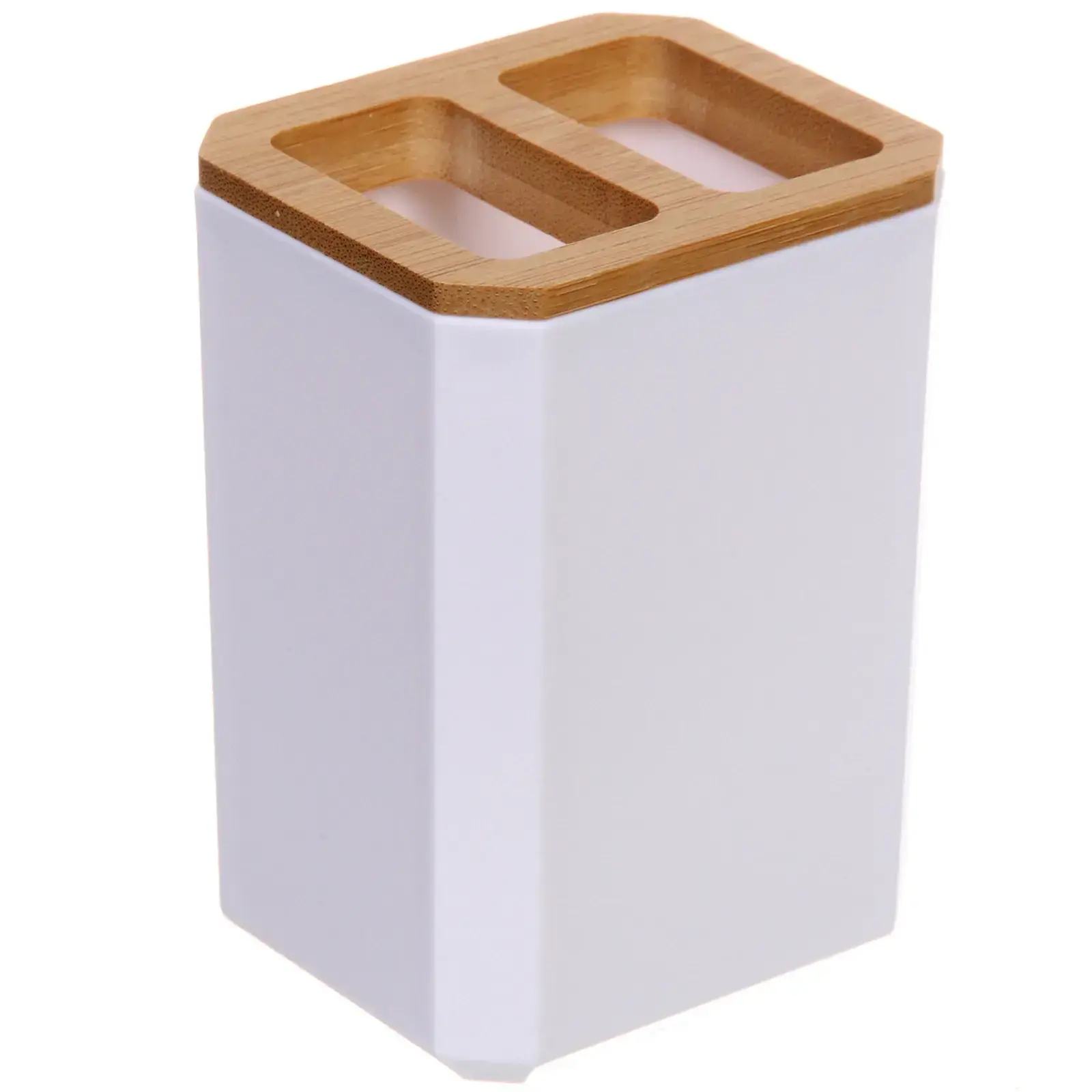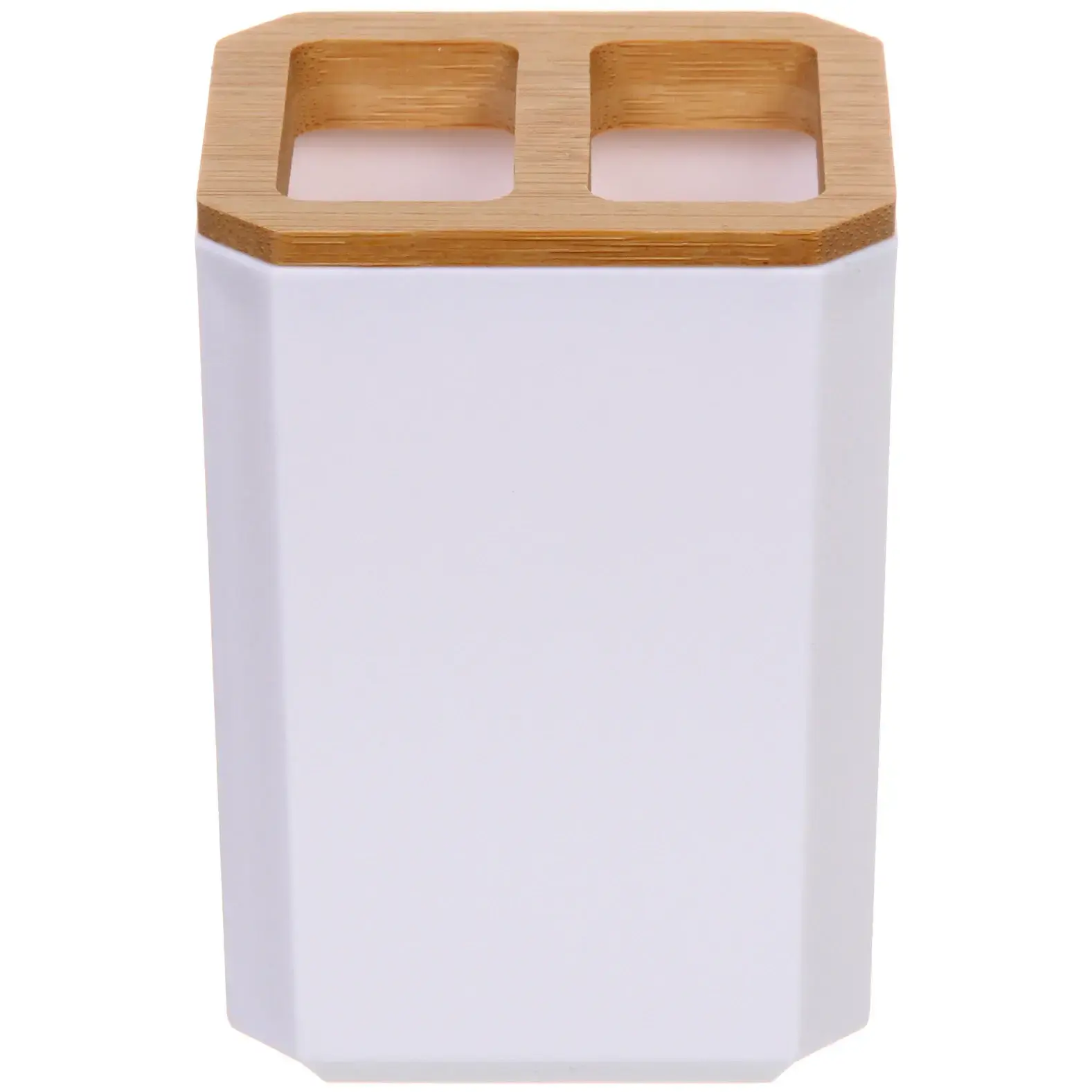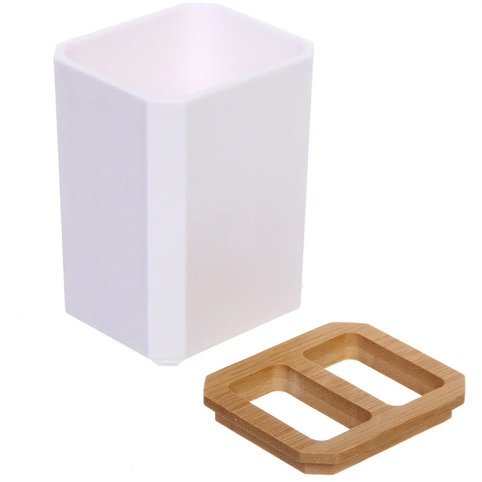 Подставка имеет прямоугольную форму с закруглёнными углами, что делает её безопасной для использования. Белый цвет основного корпуса и натуральный оттенок бамбука создают гармоничное сочетание, которое украсит любой интерьер. Размеры подставки идеально подходят для размещения на столешнице или раковине, а её лёгкий вес позволяет легко перемещать её при необходимости.
