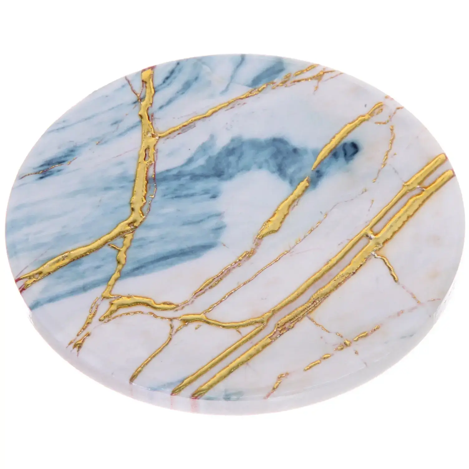 Подставка керамическая 10 см «STONE» голубая — это идеальный аксессуар для вашей кухни, который сочетает в себе функциональность и стиль. Она не только защищает ваши поверхности от высоких температур, но и добавляет изысканности в интерьер. Благодаря своему элегантному дизайну с мраморным узором и золотыми линиями, эта подставка станет настоящим украшением вашего стола.