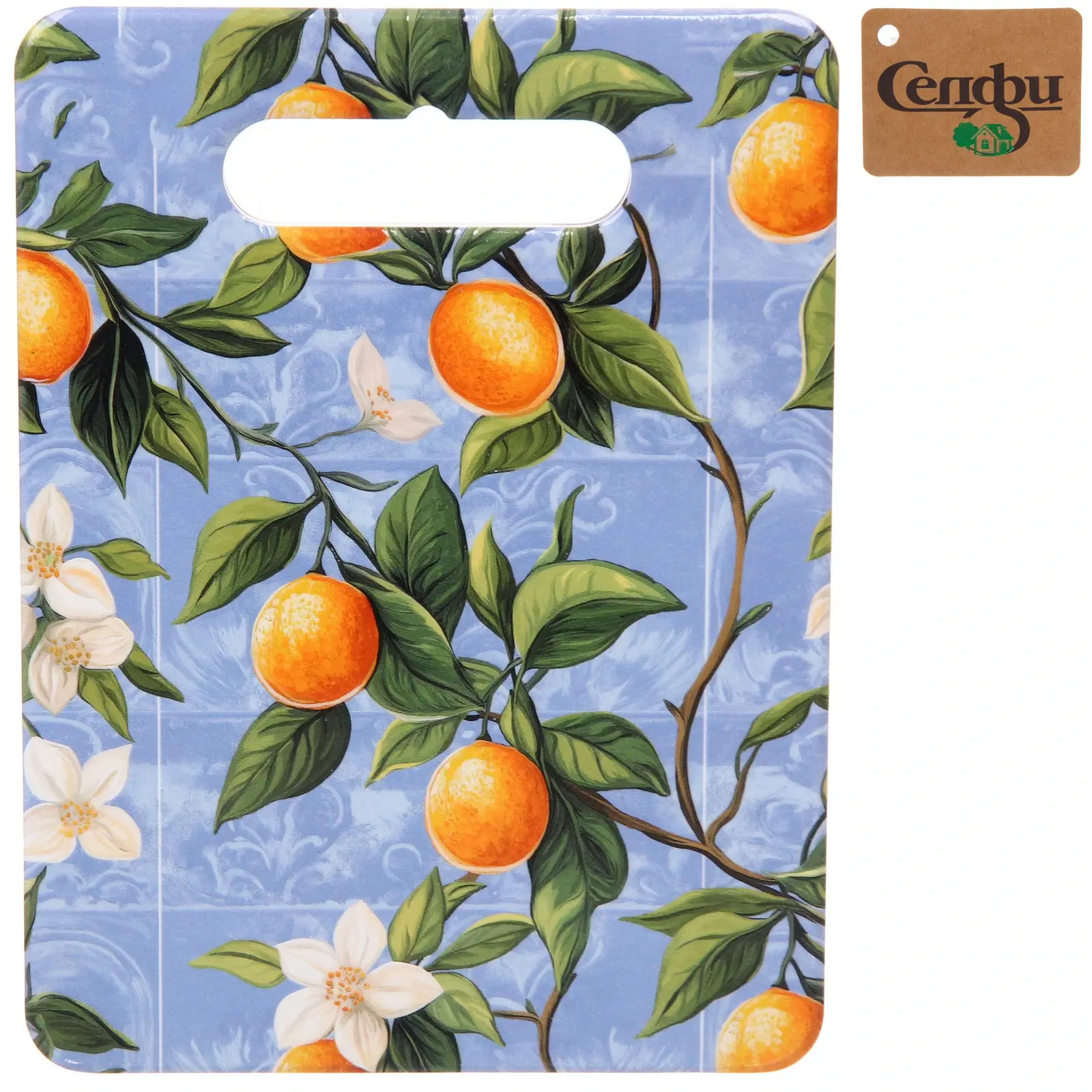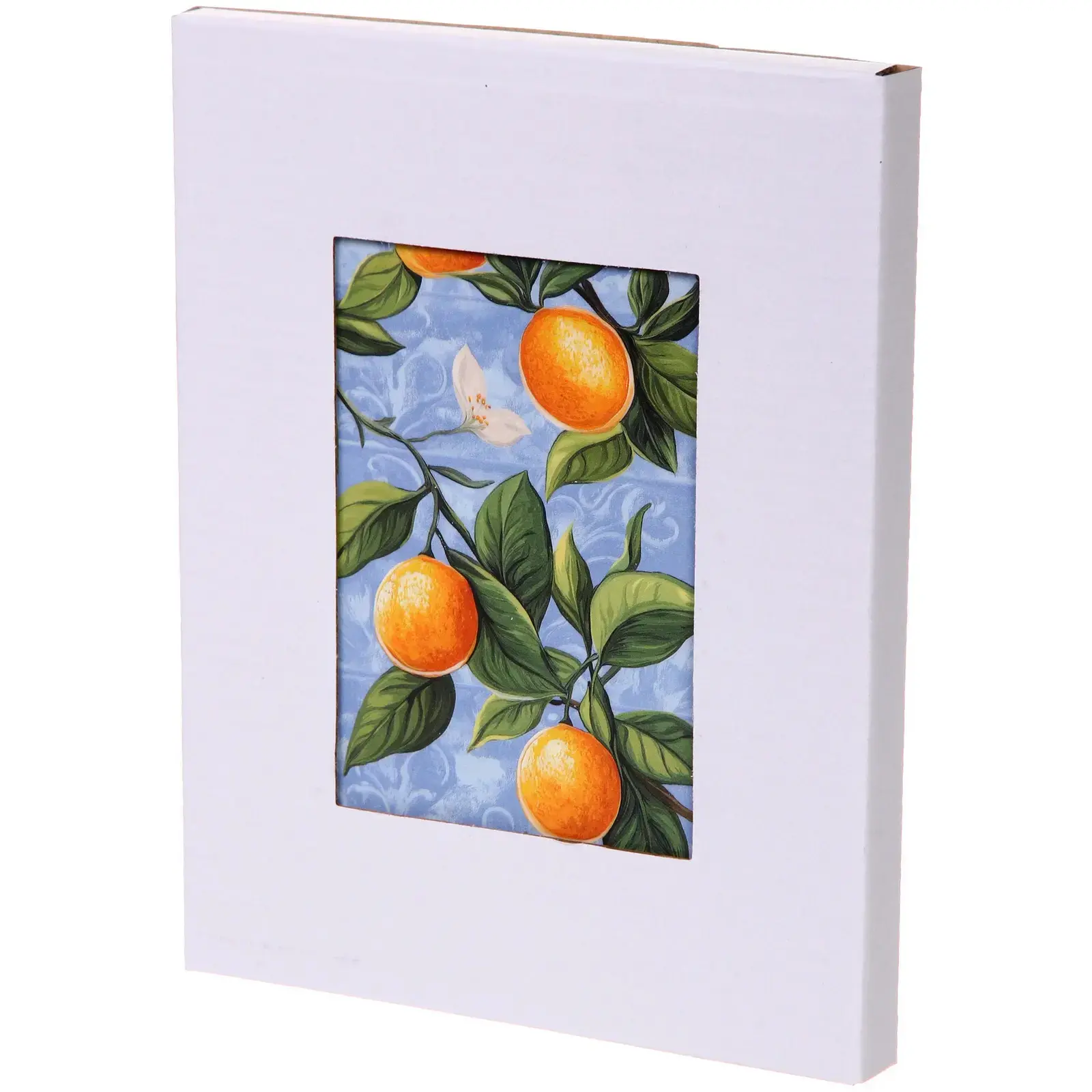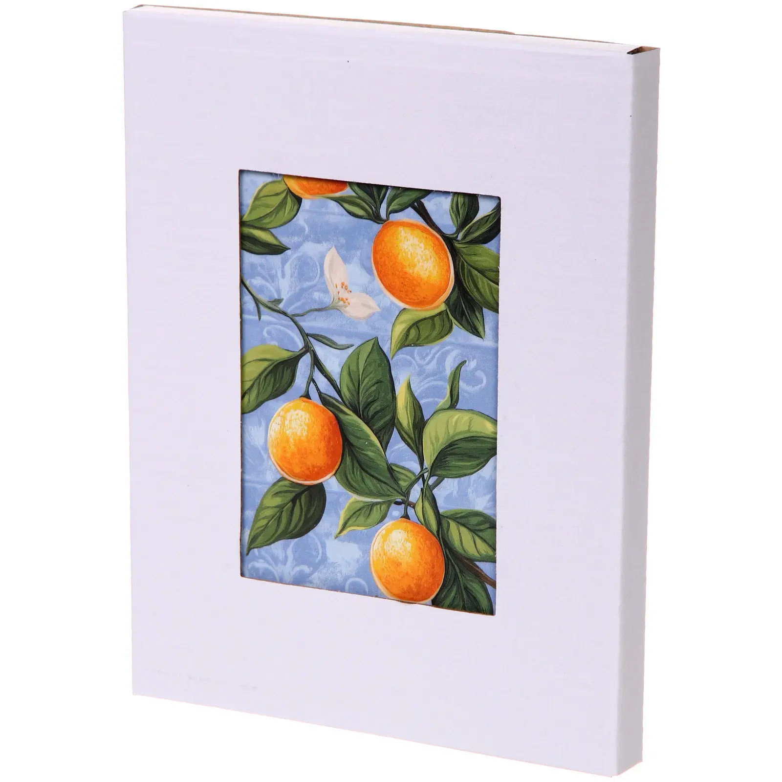 - Декоративный рисунок с ветвями, апельсинами и белыми цветами создает свежий, праздничный акцент на любой кухне — такой дизайн гармонирует как с классическим, так и с современным интерьером.