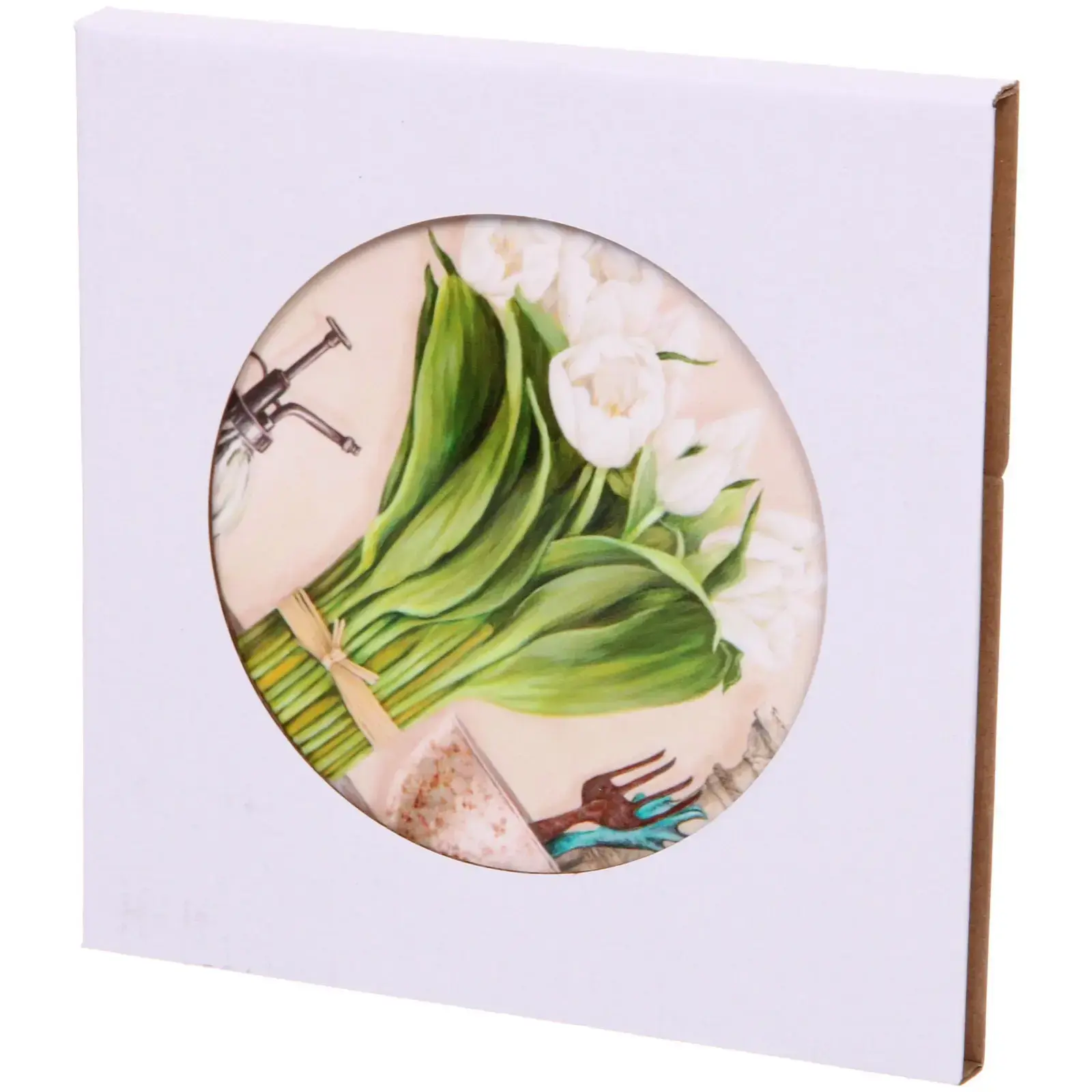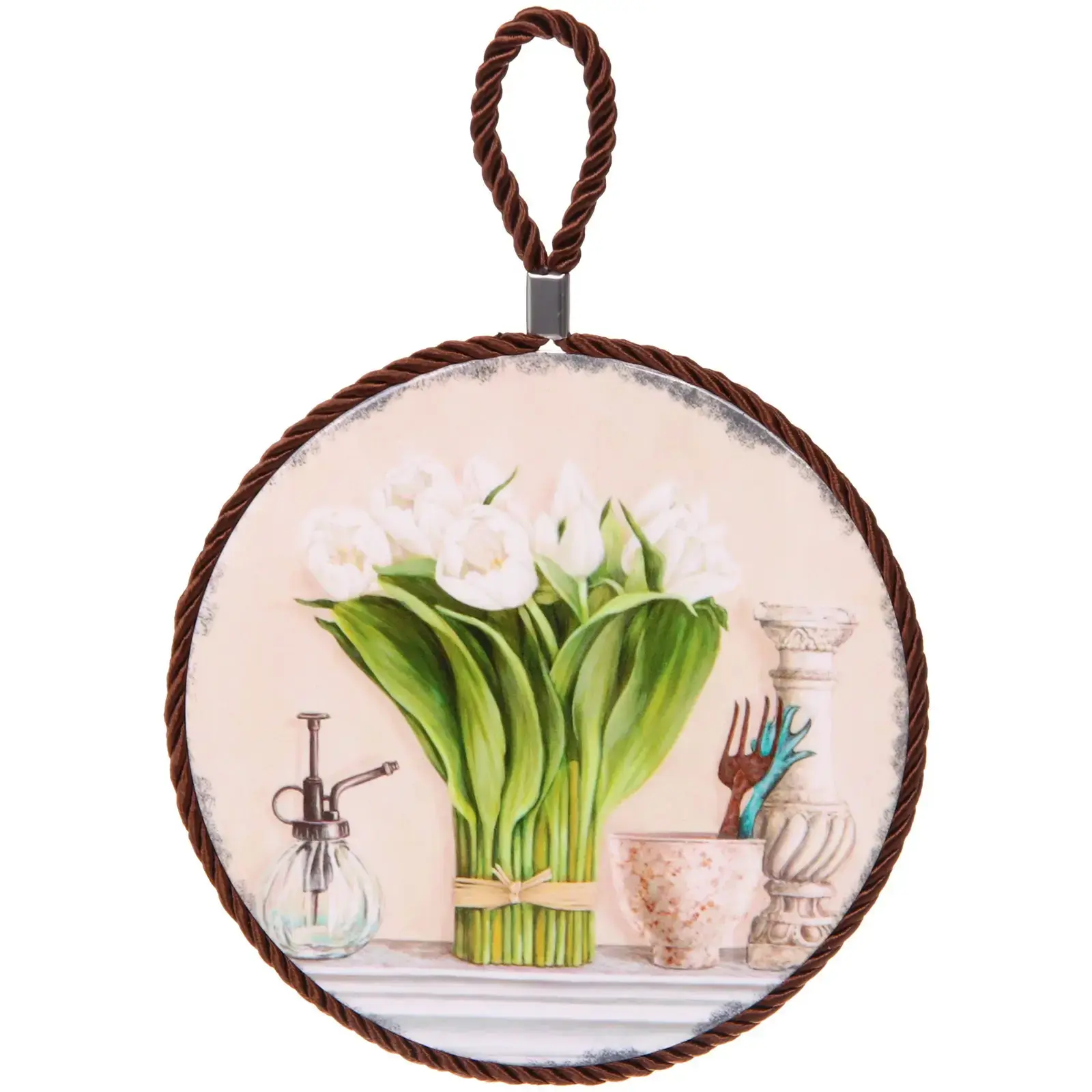 Эта керамическая подставка под горячее не только защитит вашу мебель от высоких температур, но и станет стильным элементом декора. С диаметром 16 см и изысканным дизайном с изображением белых тюльпанов, она добавит уют и элегантность в любое помещение. Подставка идеально подходит для сервировки горячих блюд, а также может использоваться как декоративный элемент на столе.