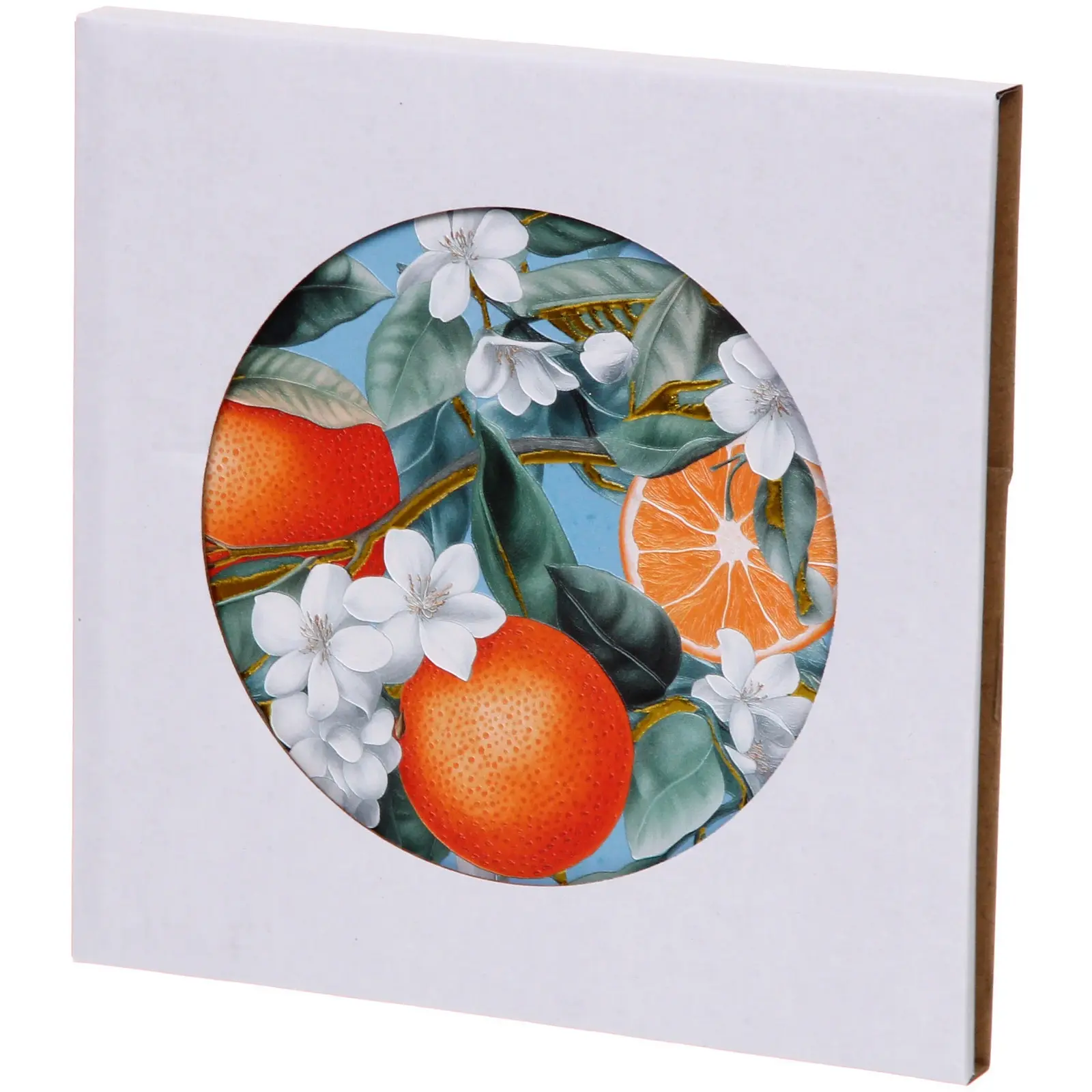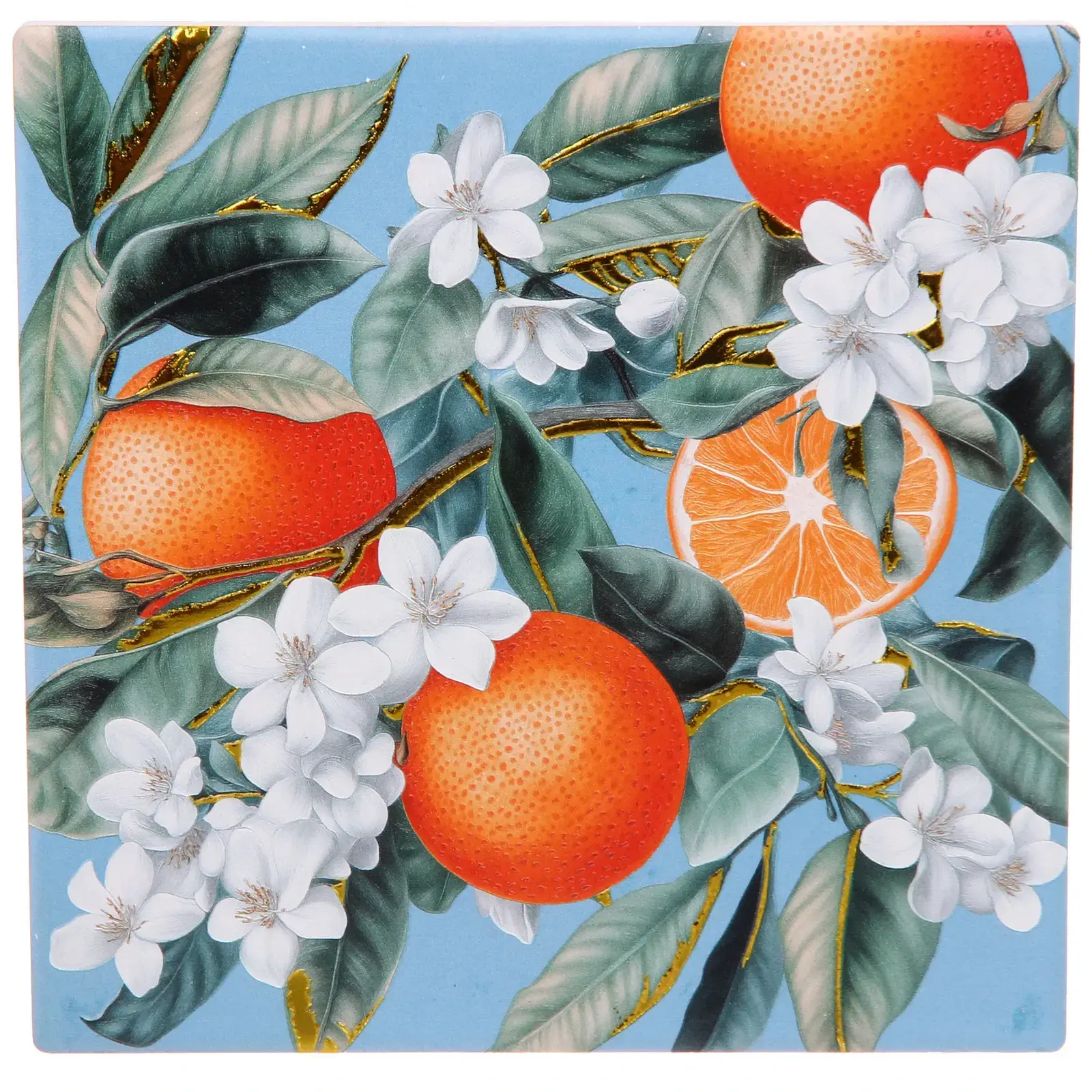 Эта изящная подставка под горячее размером 16х16 см станет не только функциональным элементом вашей кухни, но и ярким акцентом в интерьере. Яркий рисунок с ветвями апельсина, белыми цветами и золотистыми деталями создаёт атмосферу тепла и уюта, а насыщенные цветовые контрасты делают её декоративным украшением стола.