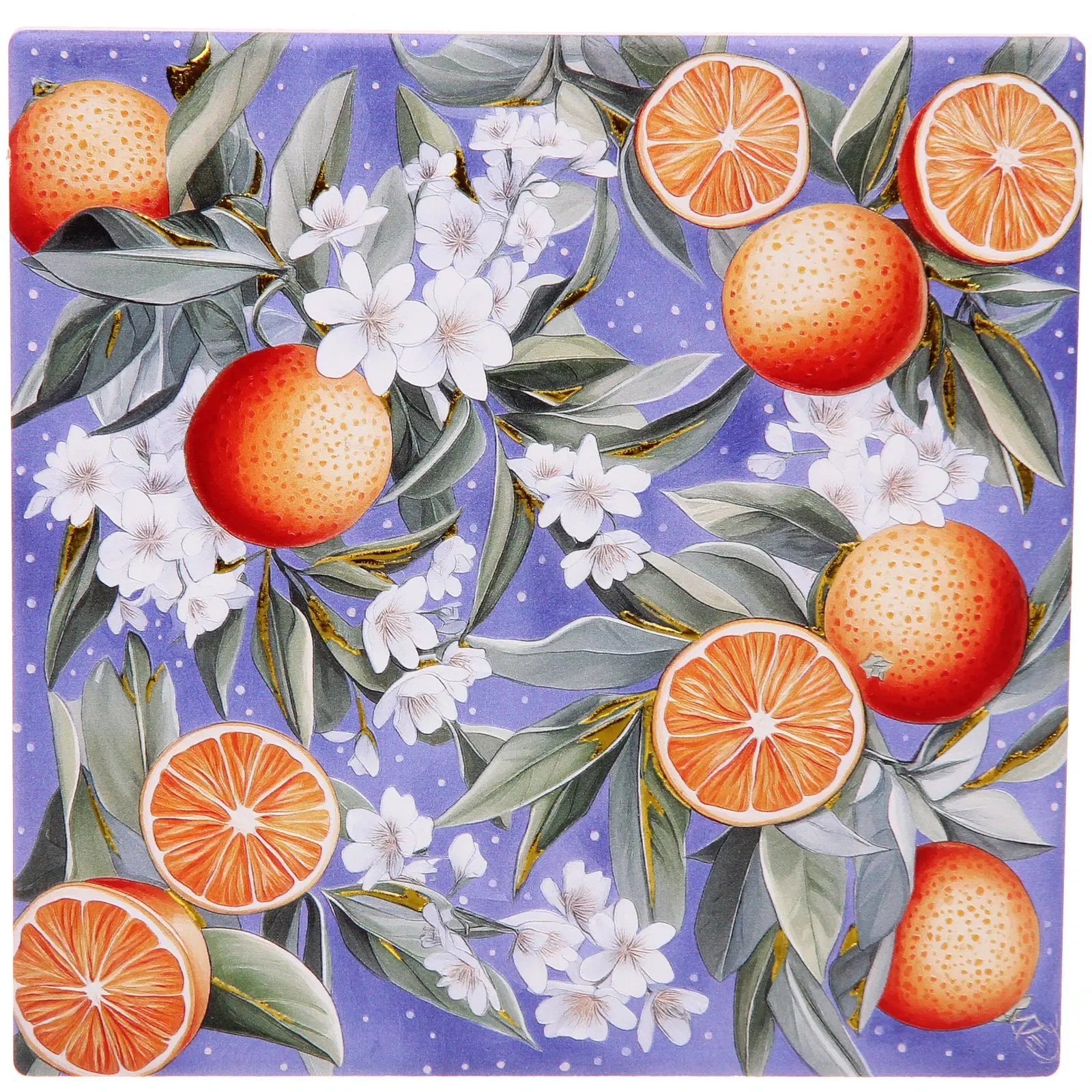 - Декоративный принт с оранжевыми апельсинами, зелёными листьями и белыми цветами на фиолетовом фоне с точками