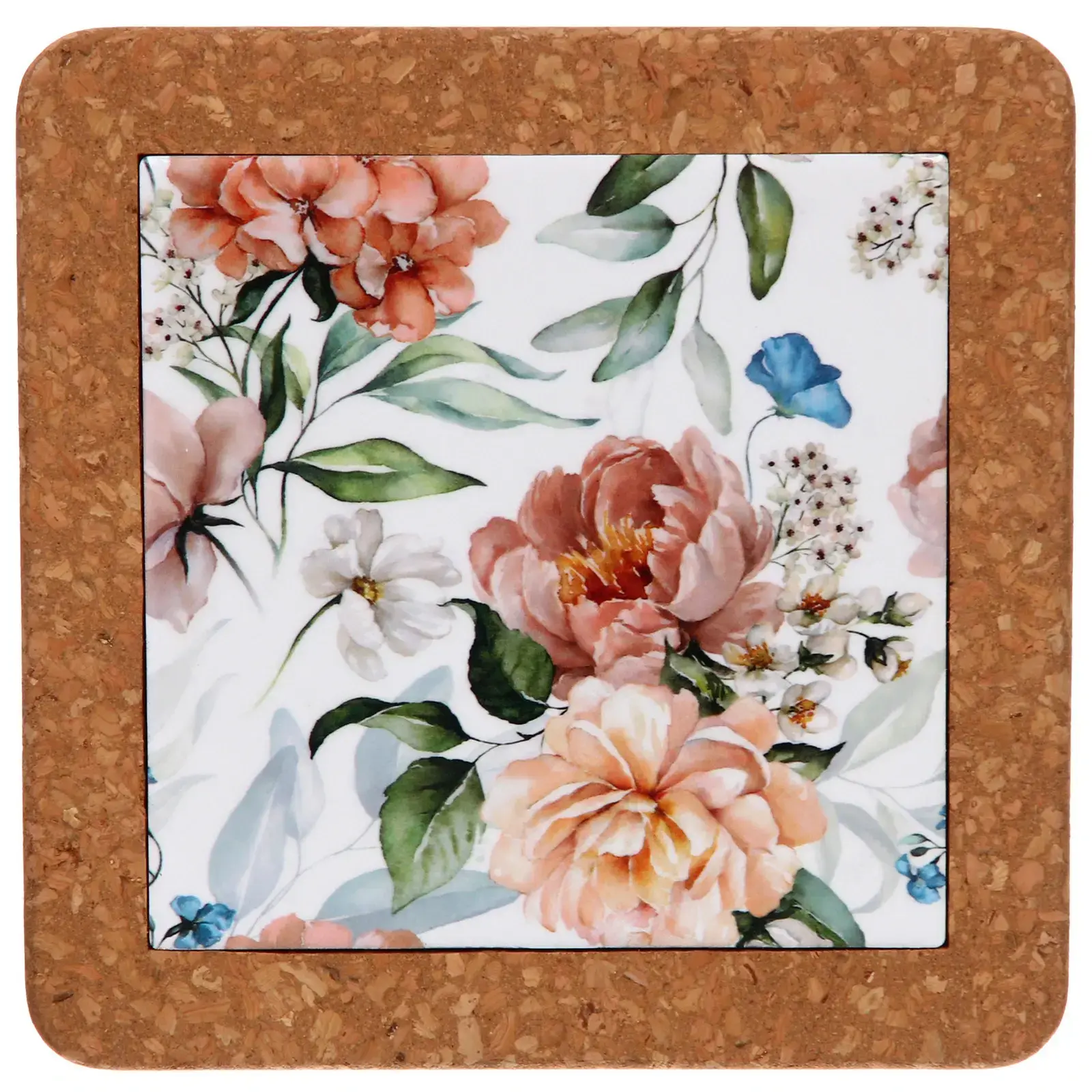Размер изделия — 19х19 см. Материалы: керамика и высококачественная пробка. Цвет — белый, рисунок «Пионы». Подставка прочная и устойчивая, легко очищается влажной губкой. Универсально подходит для дома, дачи или в качестве необычного подарка ценителям уютных решений.