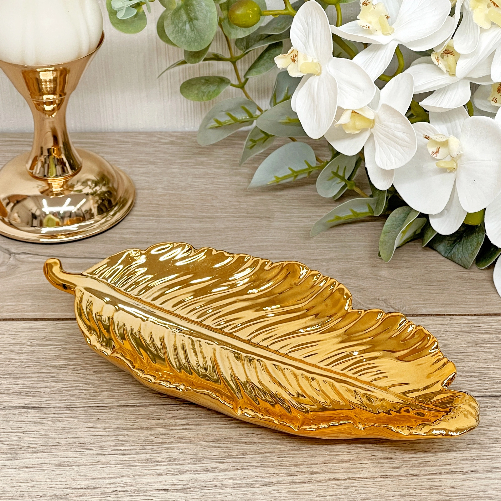 Эта керамическая подставка в виде пера станет элегантным и стильным акцентом в вашем интерьере. Её золотистый глянцевый блеск притягивает взгляд и создаёт атмосферу роскоши и утончённости. Идеальное решение для тех, кто ценит детали и стремится наполнить свой дом особым шармом.