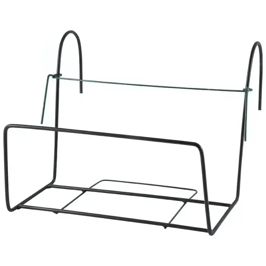 Подставка выполнена из качественного металла черного цвета. Конструкция состоит из прочных прутьев, образующих устойчивую раму. Нижняя полка добавляет функциональности, позволяя хранить дополнительные предметы.