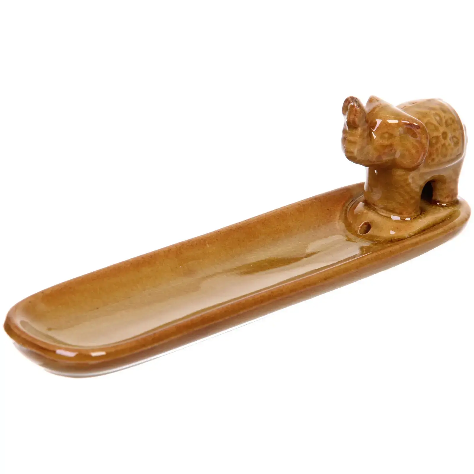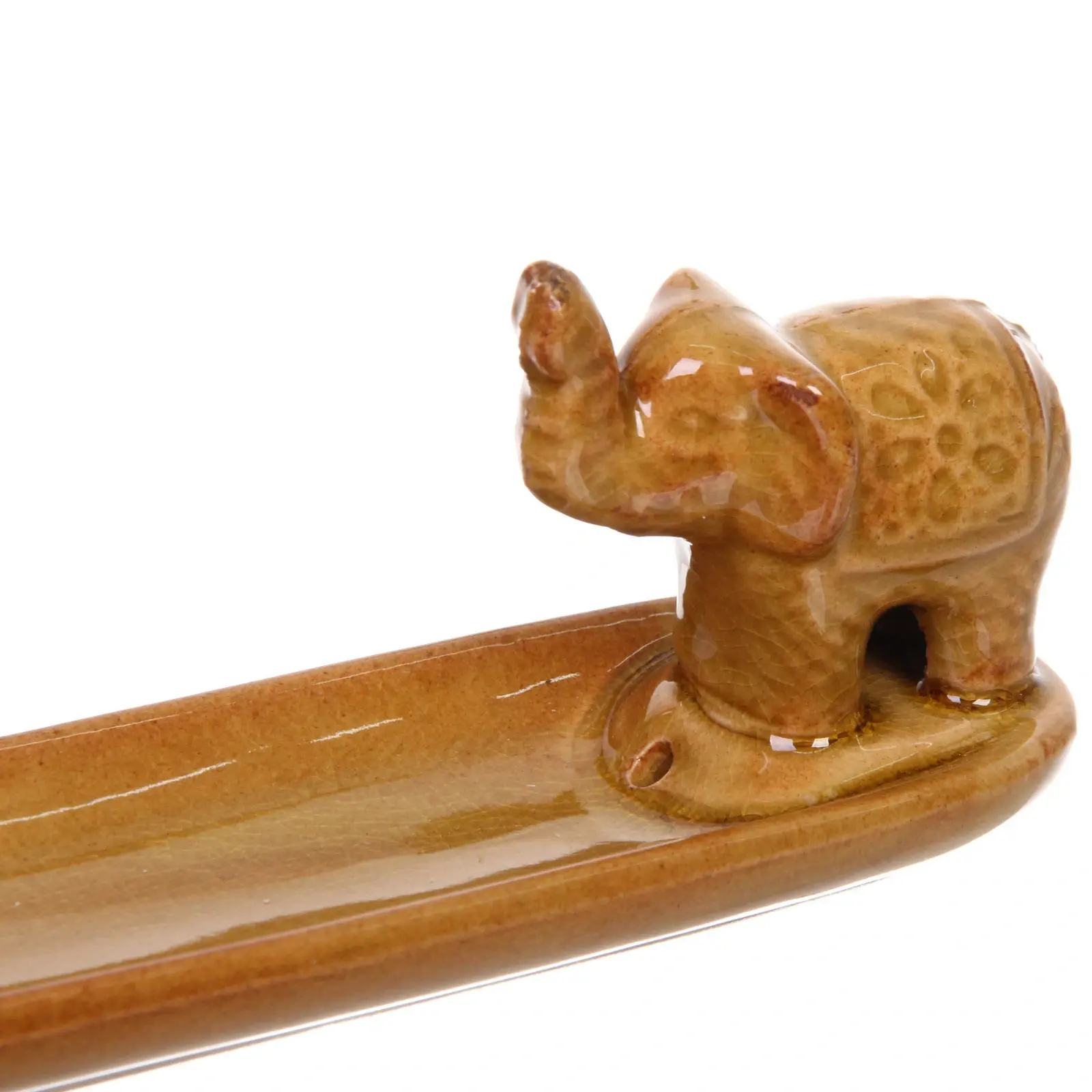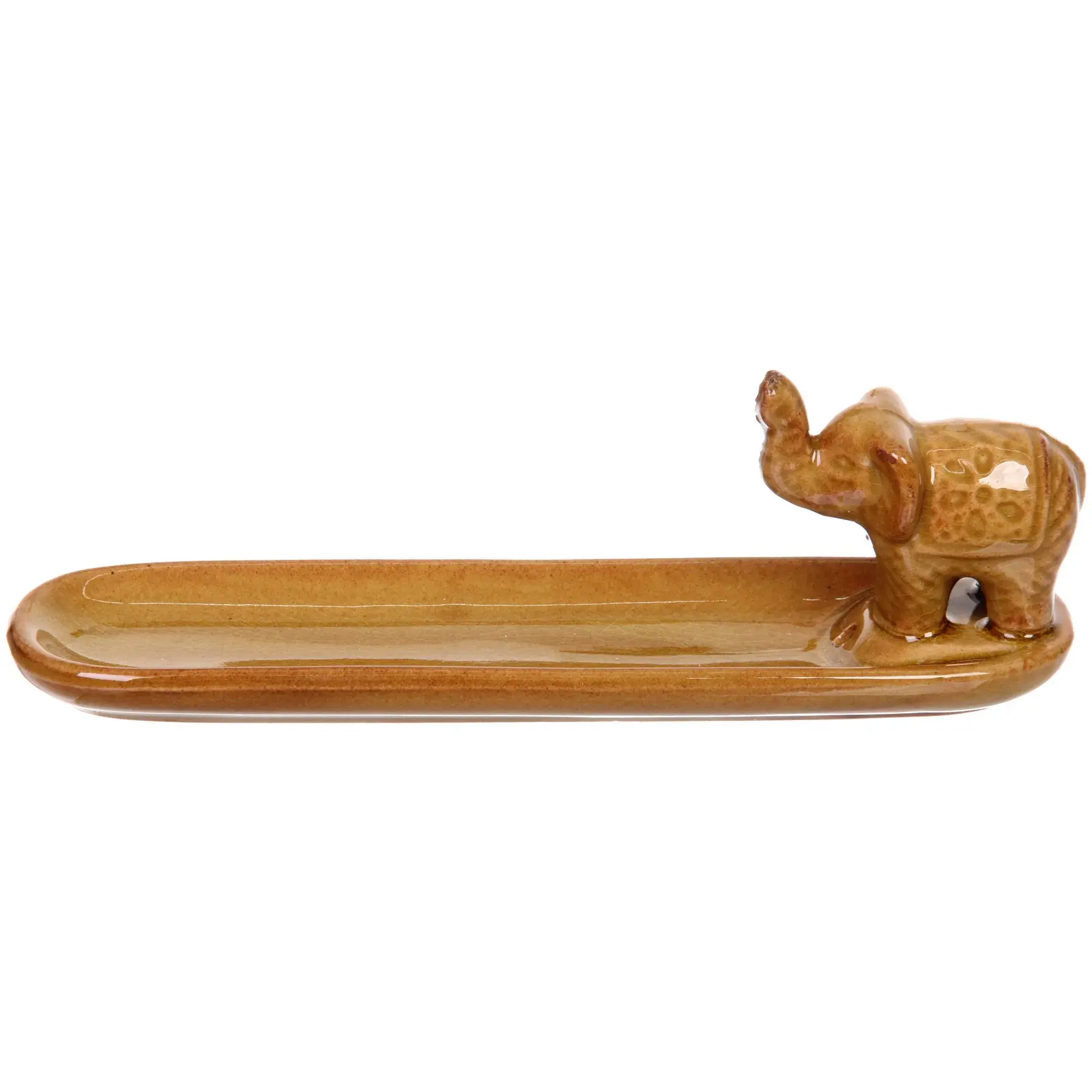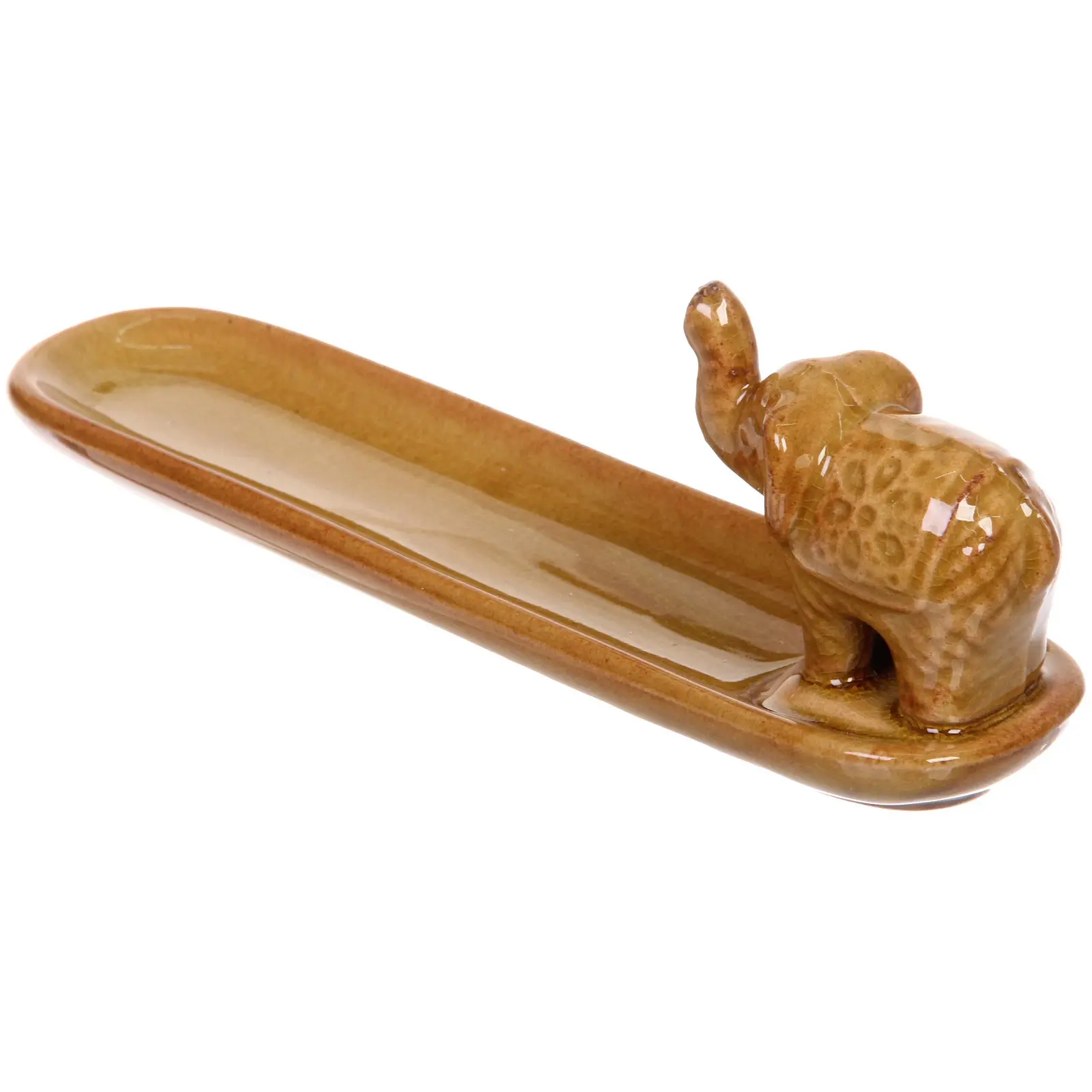 Подставка имеет вытянутую форму с закругленными краями и фигуркой слона на одном конце, что добавляет декоративный шарм. Отверстия в конструкции позволяют легко и безопасно установить благовония, не боясь их опрокинуть. Выполнена из глазурованной керамики, что обеспечивает гладкую поверхность и легкую очистку.