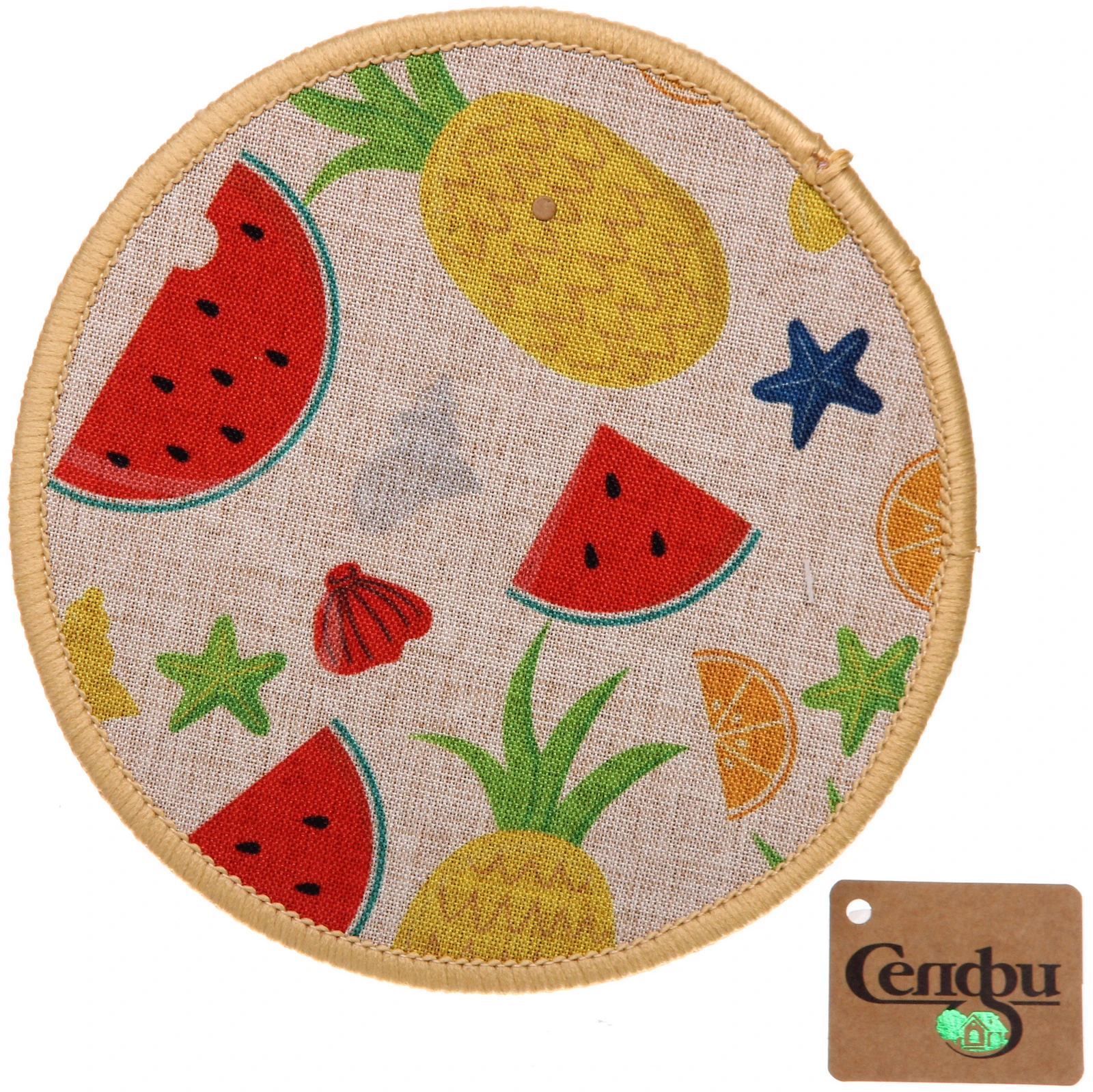 Подставка имеет классическую круглую форму диаметром 18 сантиметров. Лицевая сторона выполнена из полиэстера с нанесённым ярким фруктовым принтом. Основа — из практичного материала ПВХ. Край аккуратно окантован светлой тканевой тесьмой. Обратная сторона — тёмная, с фактурной поверхностью, которая предотвращает скольжение по столу.