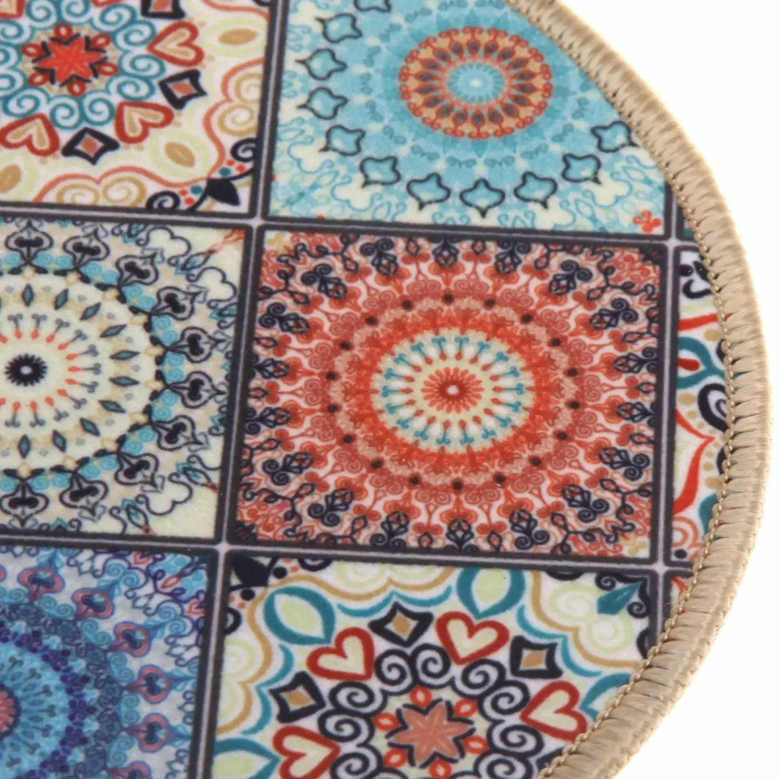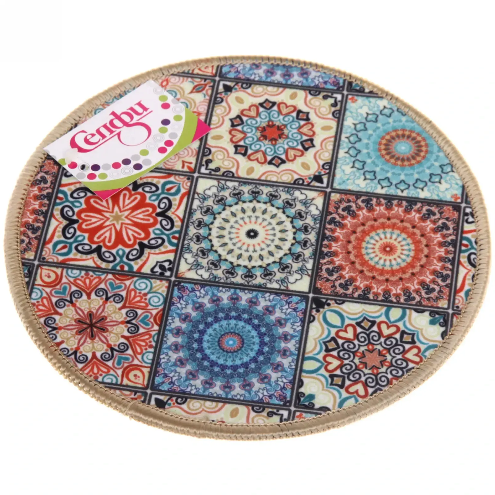 Размер подставки составляет 20 см в диаметре, что позволяет использовать её для различных видов посуды. Яркие цвета и узоры, вдохновленные восточной мозаикой, делают её не только функциональной, но и эстетически привлекательной. Обрамление из текстильного материала добавляет дополнительный элемент дизайна и защищает края подставки.