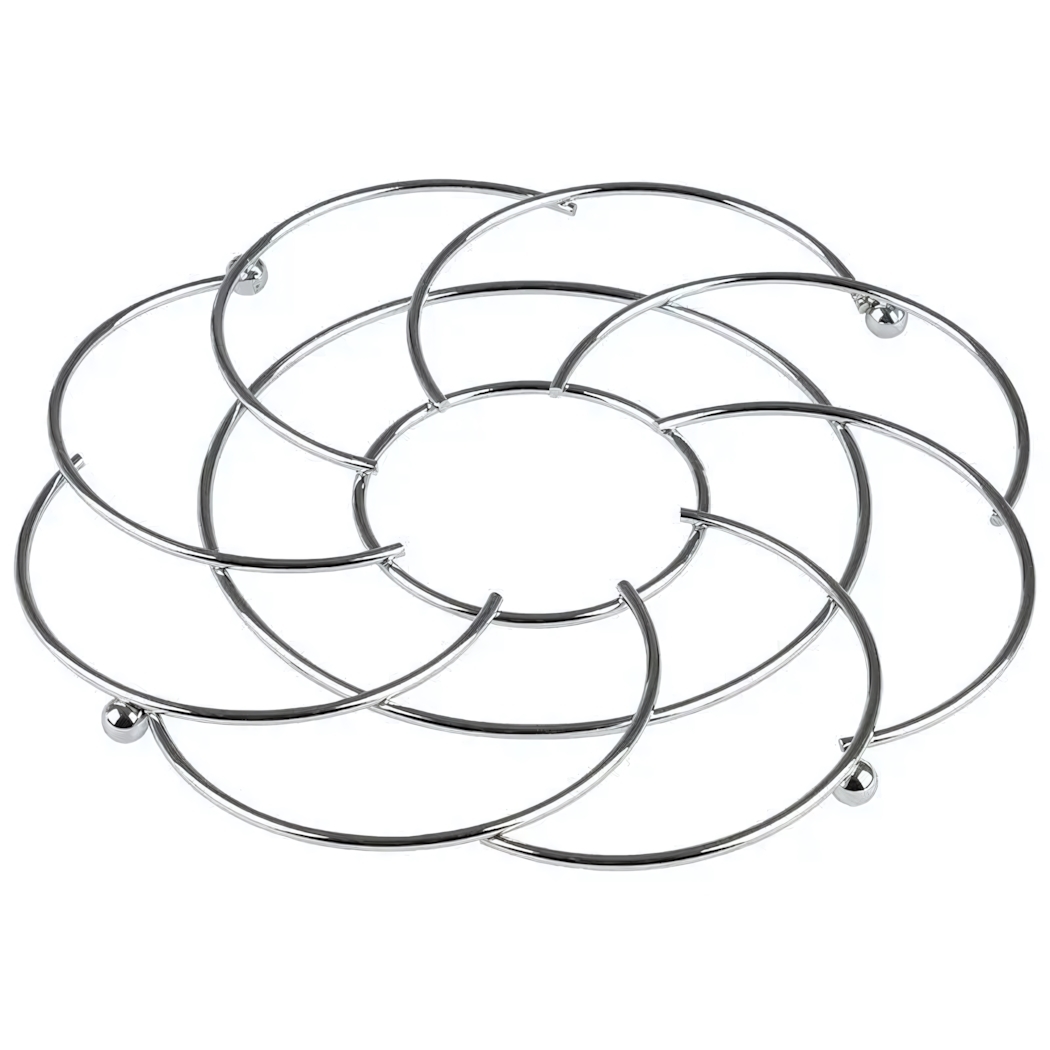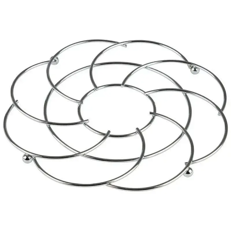 Изделие изготовлено из качественного хромированного металла, который не деформируется и сохраняет презентабельный внешний вид долгие годы. Тонкие прутья создают воздушную конструкцию, а центральный круг надежно фиксирует горячую посуду.