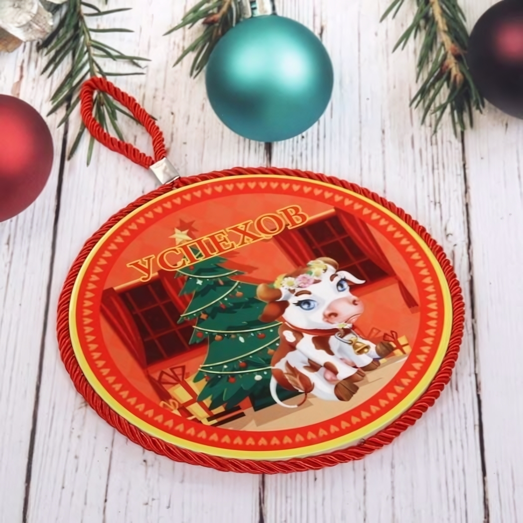 Подставка под горячее, керамическая, 16 см, новогодний дизайн «бычок игнат у ёлки», оранжевый фон, красная окантовка