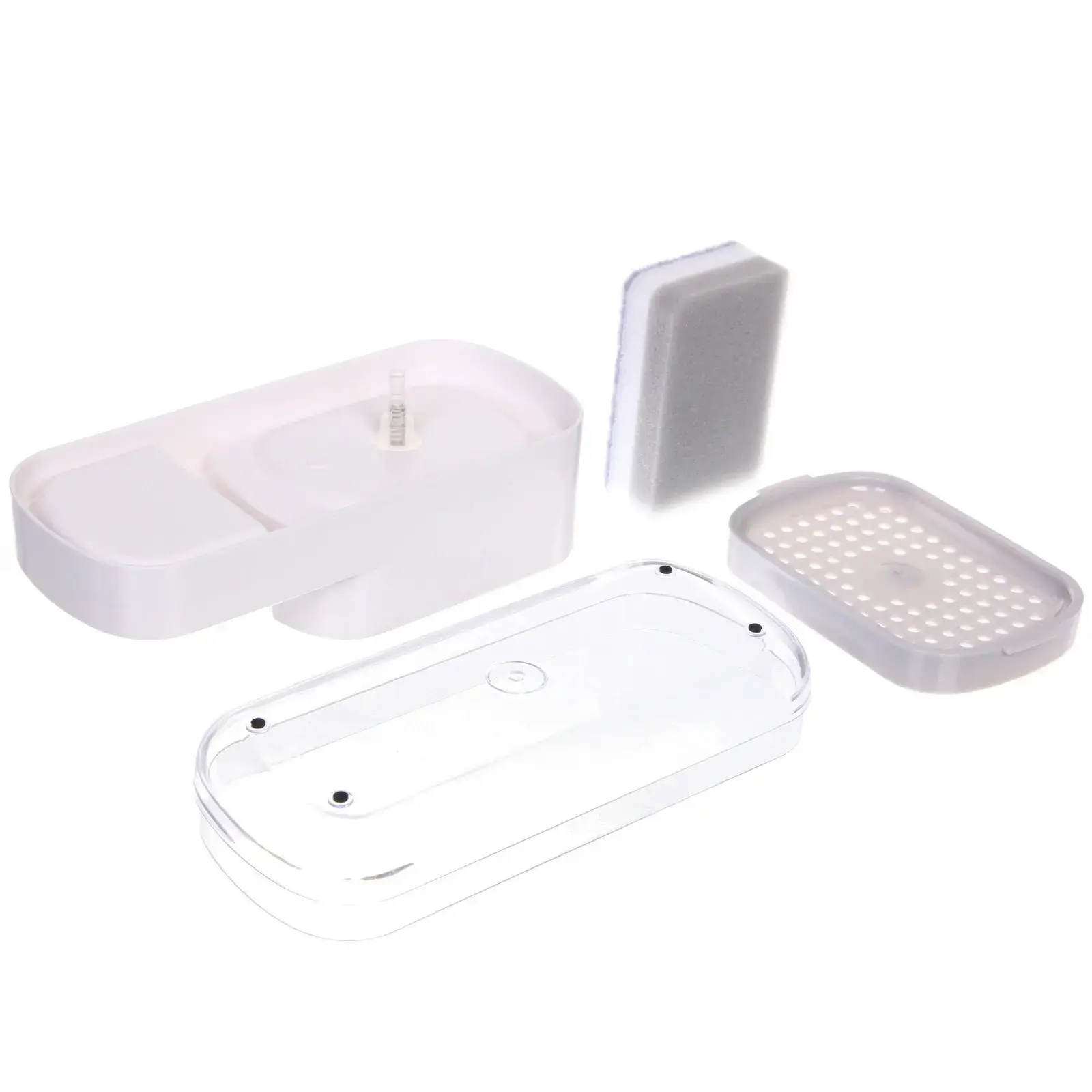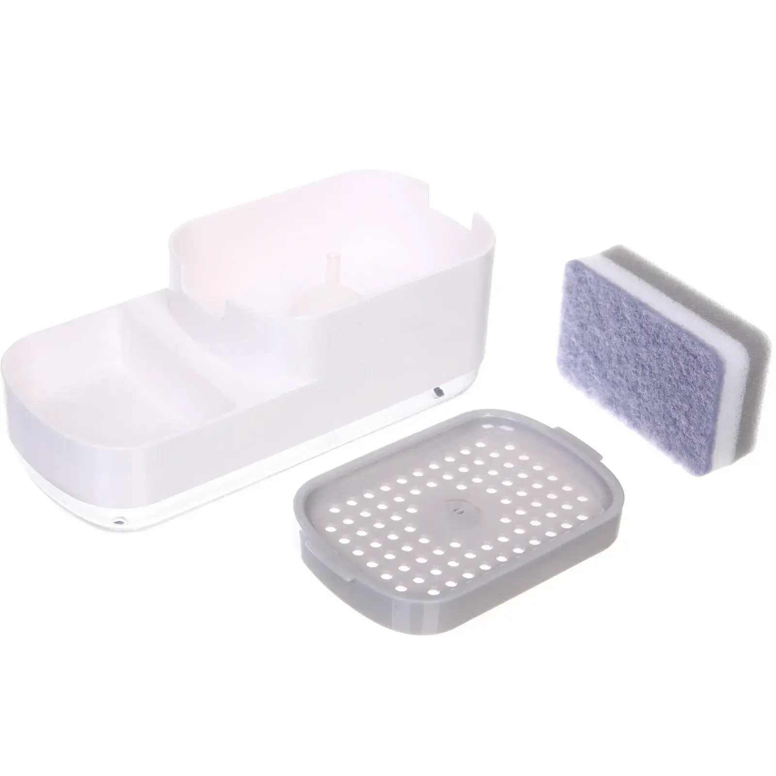 Размеры подставки составляют 22,9х10,8х8,5 см, что делает её компактной и удобной для размещения на столешнице. Белый цвет и прозрачные элементы придают ей современный вид, а также позволяют легко следить за уровнем жидкости внутри. Подставка под губку с дозатором — это не просто аксессуар, а необходимый элемент для каждой хозяйки, который сделает процесс уборки более эффективным и приятным.