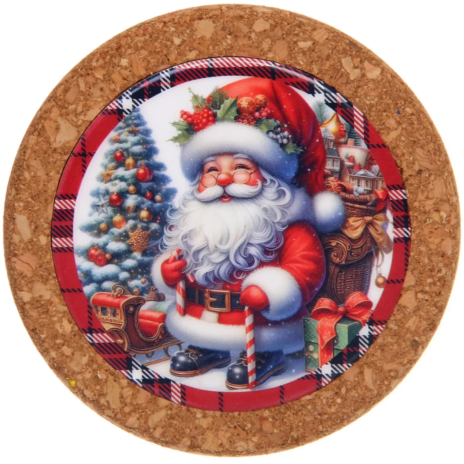 Керамическая подставка с праздничным дизайном создаёт уютную атмосферу и защищает поверхности от горячих кружек. Пробковый кант обеспечивает дополнительную теплоизоляцию, сохраняя мебель в идеальном состоянии.