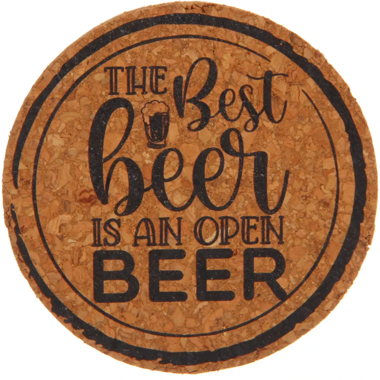 Круглая форма диаметром 9 см оптимальна для большинства кружек и бокалов. Натуральная пробковая структура с рельефной текстурой обеспечивает дополнительное сцепление с посудой. Черный принт с тематической надписью «THE BEST beer IS AN OPEN BEER» и изображением пивного бокала сохраняет четкость даже при частом использовании.