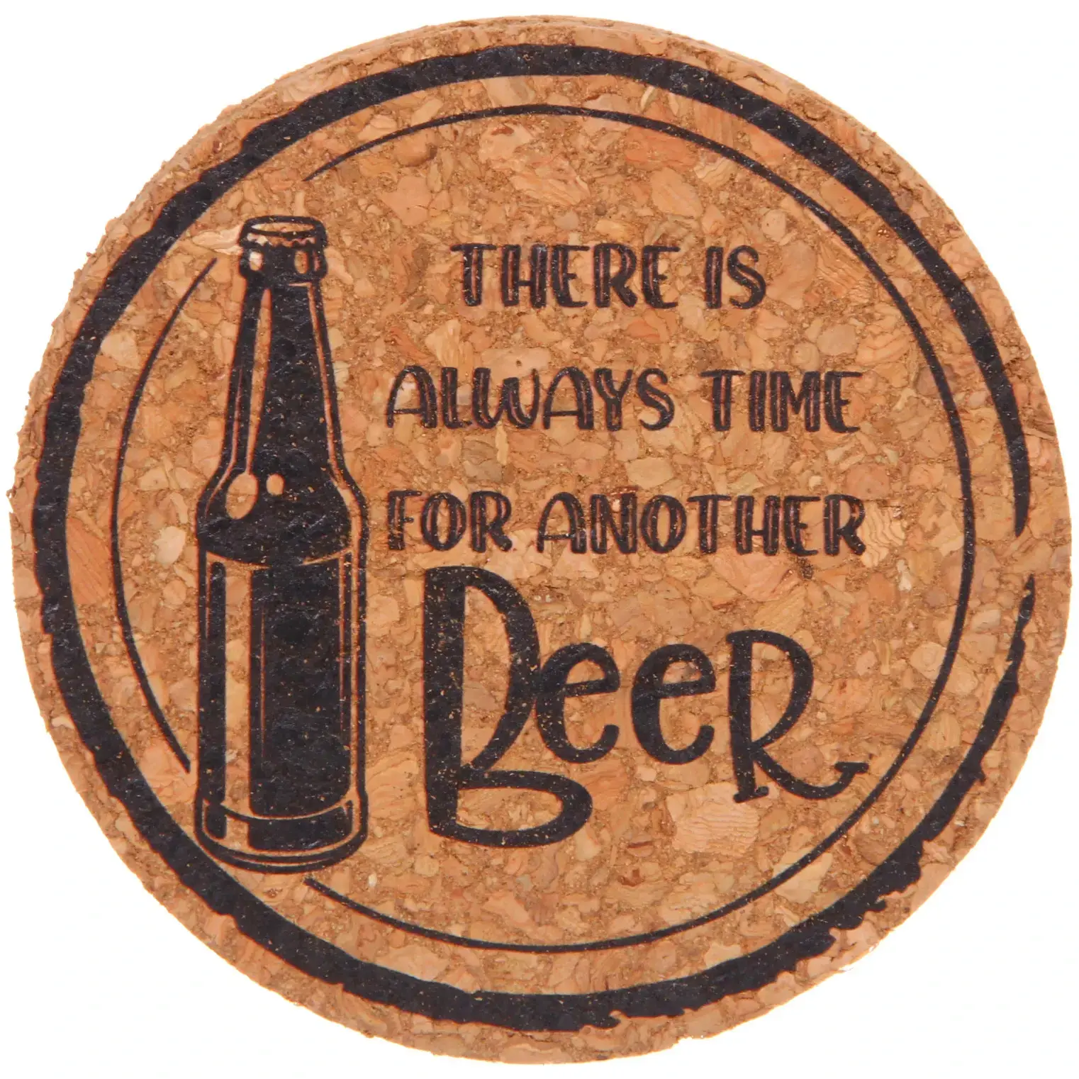 Стильная круговая надпись «THERE IS ALWAYS TIME FOR ANOTHER Beer» с графическим изображением бутылки создаёт атмосферу непринуждённого отдыха. Натуральная фактура пробки добавляет изделию природный шарм, гармонично сочетаясь с любым стилем кухни.