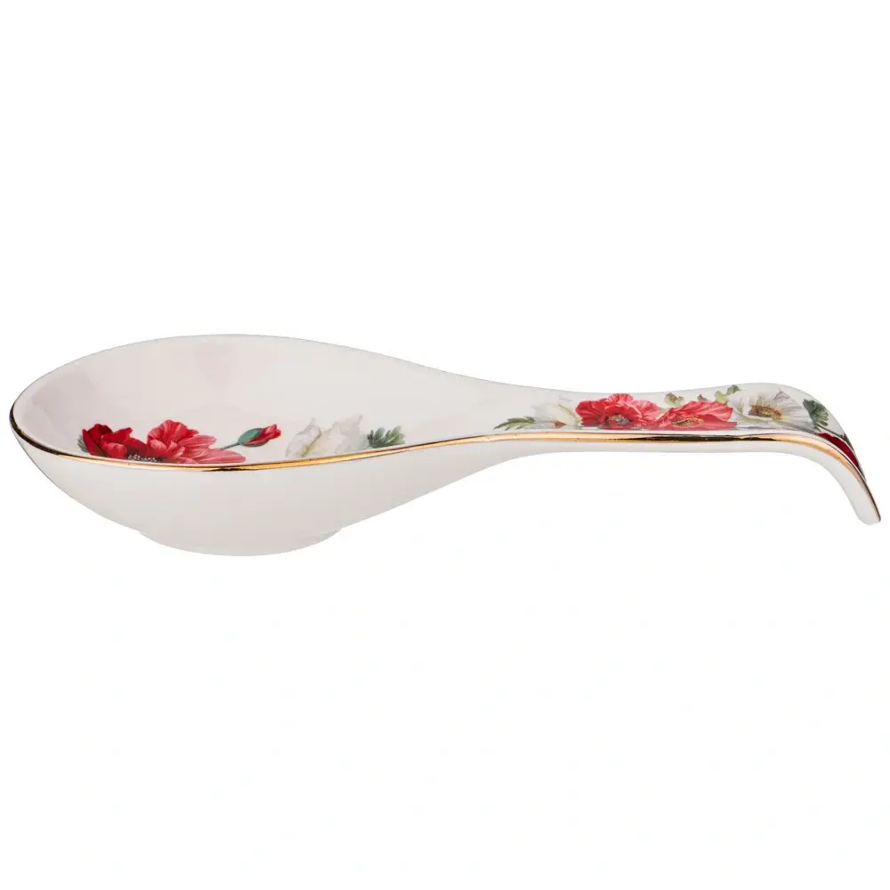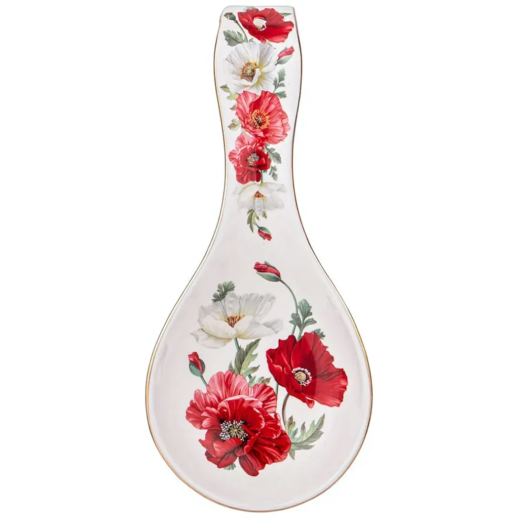 Подставка под ложку 23 см из коллекции «Маки» — это не только функциональный аксессуар для вашей кухни, но и стильный элемент декора. Яркий цветочный дизайн с изображением красных и белых маков, дополненный золотой обводкой, придаёт изделию изысканный вид. Эта подставка станет отличным подарком для любителей кулинарии и ценителей красивой посуды.