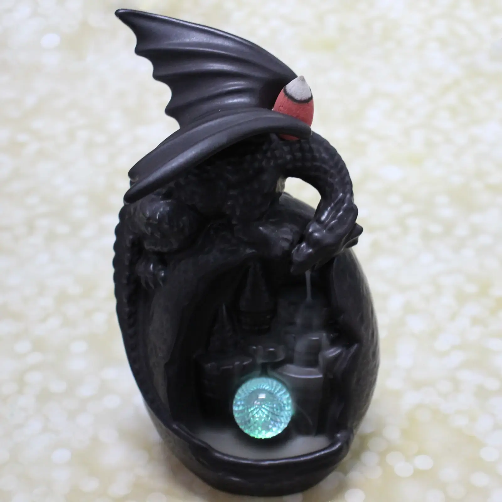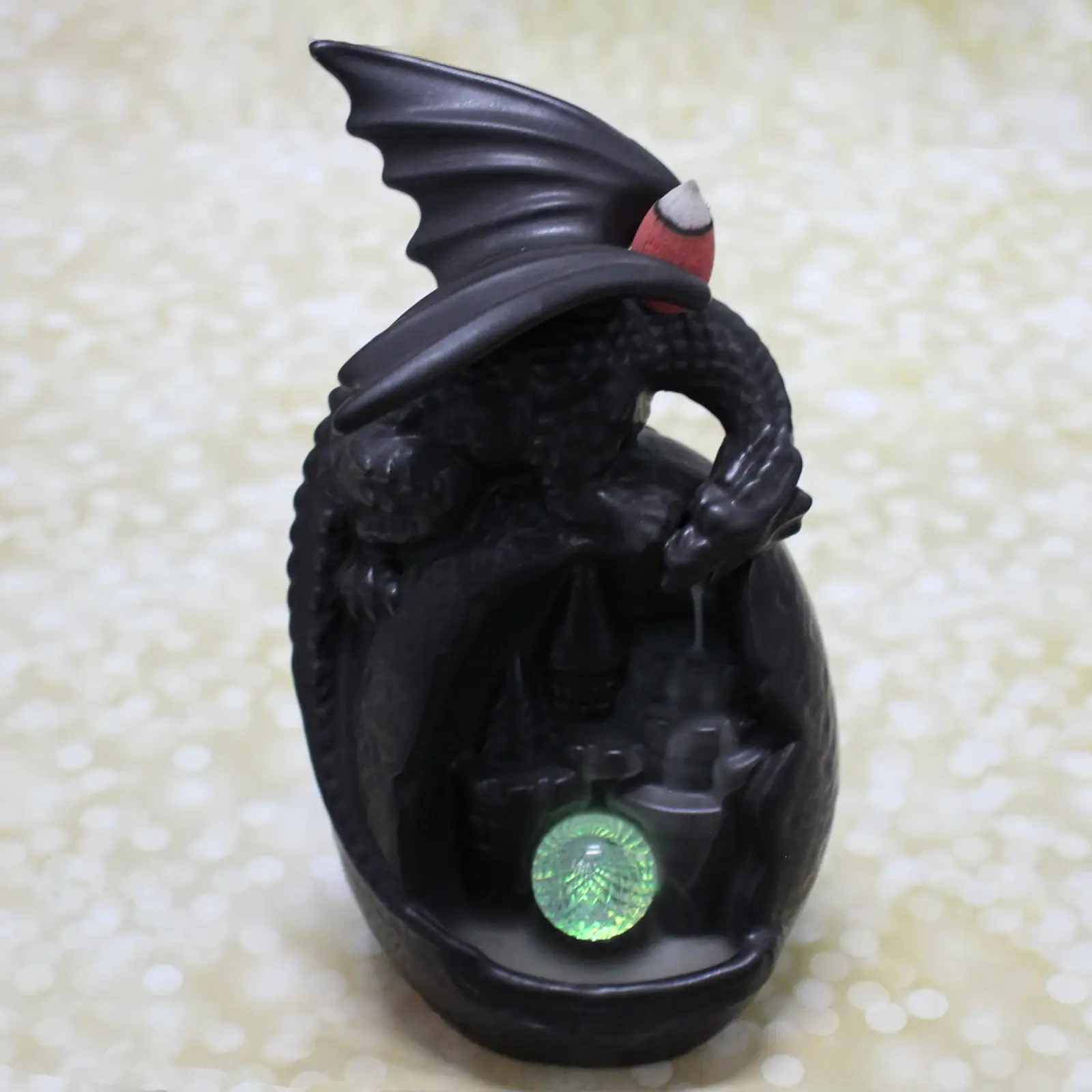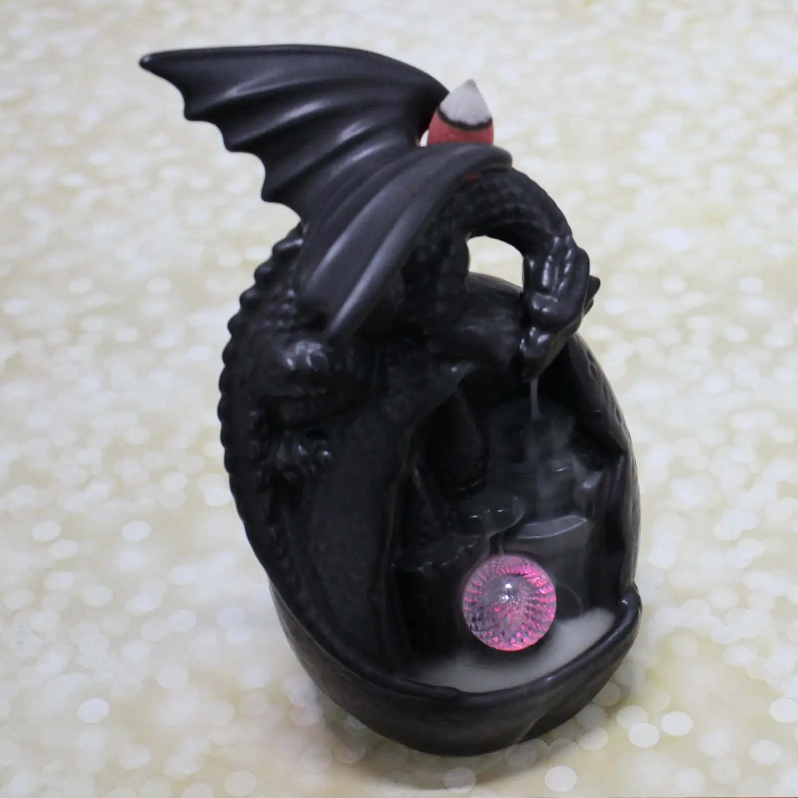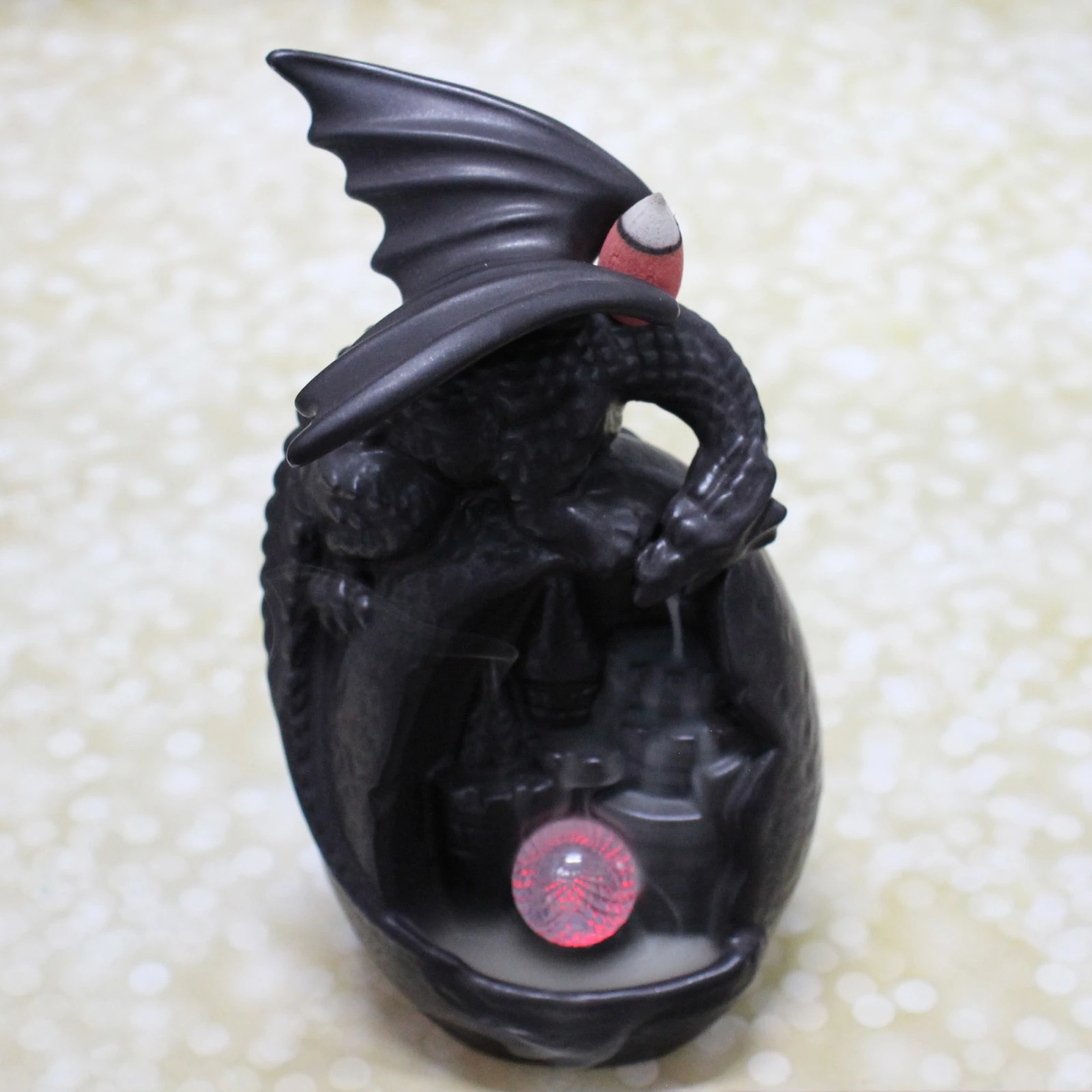 Преимущества: эстетичный дизайн с фигуркой дракона и подсветкой создает особую атмосферу; яркое исполнение подходит в любой интерьер; долговечный материал обеспечивает надежность; компактный размер — 10х9х19 см — легко размещается в любом месте; универсальный стиль гармонично сочетается с классикой и современностью.