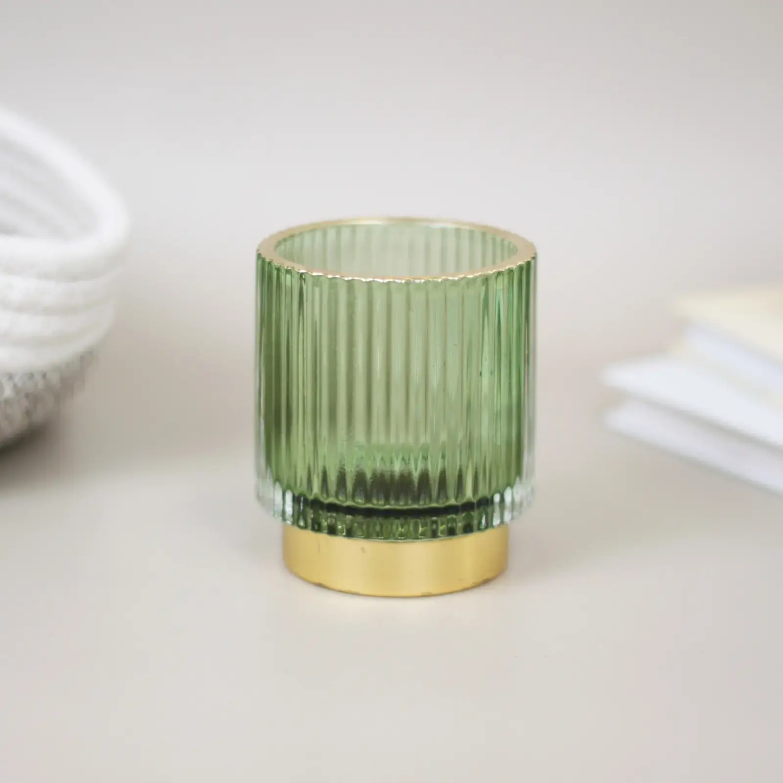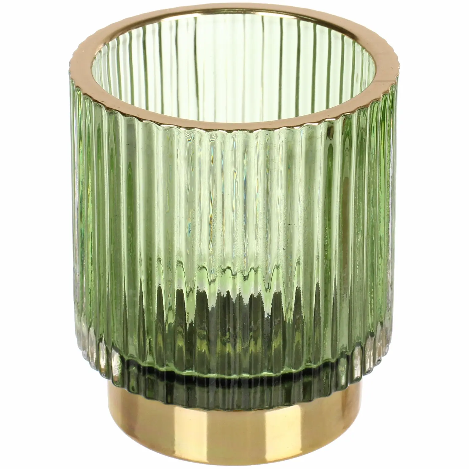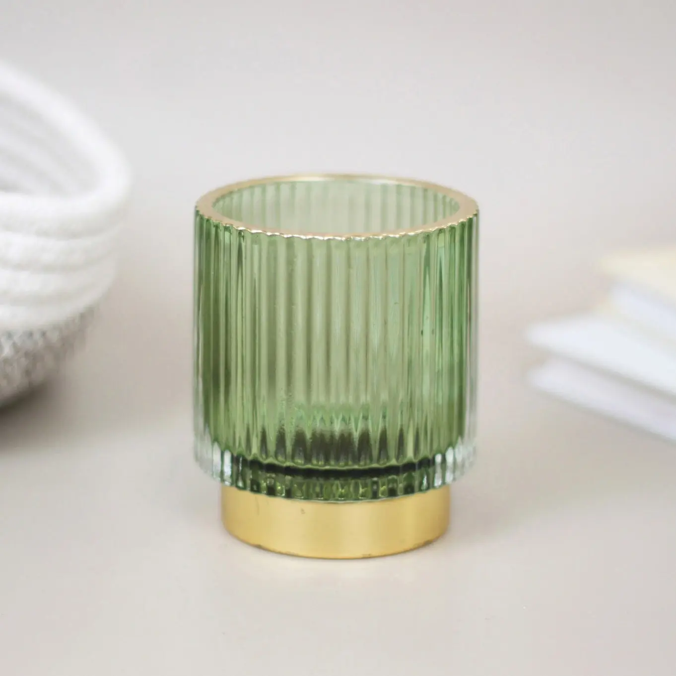 Высота изделия — 7 см, диаметр — 8 см. Материал: прочное стекло с вертикальной рифлёной текстурой, металлическое золотистое основание устойчивое к коррозии. Благодаря универсальному дизайну подсвечник легко сочетается с другими элементами декора и может стать гармоничным акцентом в интерьере.