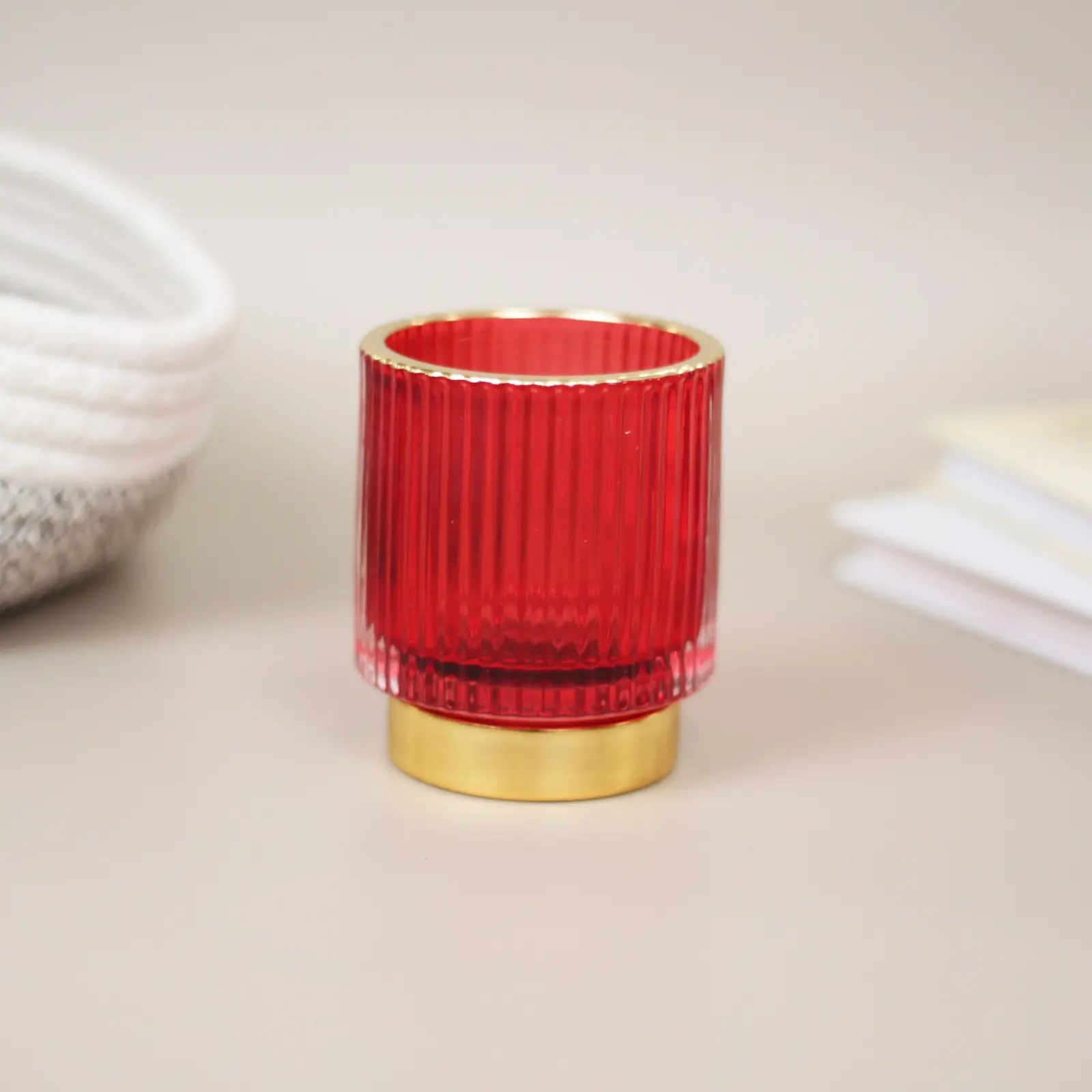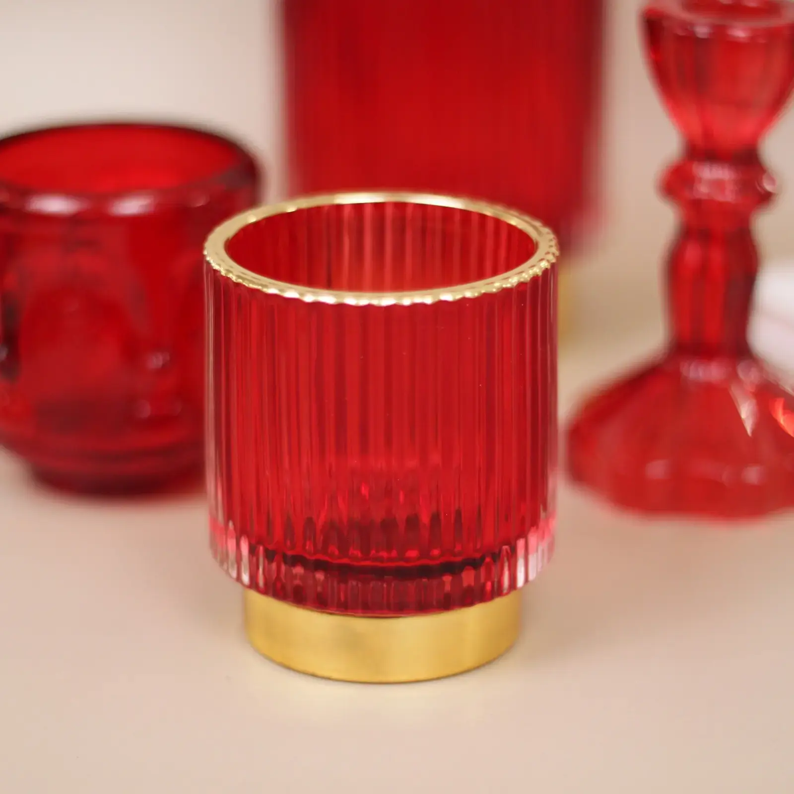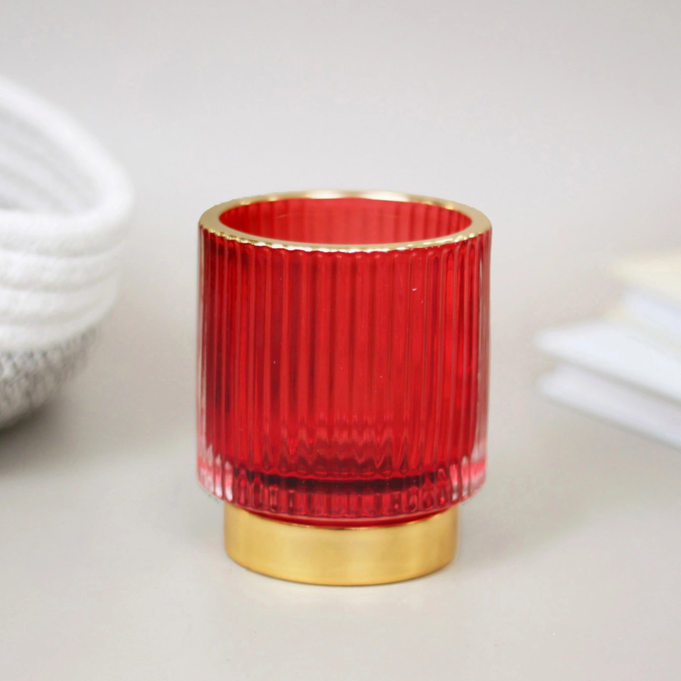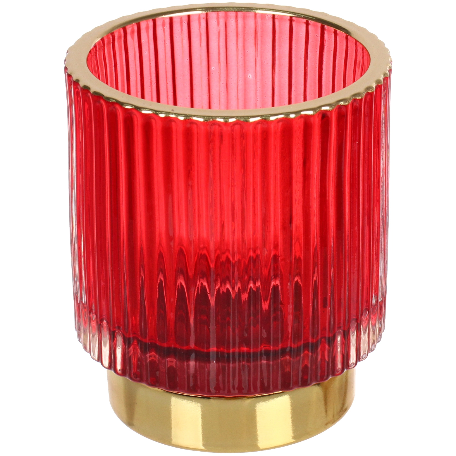 Элегантный подсвечник из рубинового стекла с золотистой окантовкой создаст атмосферу тепла и утончённости в любом интерьере. Его сдержанный, но выразительный дизайн подходит как для повседневного декора, так и для праздничной сервировки стола. За счёт рифлёной фактуры стекло красиво преломляет свет, превращая обычную свечу в яркий акцент помещения.