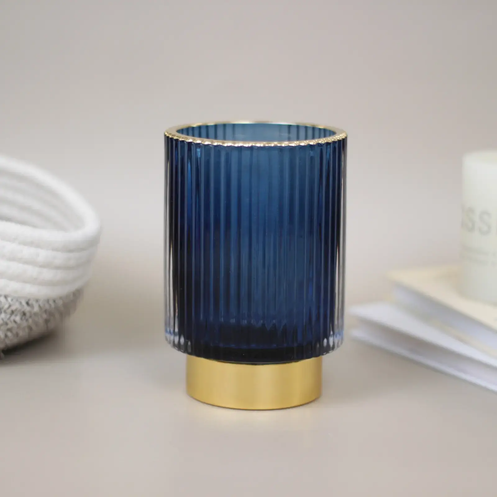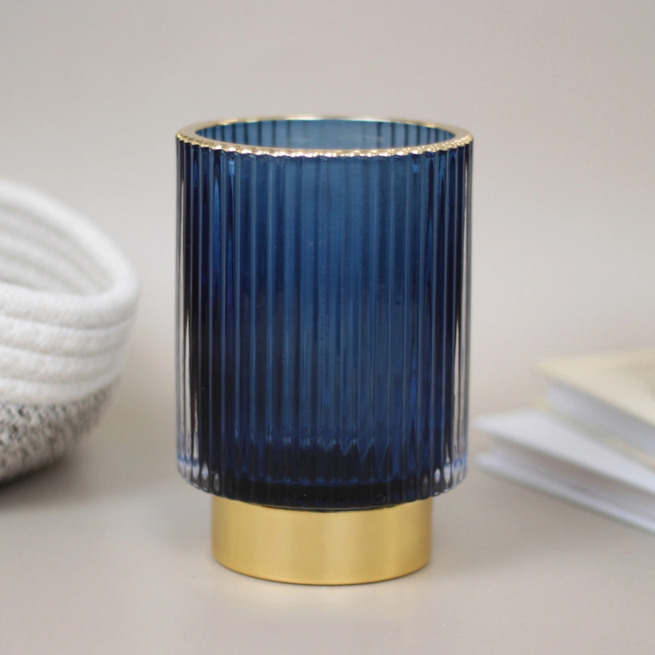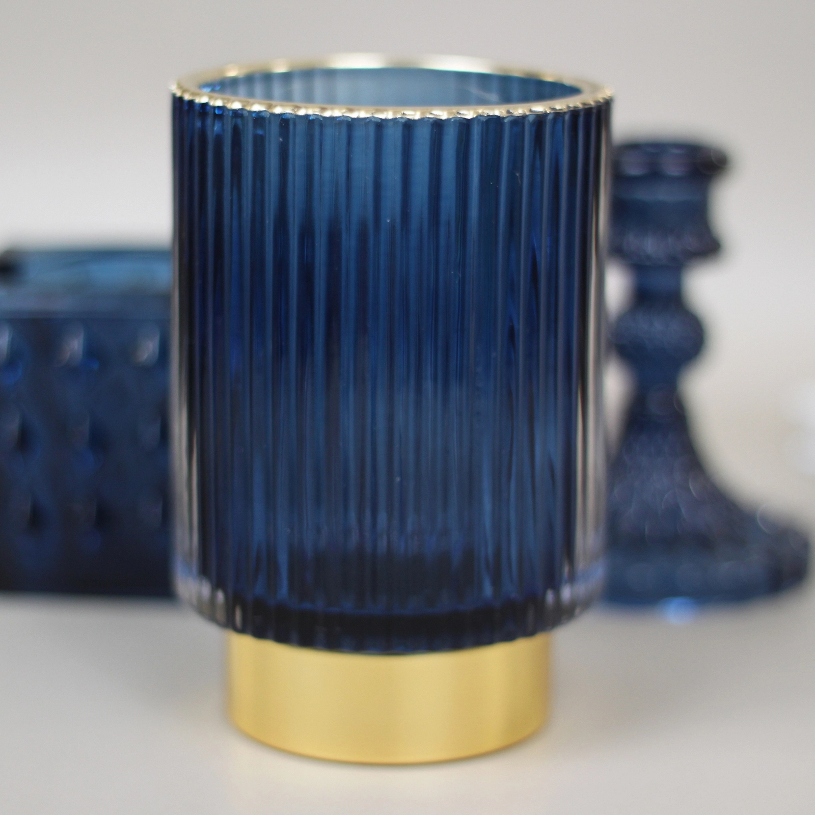 Подсвечник "Английский стиль" сочетает в себе изысканность классического дизайна и практичность современных материалов. Глубокий сапфировый оттенок стеклянного корпуса, изящные рифлёные грани и утончённая золотистая окантовка превращают его в эффектный акцент интерьера, привлекающий внимание с первого взгляда.