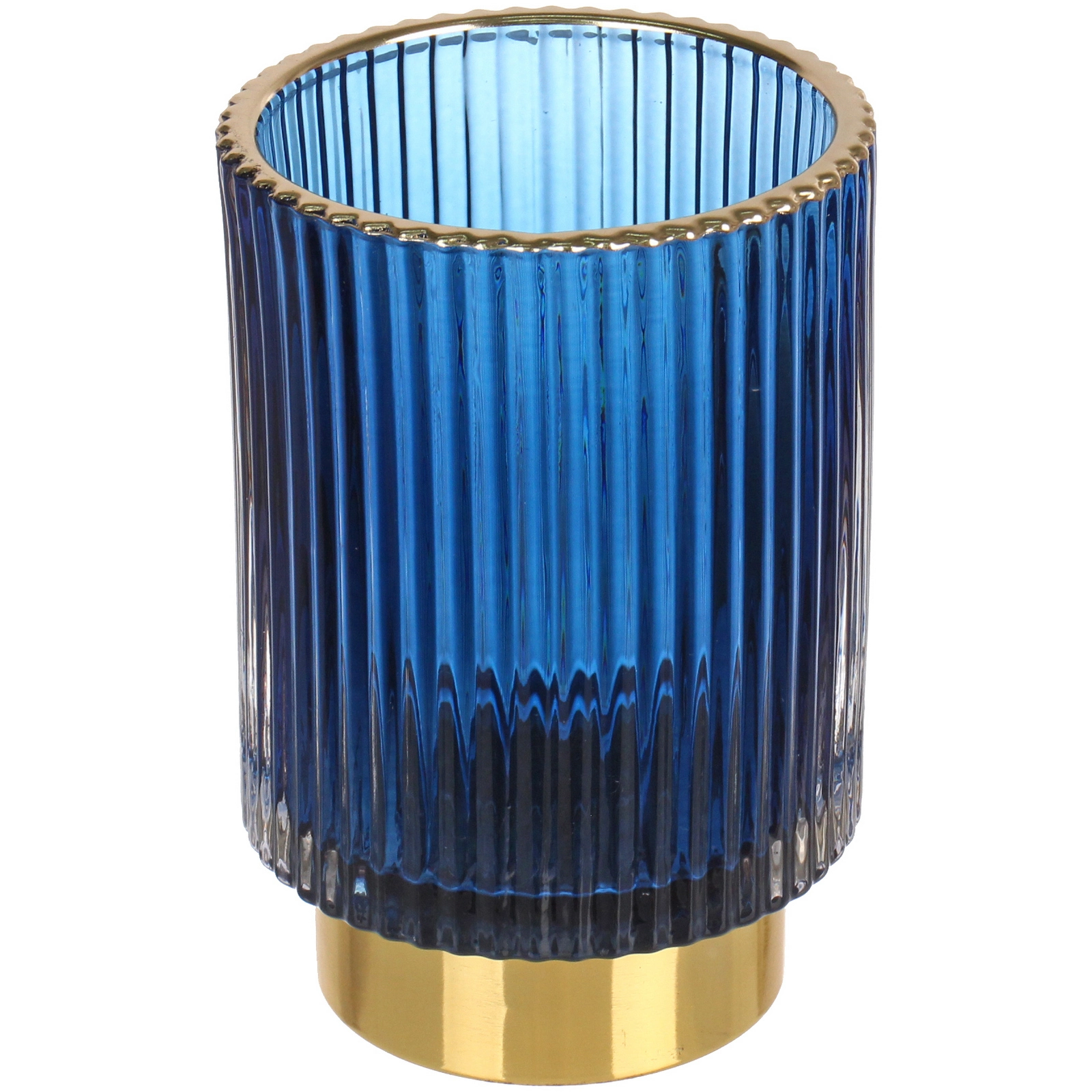 Высота подсвечника — 12,5 см, диаметр — 8,5 см. Корпус выполнен из рифлёного стекла с сапфировым оттенком, основание — из металла благородного золотистого цвета. Лёгкий в уходе: достаточно удалить пыль сухой или слегка влажной мягкой тканью.