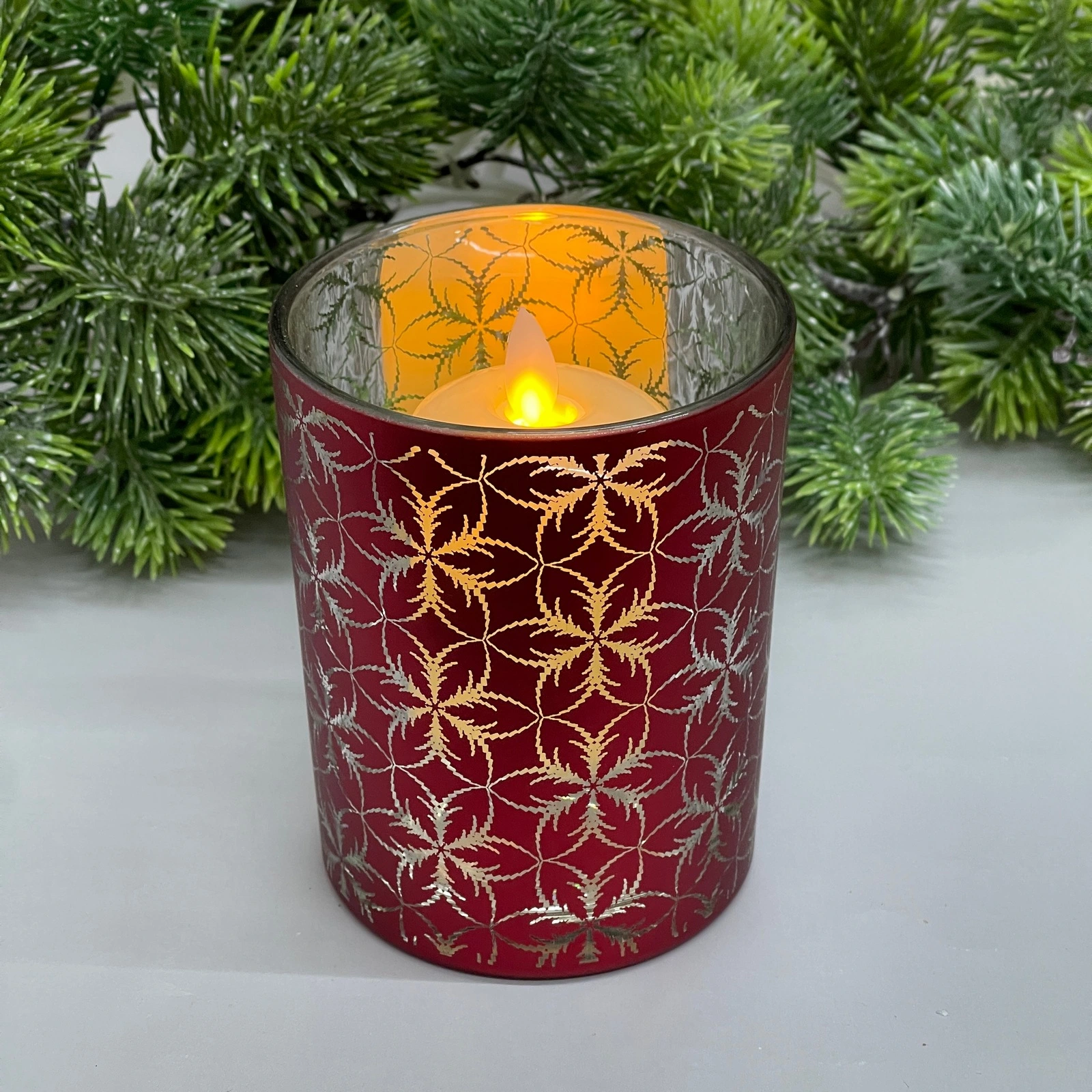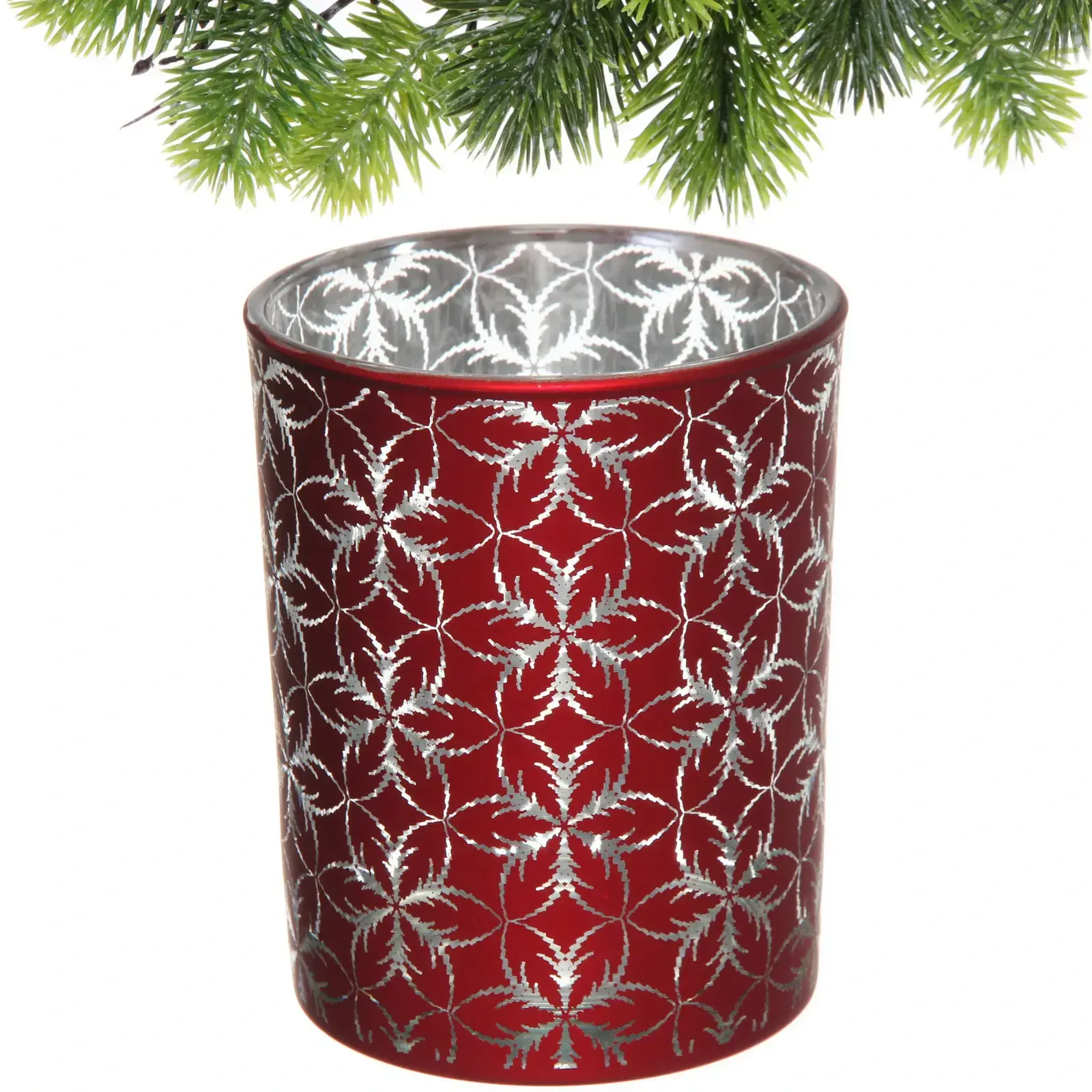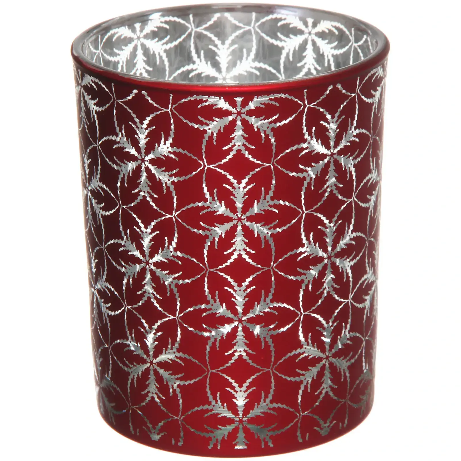 Габариты изделия — 10x12,5 см, материал — стекло. Красный цвет с серебристым узором добавляет яркость и изысканность, при этом гармонирует как с современными, так и с классическими стилями интерьера. Подсвечник можно легко сочетать с другими декоративными элементами в доме.