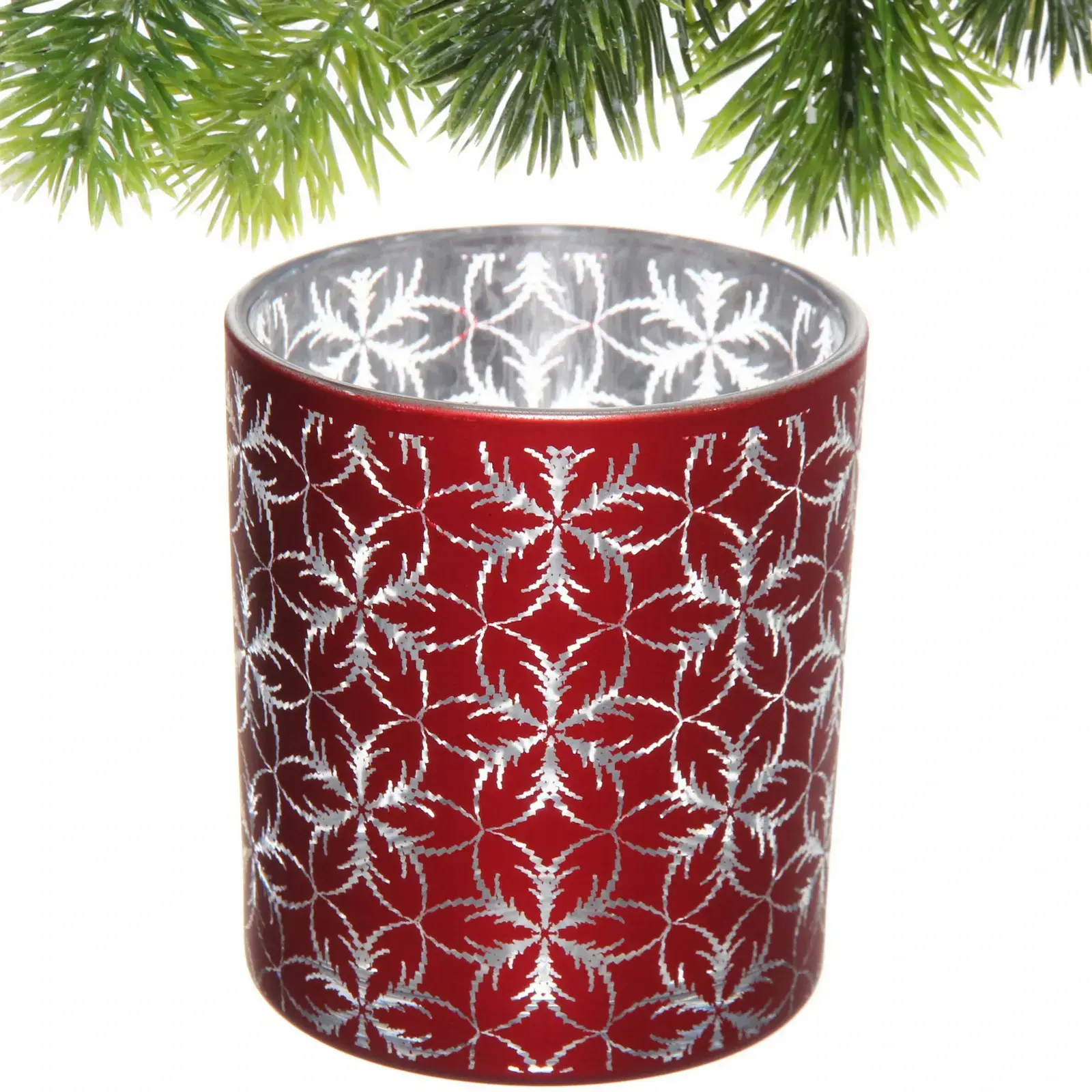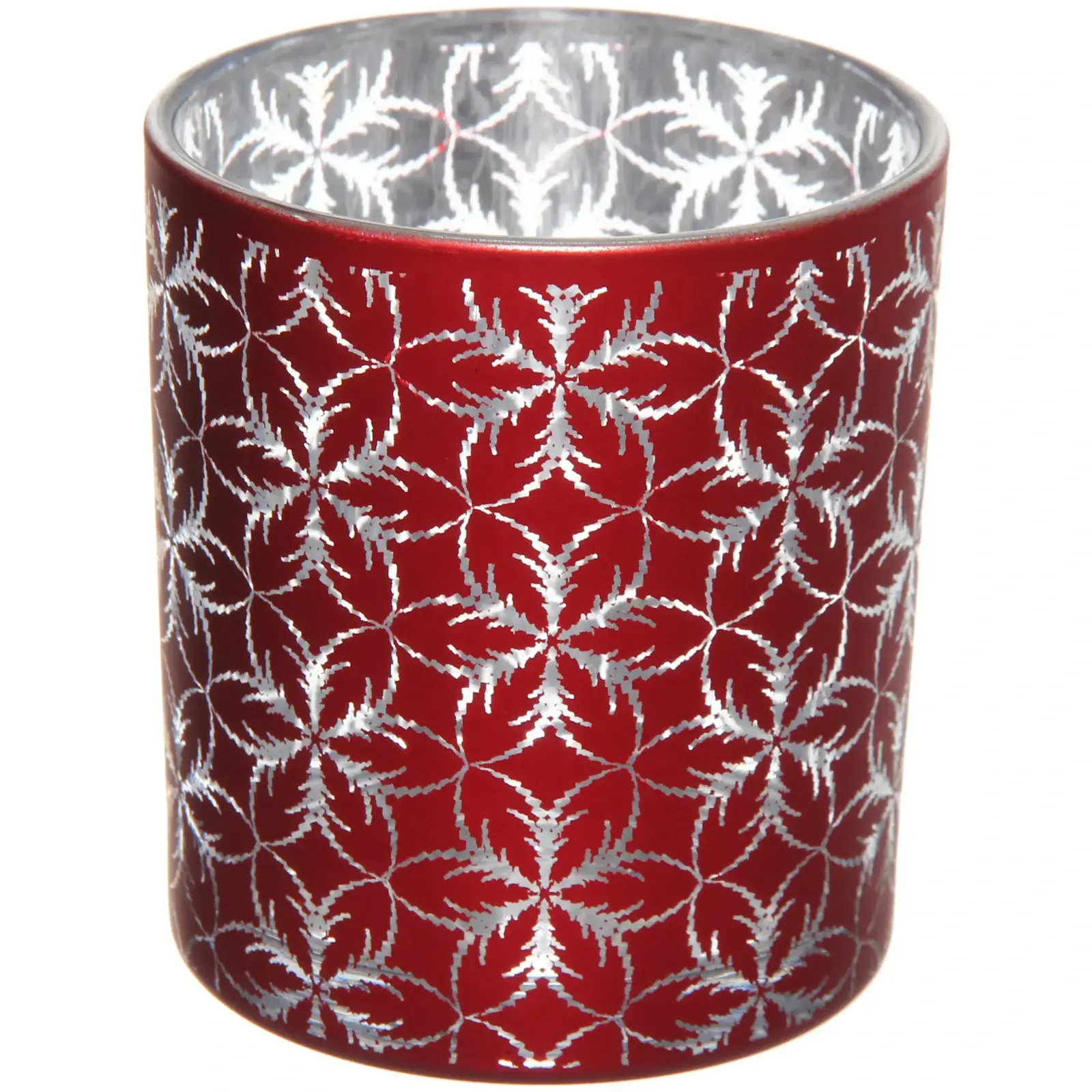 Подсвечник выполнен в форме ровного цилиндра. Внешняя поверхность окрашена в насыщенный красный тон, украшена повторяющимися серебристыми орнаментами в виде пересекающихся окружностей, создающих цветочные мотивы. Внутренняя часть имеет серебристое покрытие, что усиливает отражение света свечи. Благодаря этому пламя красиво переливается, создавая уникальный визуальный эффект.