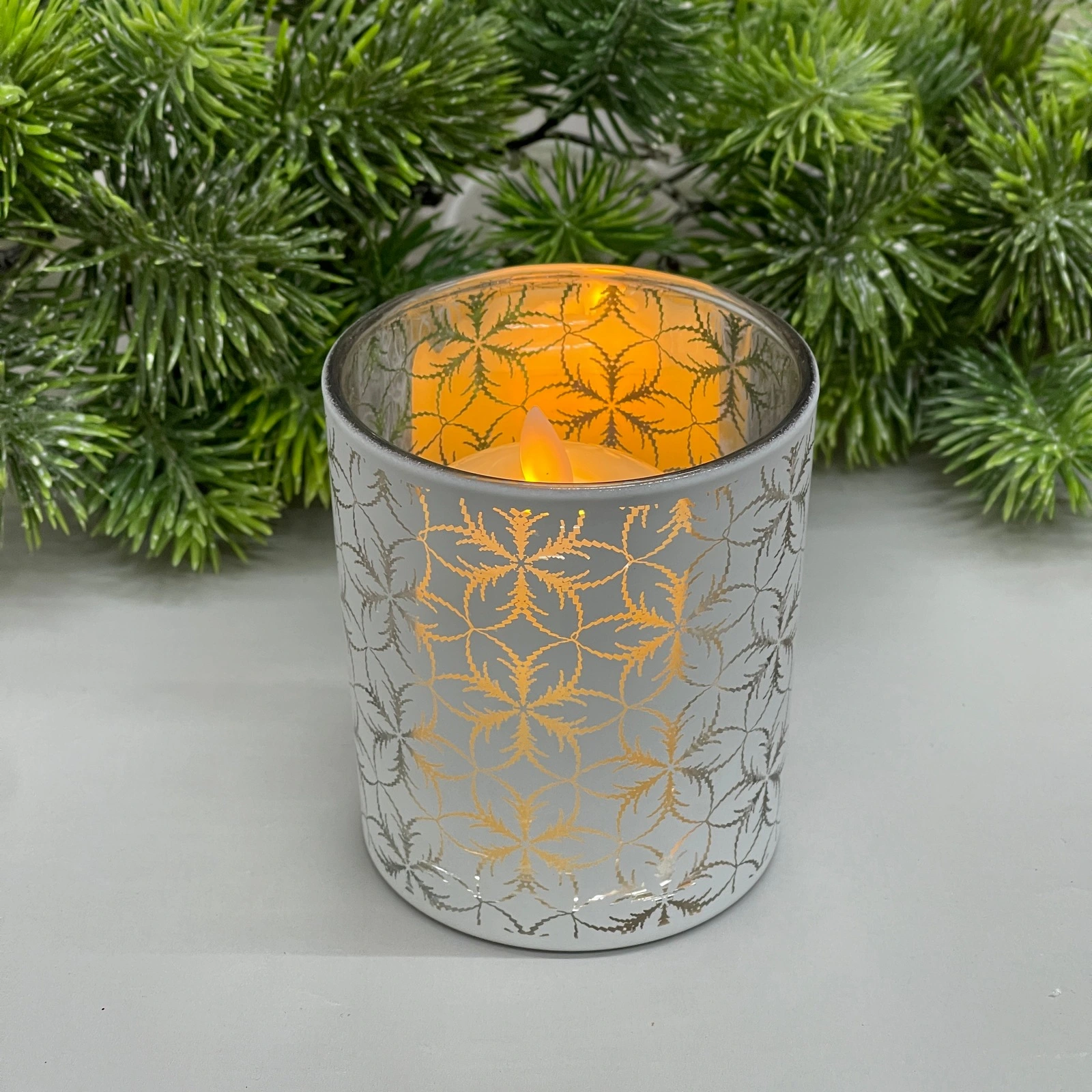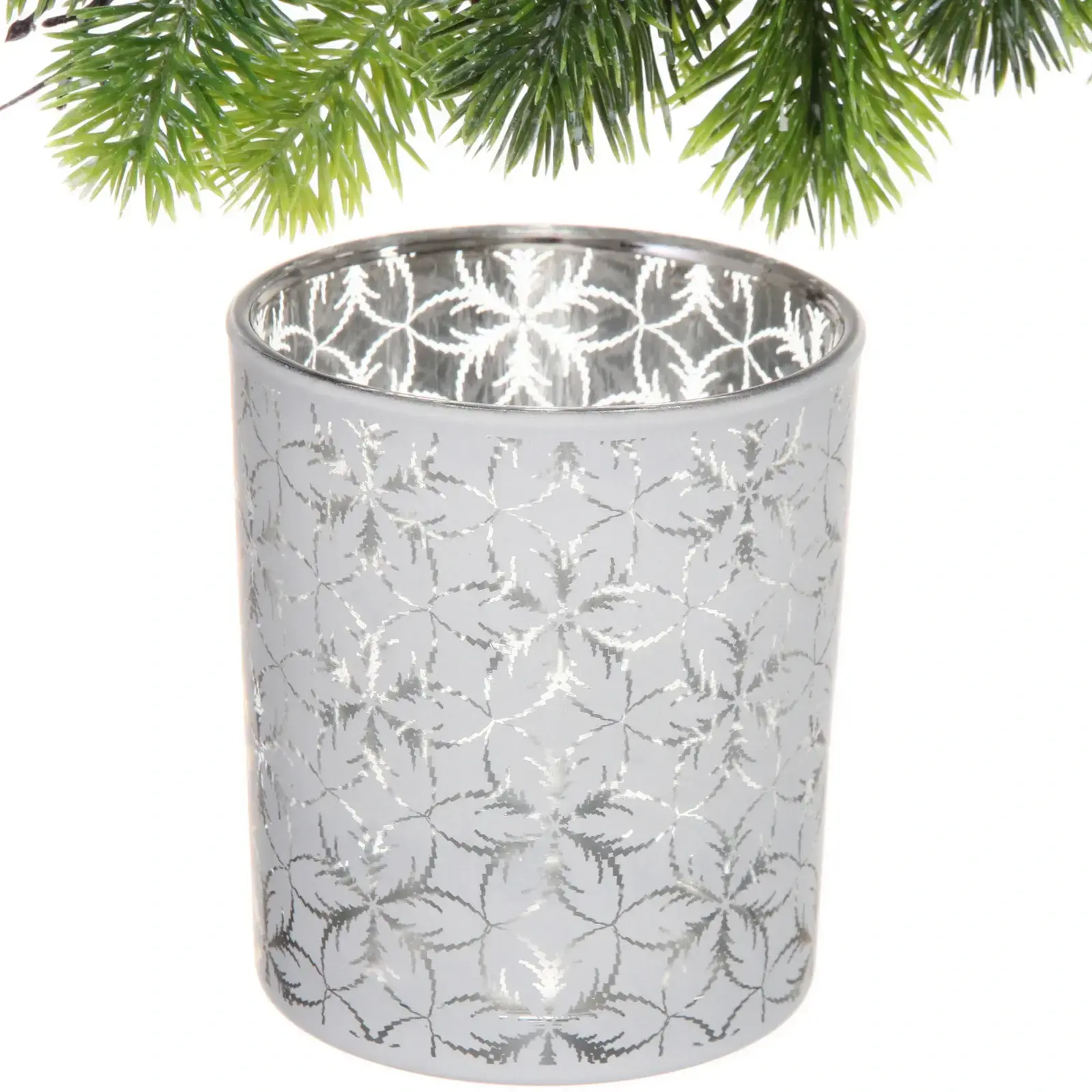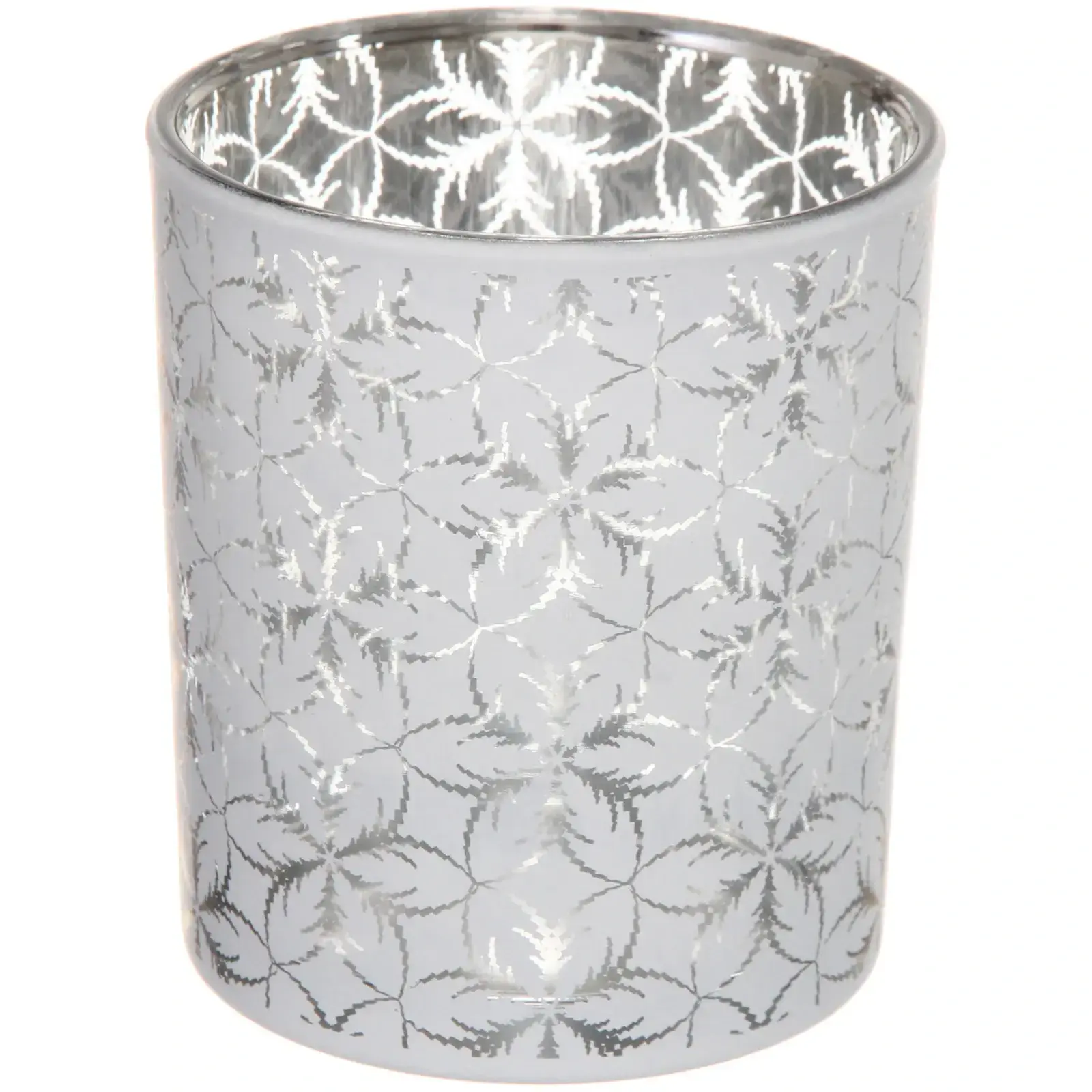 Высота подсвечника — 10 см, диаметр — 8,5 см. Материал — стекло с декоративным зеркальным напылением серебристого оттенка, украшенное повторяющимся узором.