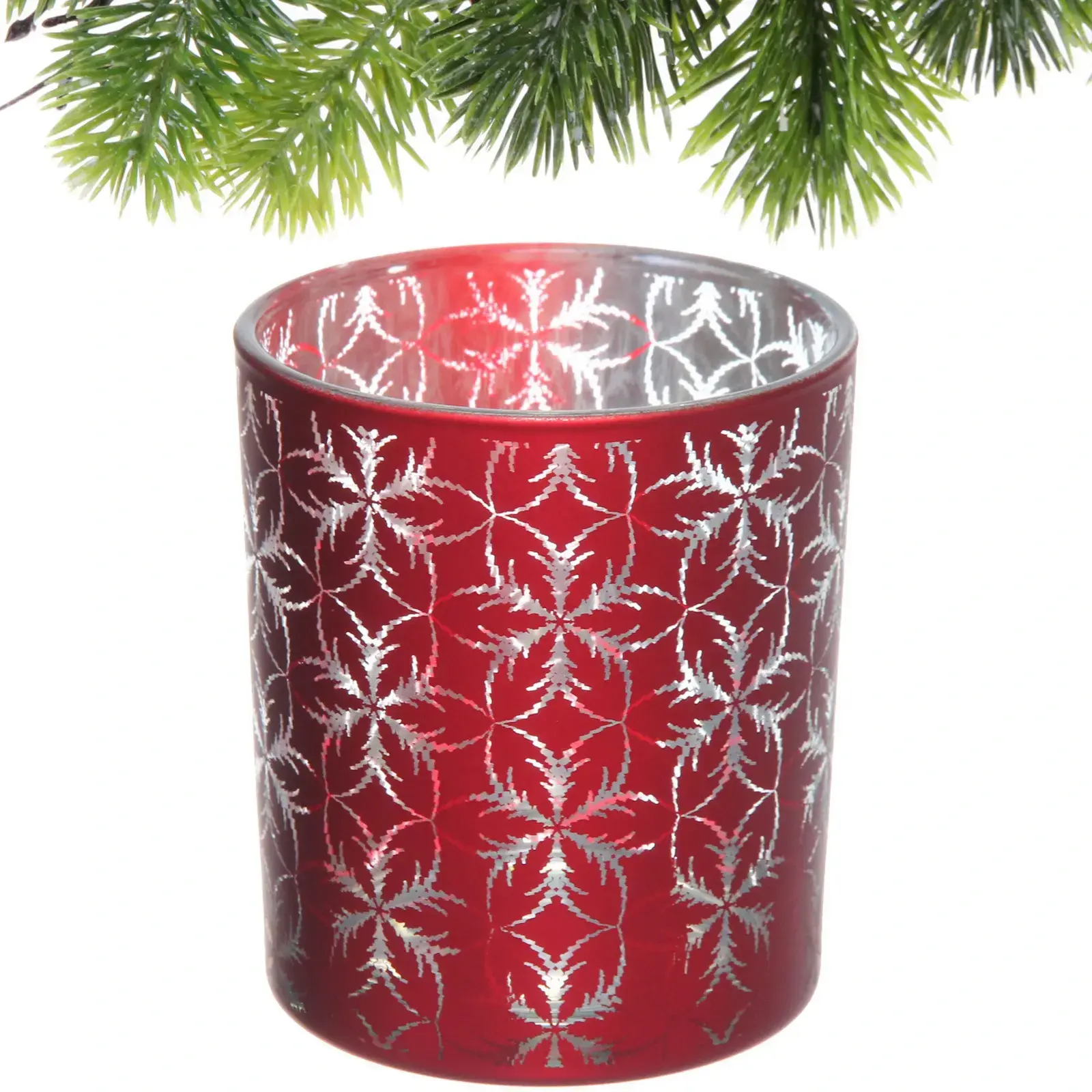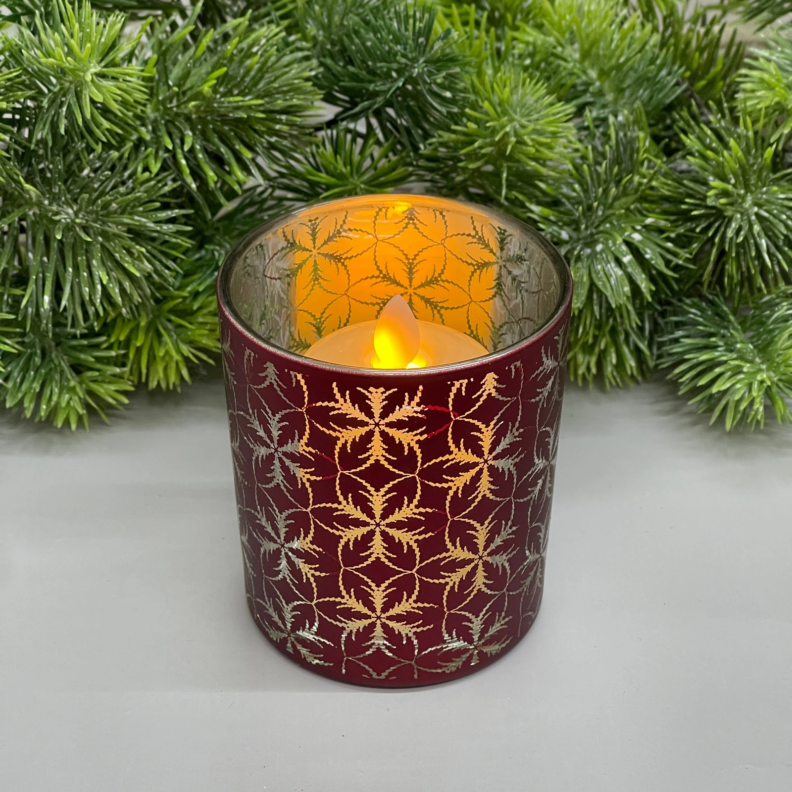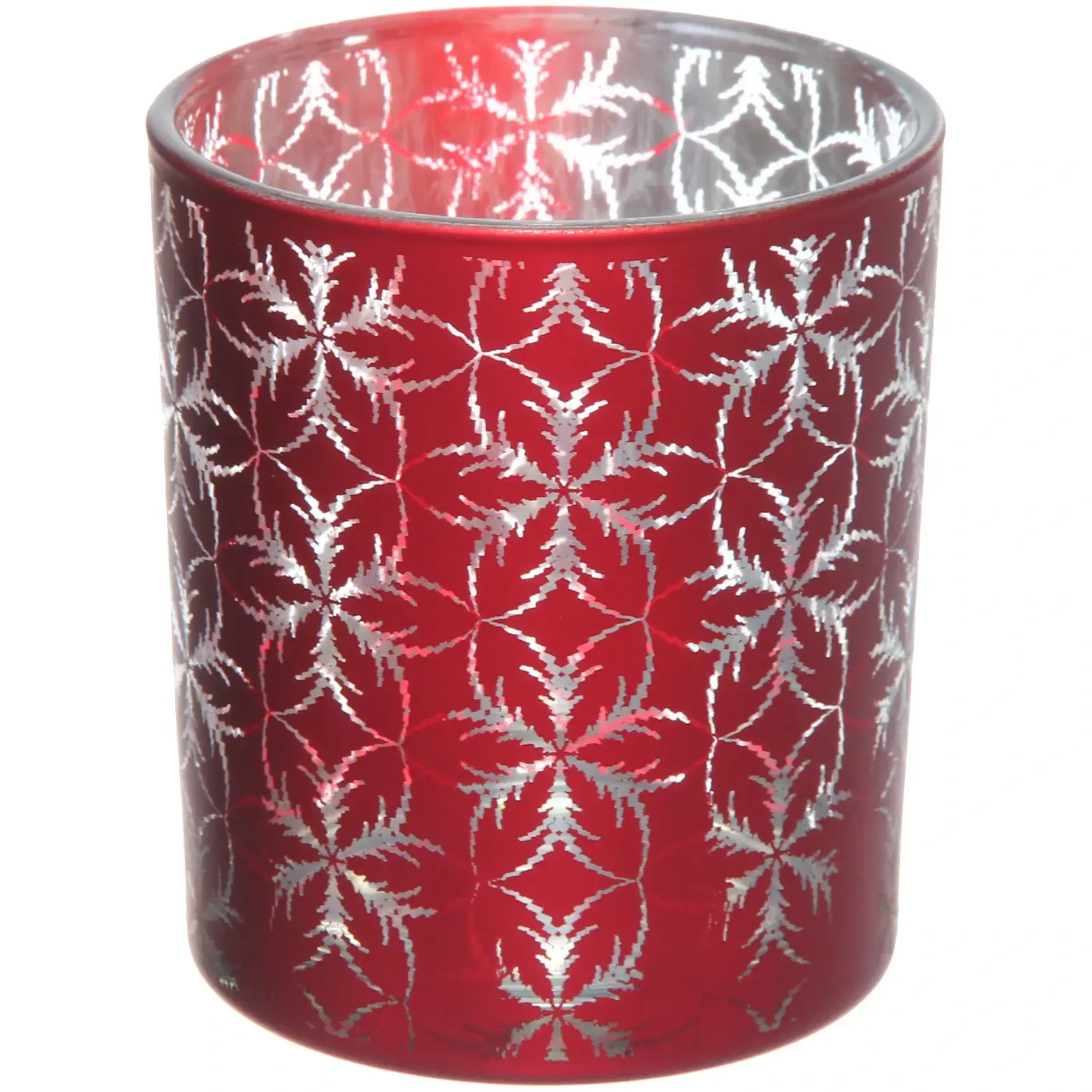 Стеклянный подсвечник "Фантазия" в насыщенном красном цвете с утончённым серебристым узором создаёт тёплое и праздничное настроение в вашем доме. Внутреннее зеркальное покрытие усиливает свечение свечи, делая свет мягким и завораживающим.