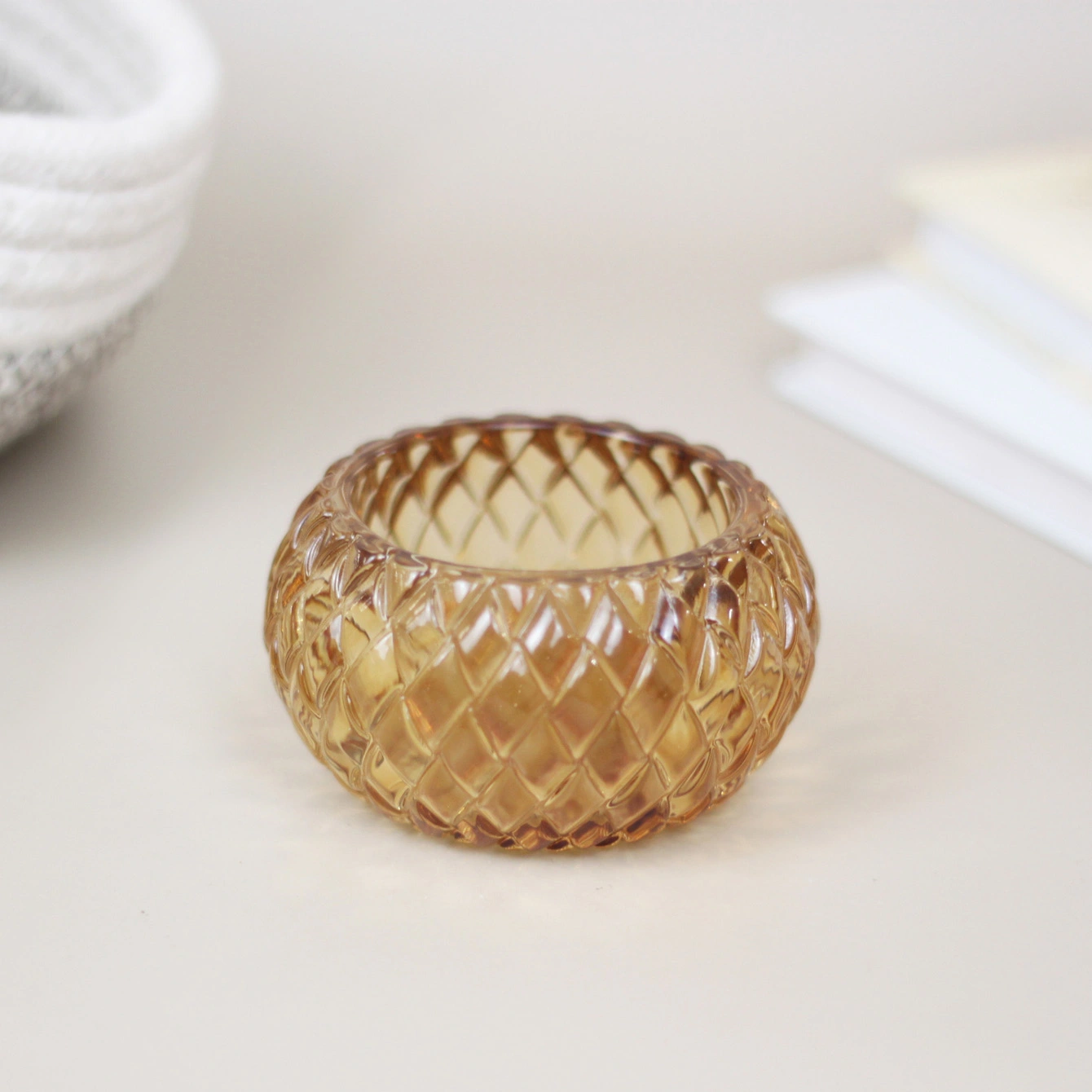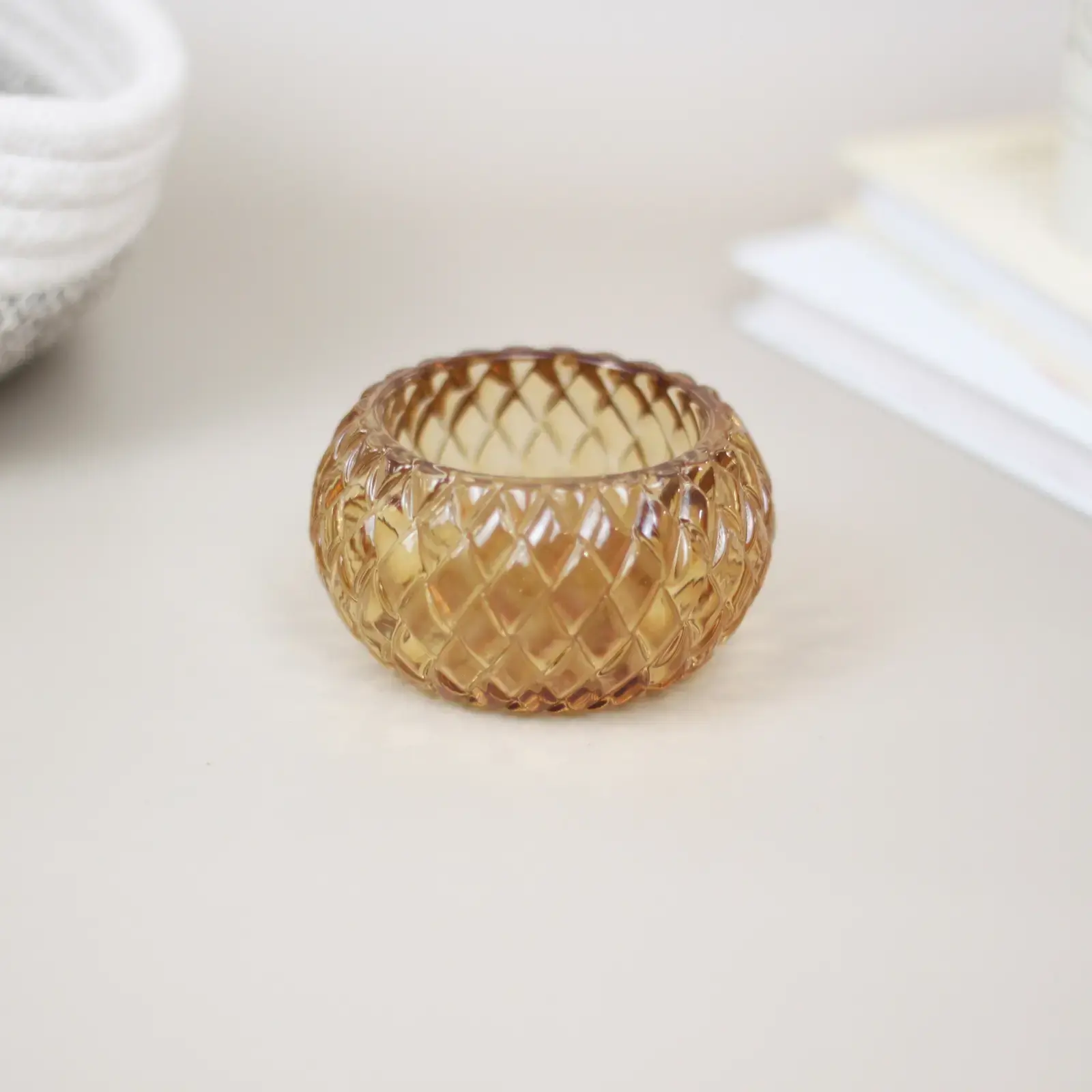Этот изящный стеклянный подсвечник станет стильным акцентом для вашего интерьера. Полупрозрачный янтарный оттенок создаёт теплое и мягкое свечение, а рельефный ромбовидный узор придаёт изысканности и утонченности. Он идеально подходит для чайных свечей, создавая атмосферу комфорта и умиротворения в любой комнате.