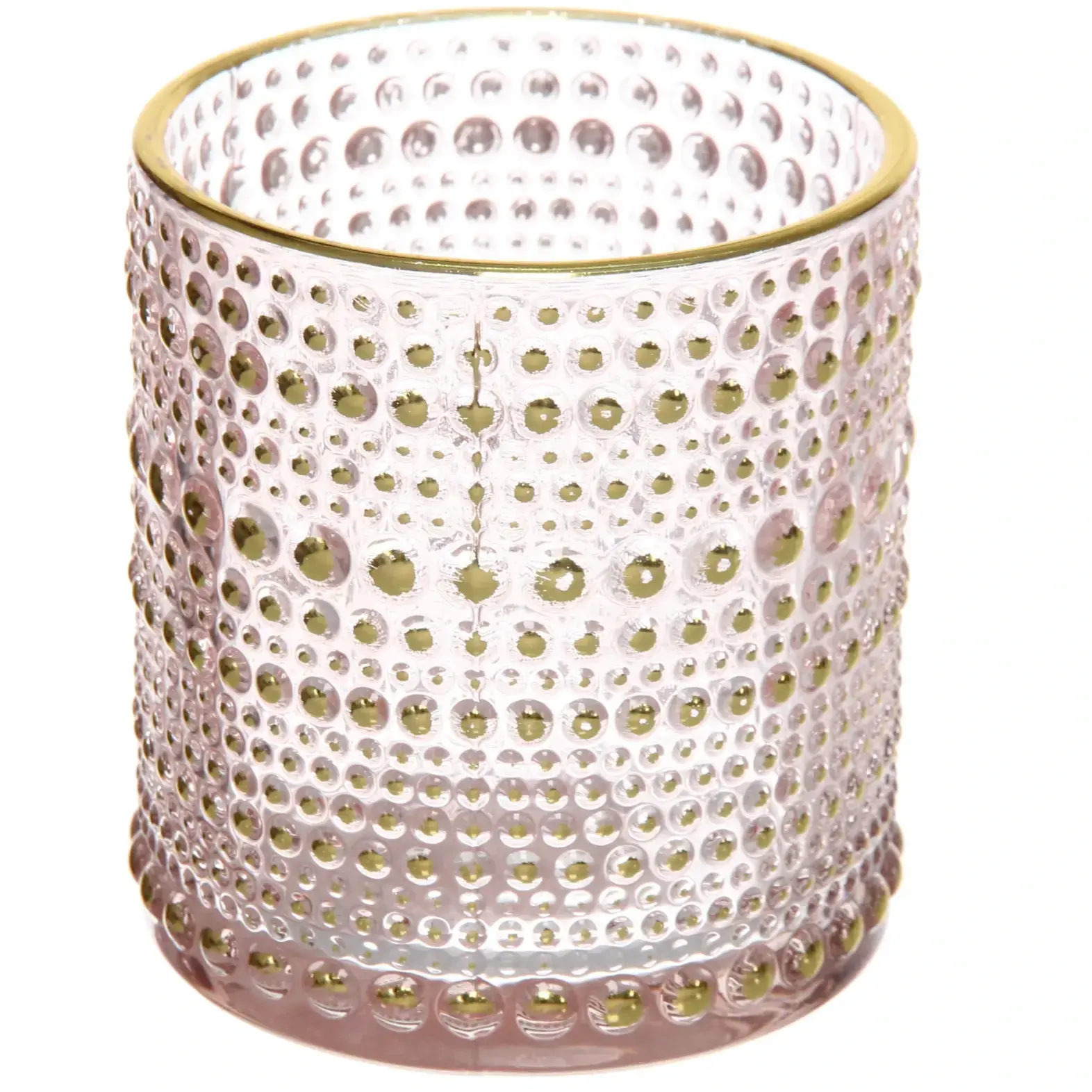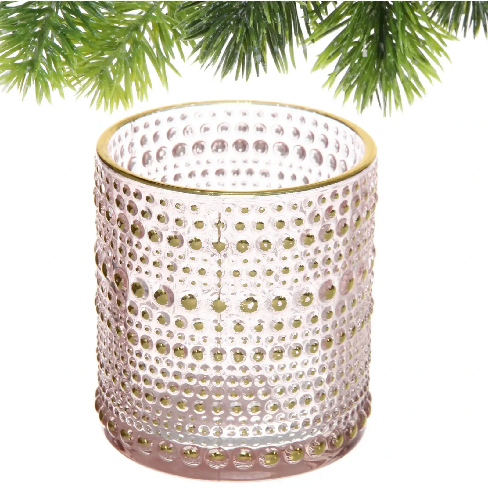 Подсвечник «Хрустальный блеск» станет стильным акцентом вашего интерьера, создавая мягкое и тёплое свечение, которое наполняет пространство комфортом и гармонией. Рельефный узор из множества округлых элементов красиво преломляет свет, добавляя эффект мерцающих огней, а нежный розовый оттенок корпуса и утончённая золотистая окантовка делают изделие визуально богатым и утончённым.