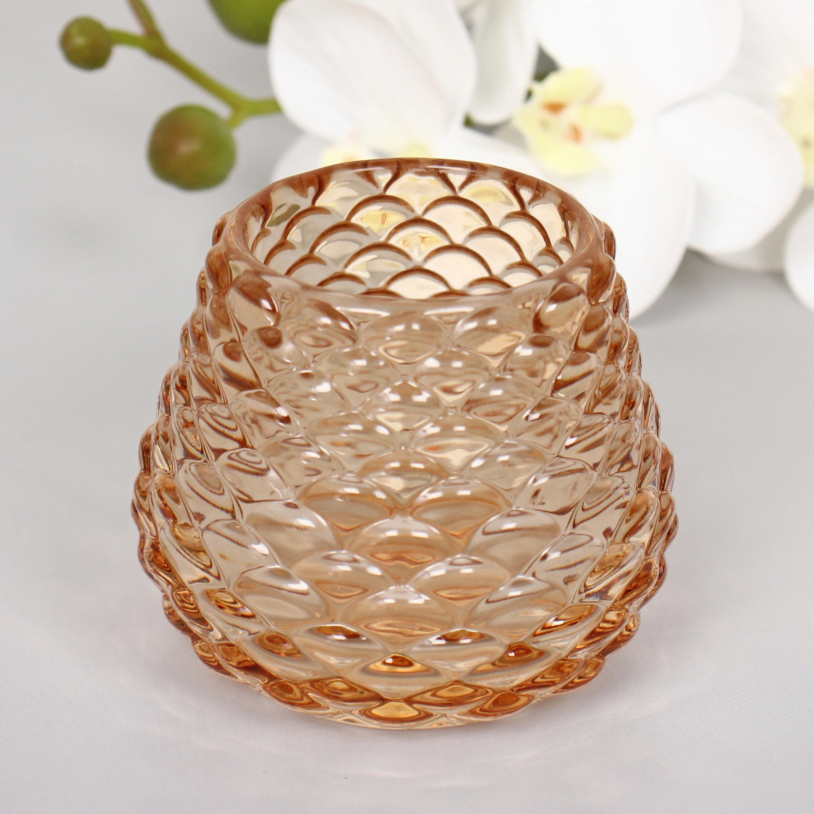 Подсвечник «Лесная шишка» в янтарном оттенке создаёт атмосферу тепла и гармонии в помещении. Его полупрозрачное стекло мягко рассеивает свет свечи, наполняя комнату мягким золотистым сиянием. Рельефная поверхность в форме перекрывающихся чешуй напоминает природный узор шишки и добавляет изделию выразительности.