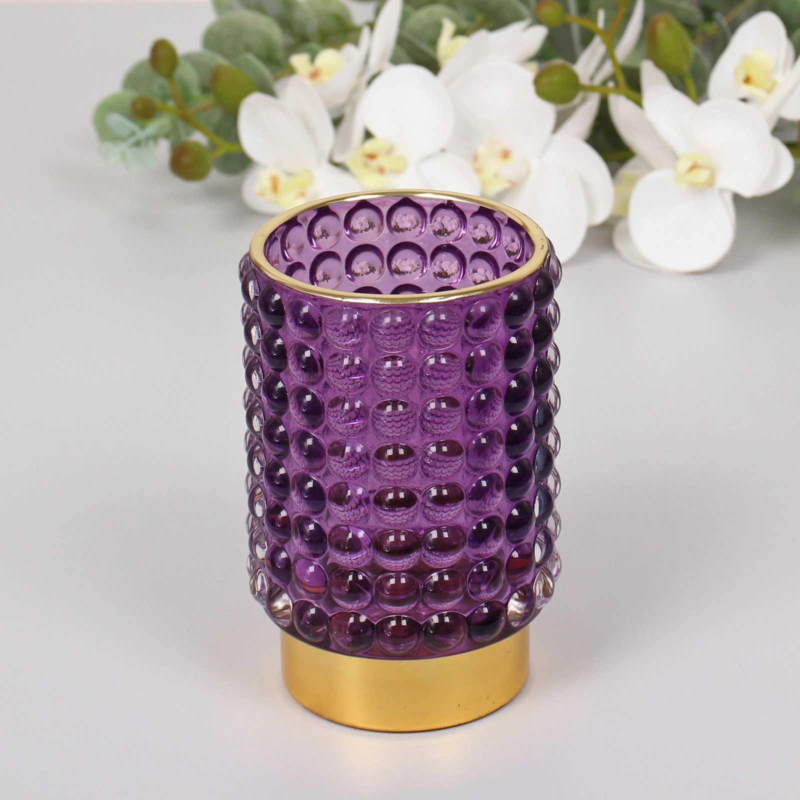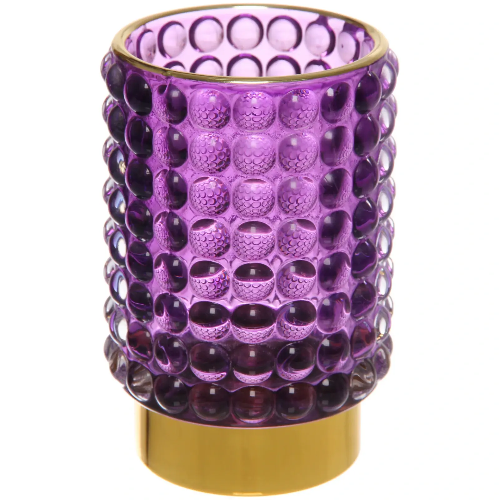 Создайте атмосферу тепла и уюта с подсвечником "Мерцание". Его утончённый фиолетовый цвет с прозрачным эффектом и золотистая окантовка придадут вашему пространству нотку изысканности. Идеален для вечеров при мягком свете свечи, подчёркивает красоту любой комнаты.