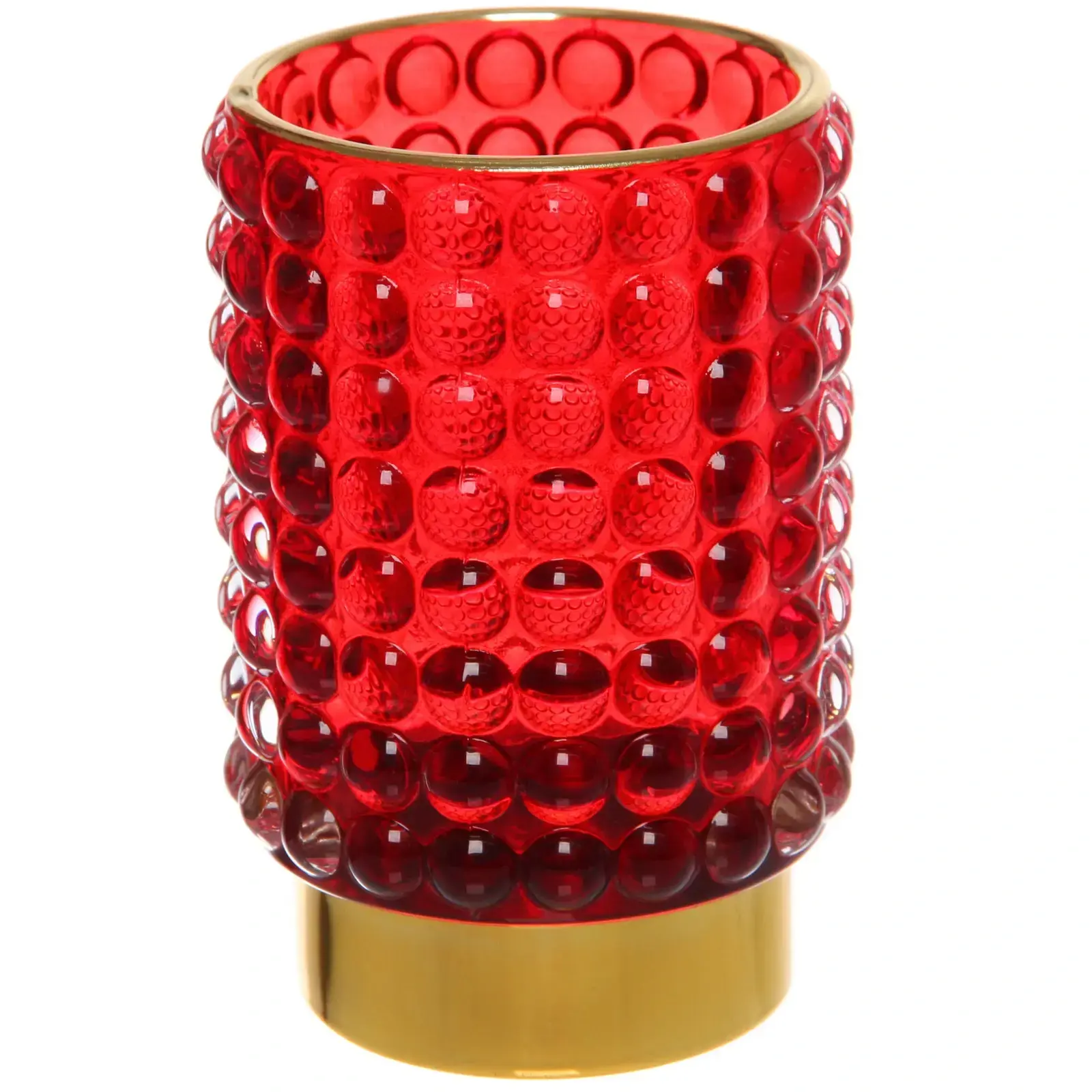Создайте теплое и романтичное настроение в вашем доме с помощью подсвечника «Мерцание». Его насыщенный красный цвет в сочетании с утонченным золотистым ободком и основанием превращает обычное освещение в настоящий элемент декора. Игра света сквозь рельефное стекло создает мягкое мерцание, наполняя комнату атмосферой комфорта.