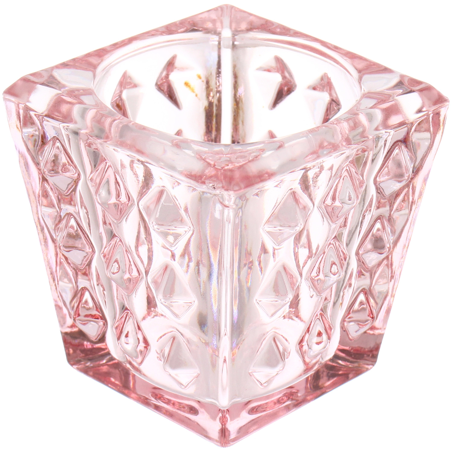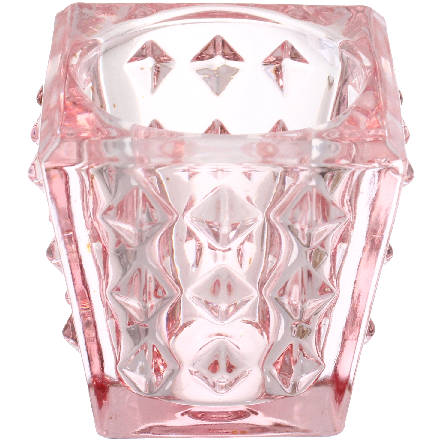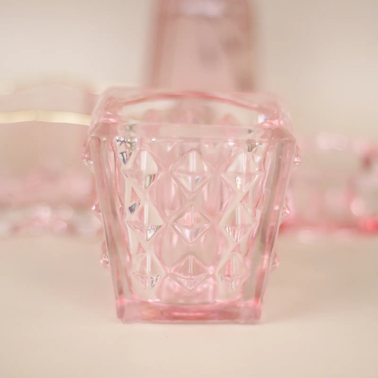 Подсвечник «Нежность» — изящный элемент декора, который создаст теплое и романтичное освещение в вашем доме. Его нежный розовый оттенок и прозрачная фактура стекла добавляют интерьеру утонченности и мягкости, а рельефный узор в виде повторяющихся ромбов красиво преломляет свет свечи, усиливая эффект уюта.