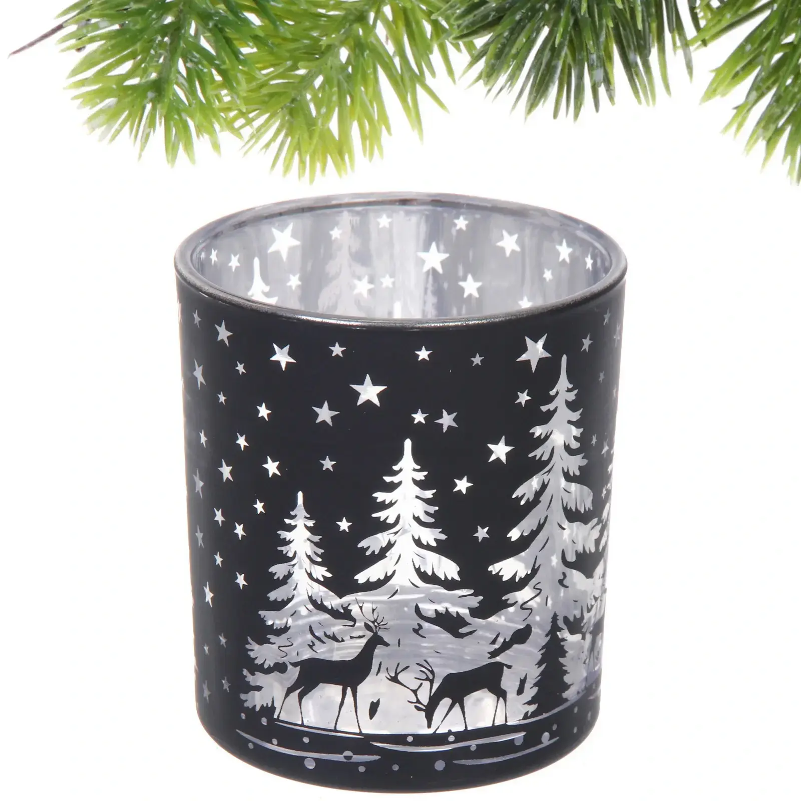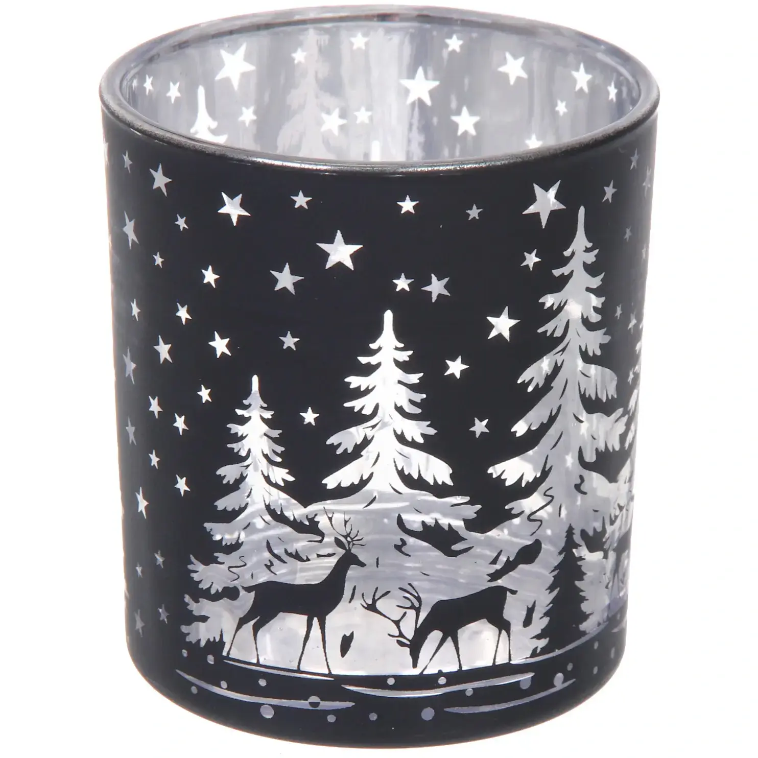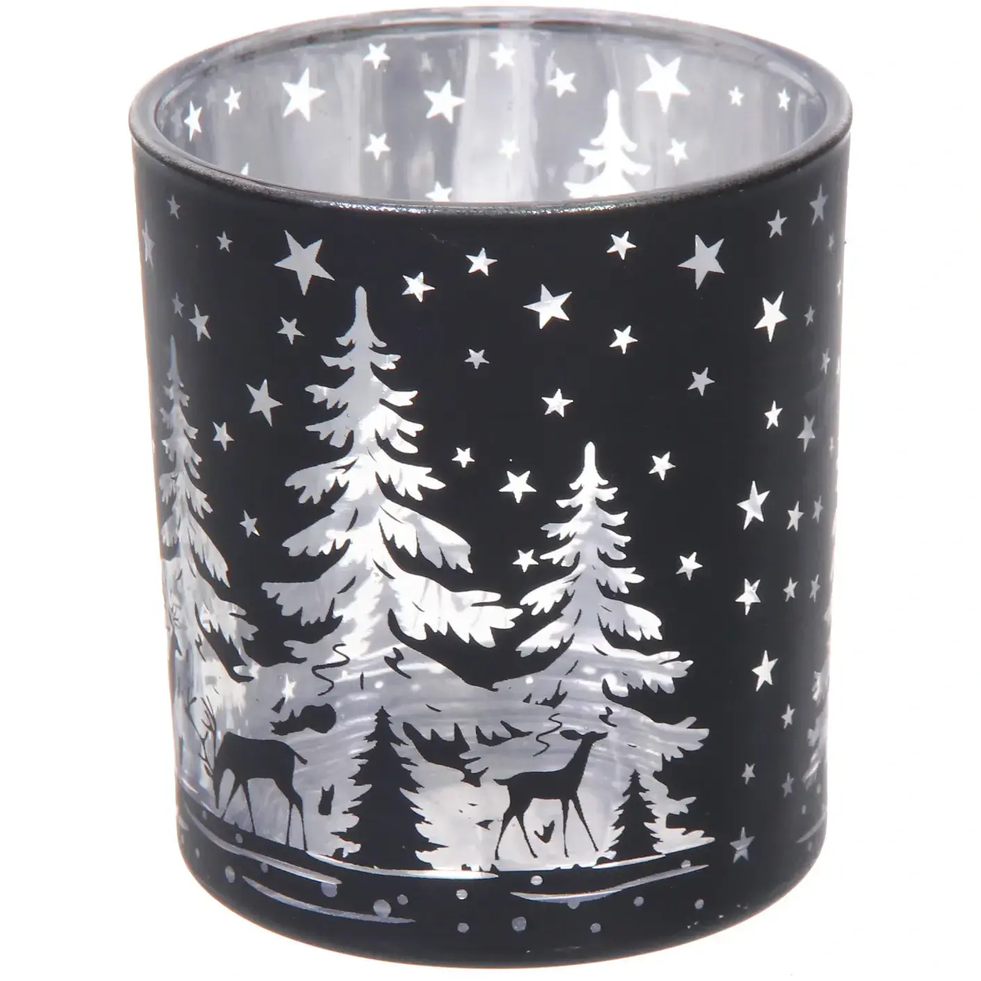 Создайте атмосферу тепла и уюта с подсвечником «Снежный лес». Этот элегантный стеклянный подсвечник черного цвета с серебристым декором станет идеальным дополнением к вашему интерьеру, особенно в зимний период. Его уникальный дизайн с изображением зимнего леса, оленей и звезд создает волшебное освещение, которое украсит любое пространство.