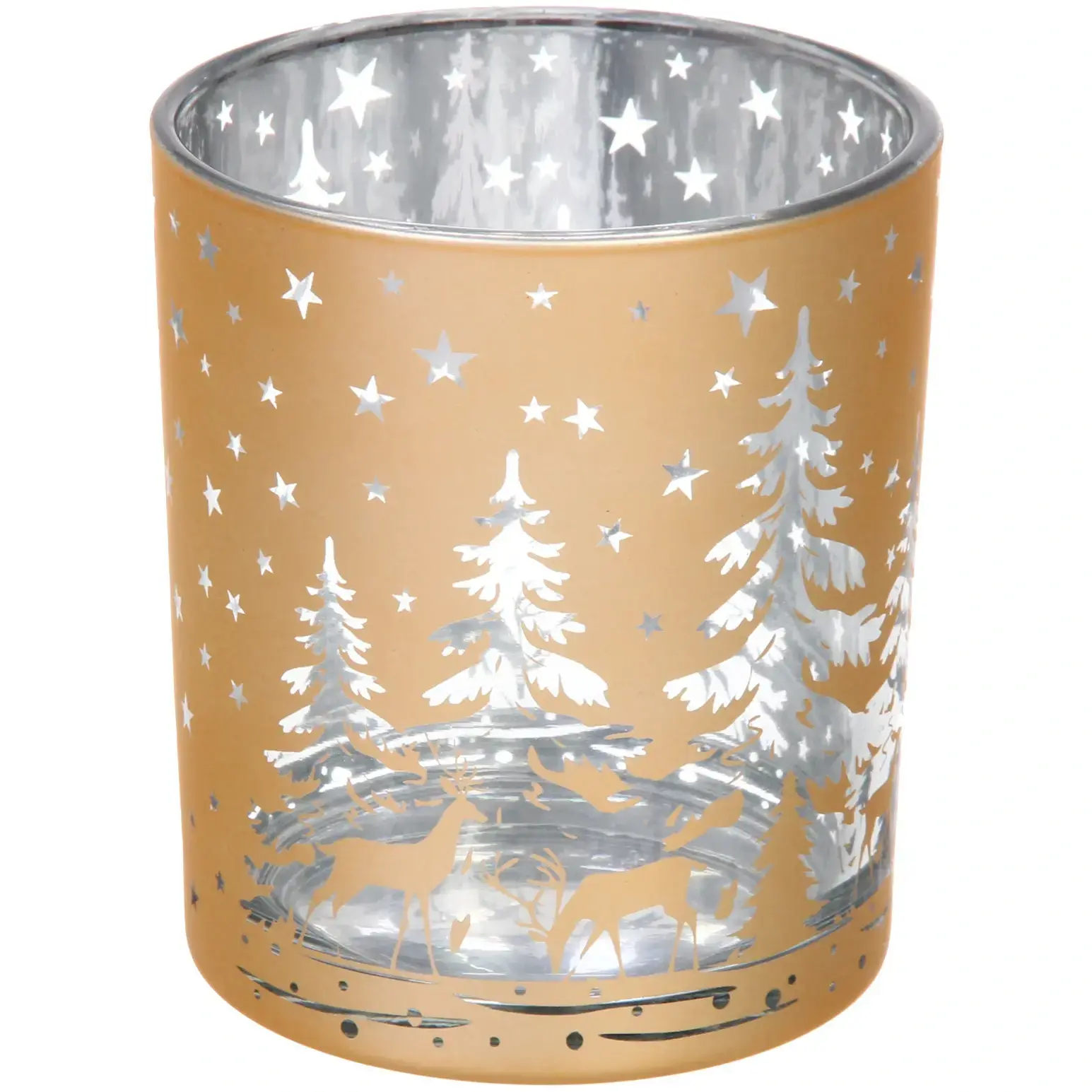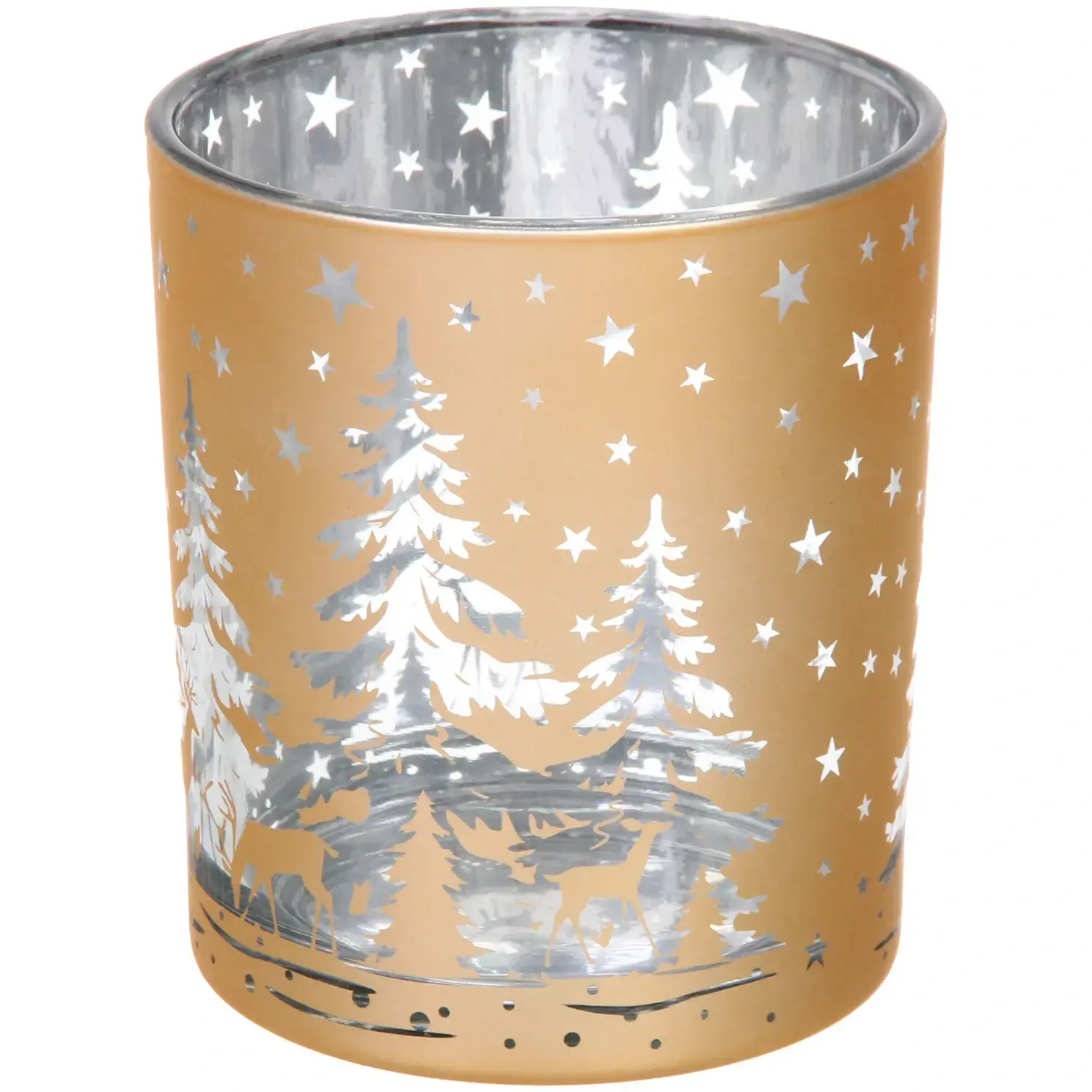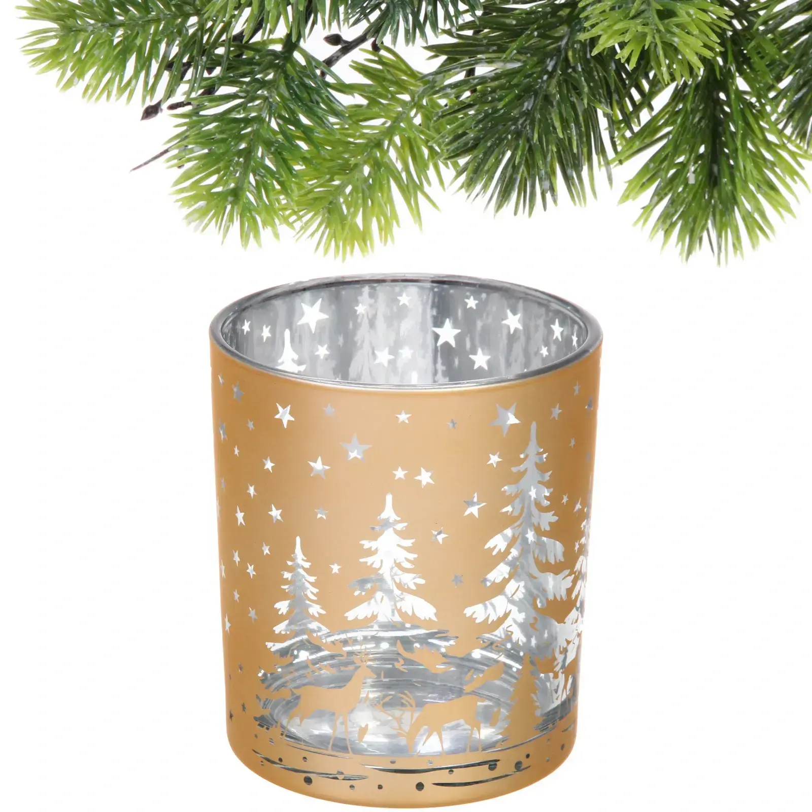 Подсвечник «Снежный лес» выполнен из стекла и имеет золотистый цвет с серебристым внутренним покрытием. Его размеры 8,5 см в диаметре и 10 см в высоту делают его компактным и удобным для размещения на столе, полке или камине. Этот подсвечник станет отличным подарком для ваших близких, добавляя уют и тепло в их дом.