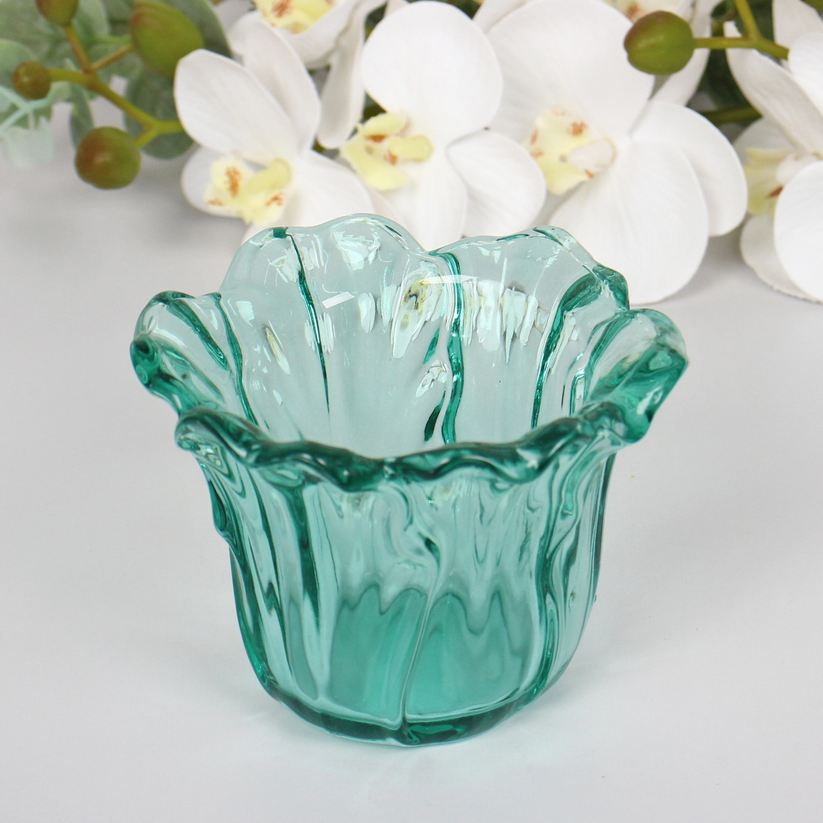 Создайте атмосферу уюта и гармонии в вашем доме с декоративным подсвечником «Цветок». Его нежный изумрудный оттенок с аквамариновыми переливами привносит свежесть и лёгкую прохладу в пространство, а изогнутый волнистый край придаёт предмету утончённый и роскошный вид.