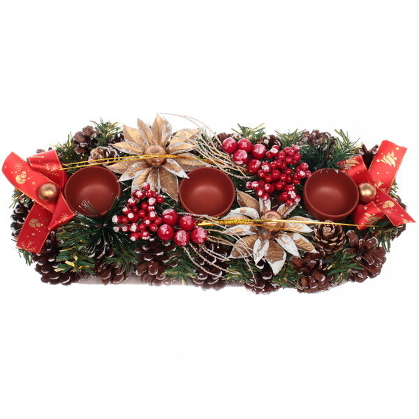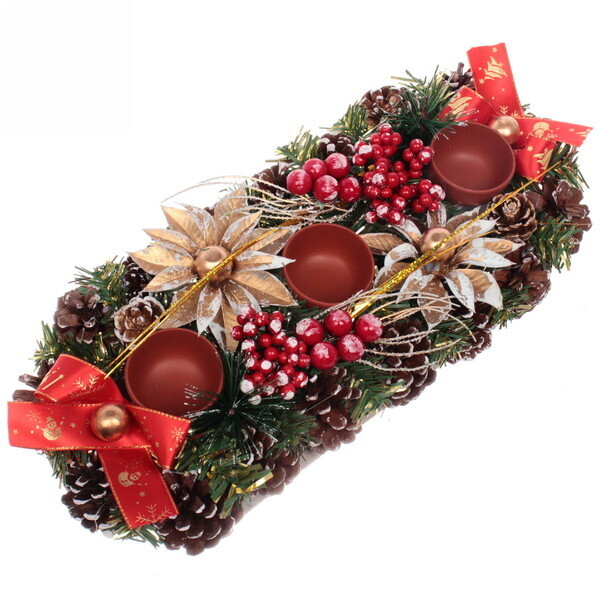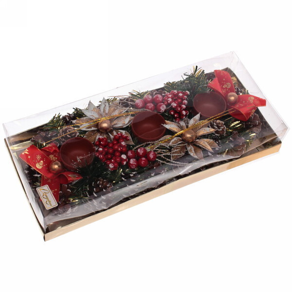 Размеры подсвечника составляют 16х37 см, что делает его компактным и удобным для размещения на столе. Он выполнен из пластика и ПВХ, что обеспечивает легкость и устойчивость к повреждениям. Декорирован искусственными ягодами, шишками и цветами, подсвечник создает атмосферу волшебства и уюта, идеально подходя для новогодних праздников.