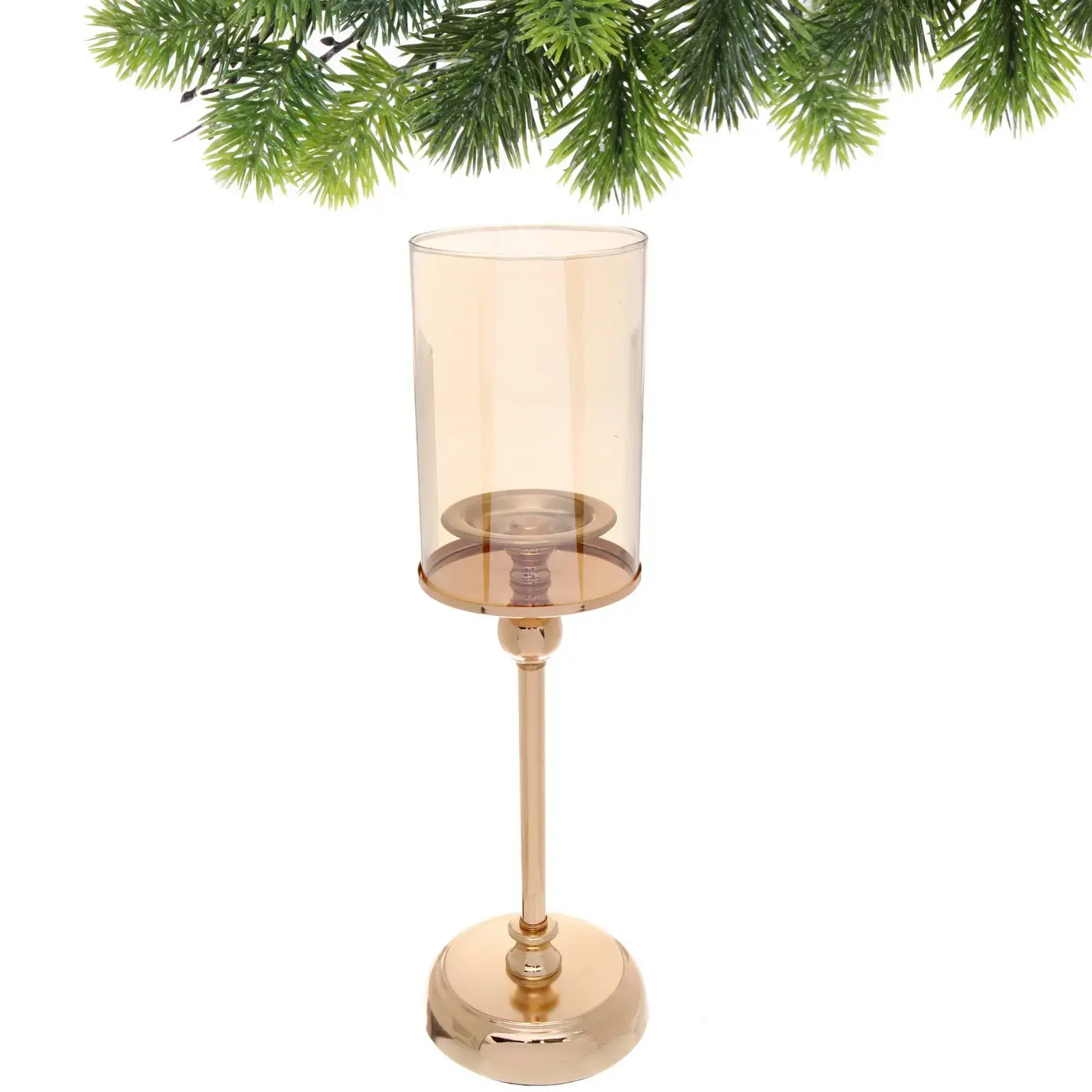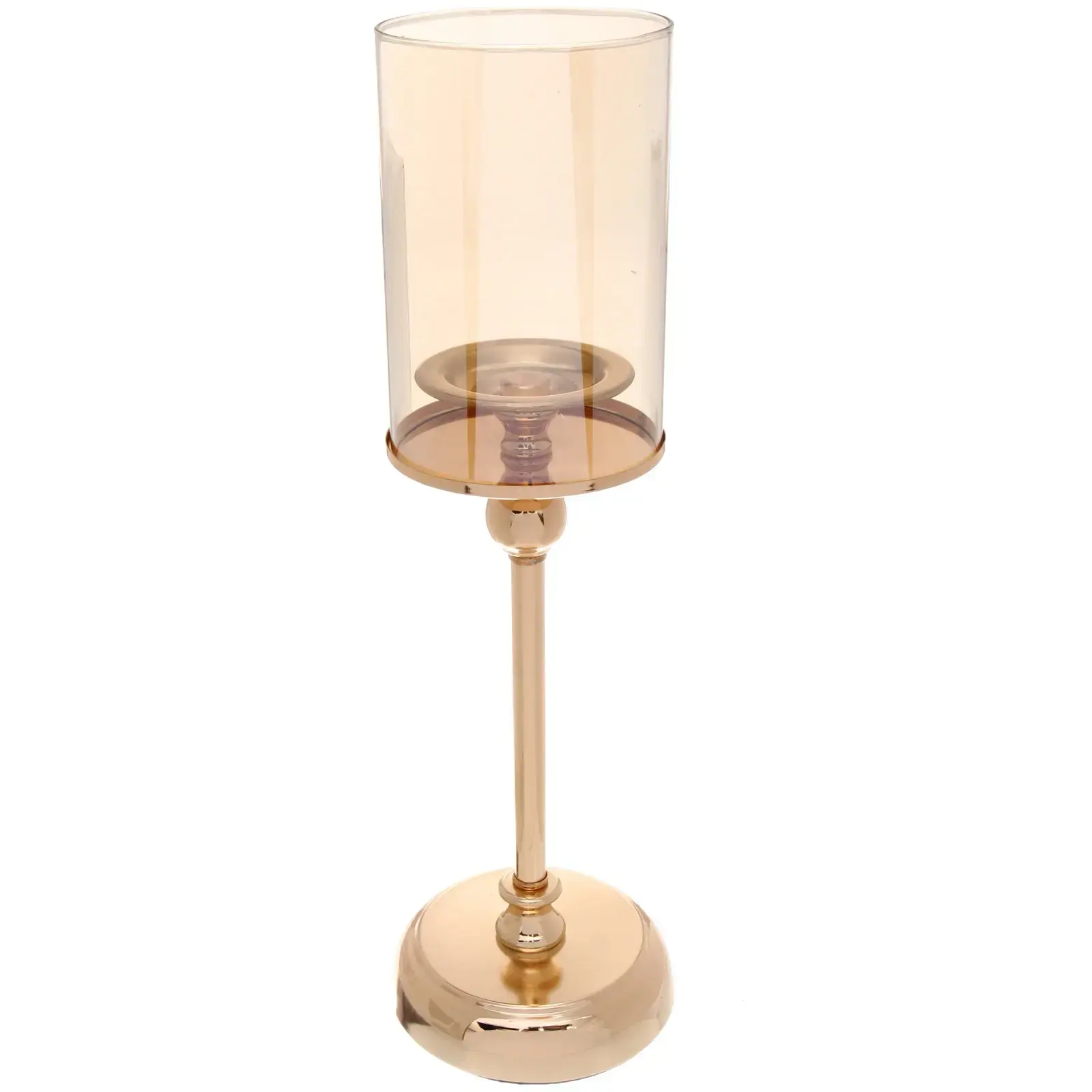 Создайте атмосферу уюта и утончённости с элегантным подсвечником «Vintage» высотой 40 см. Металлическое основание золотистого цвета с глянцевой поверхностью и прозрачный плафон из стекла делают этот предмет не только функциональным, но и декоративным акцентом в вашем доме.