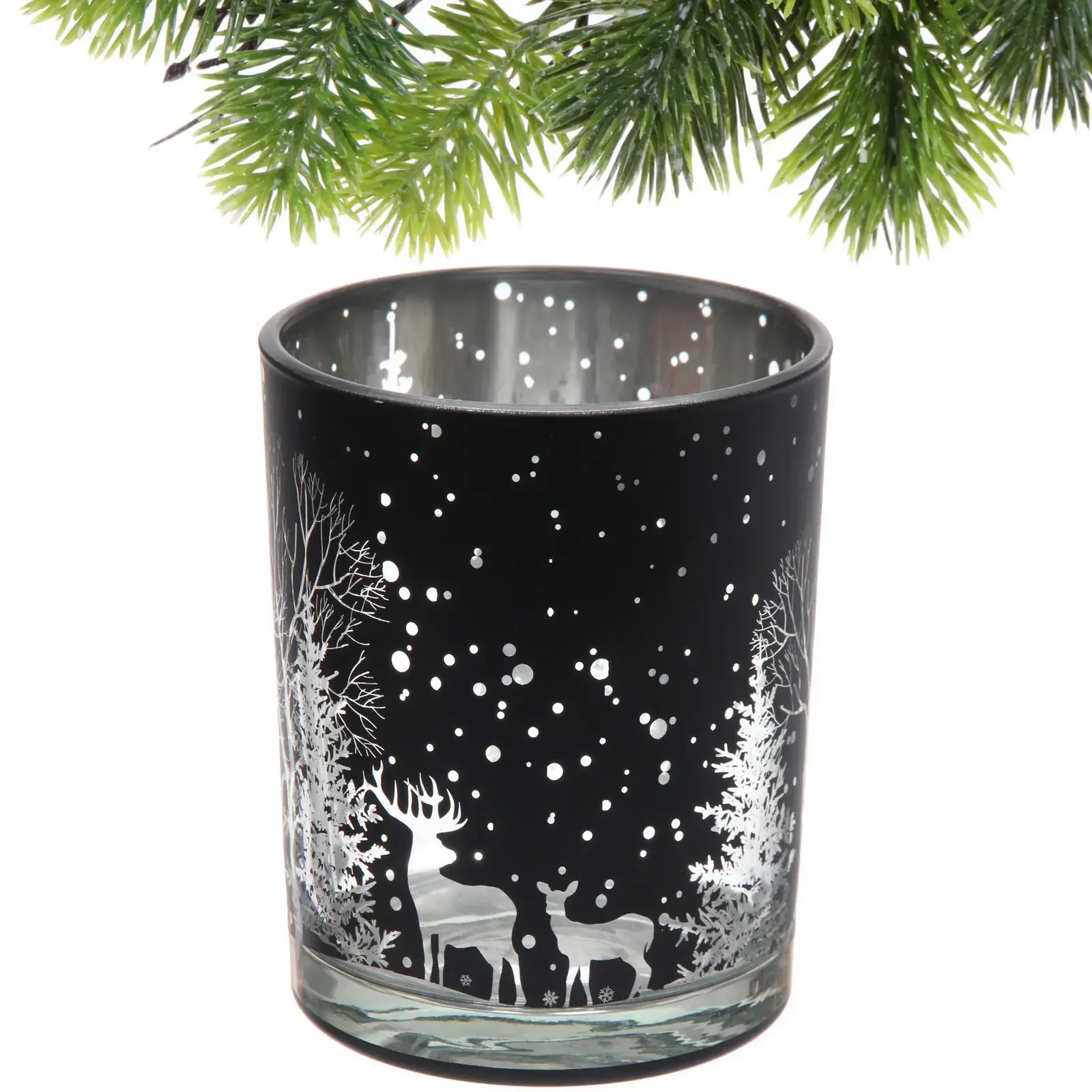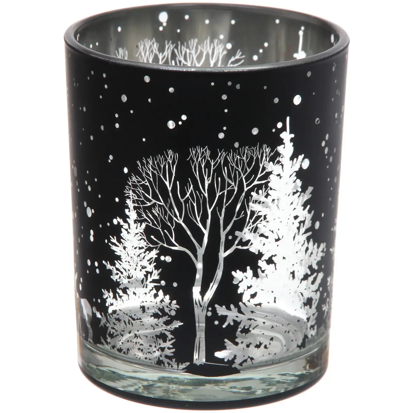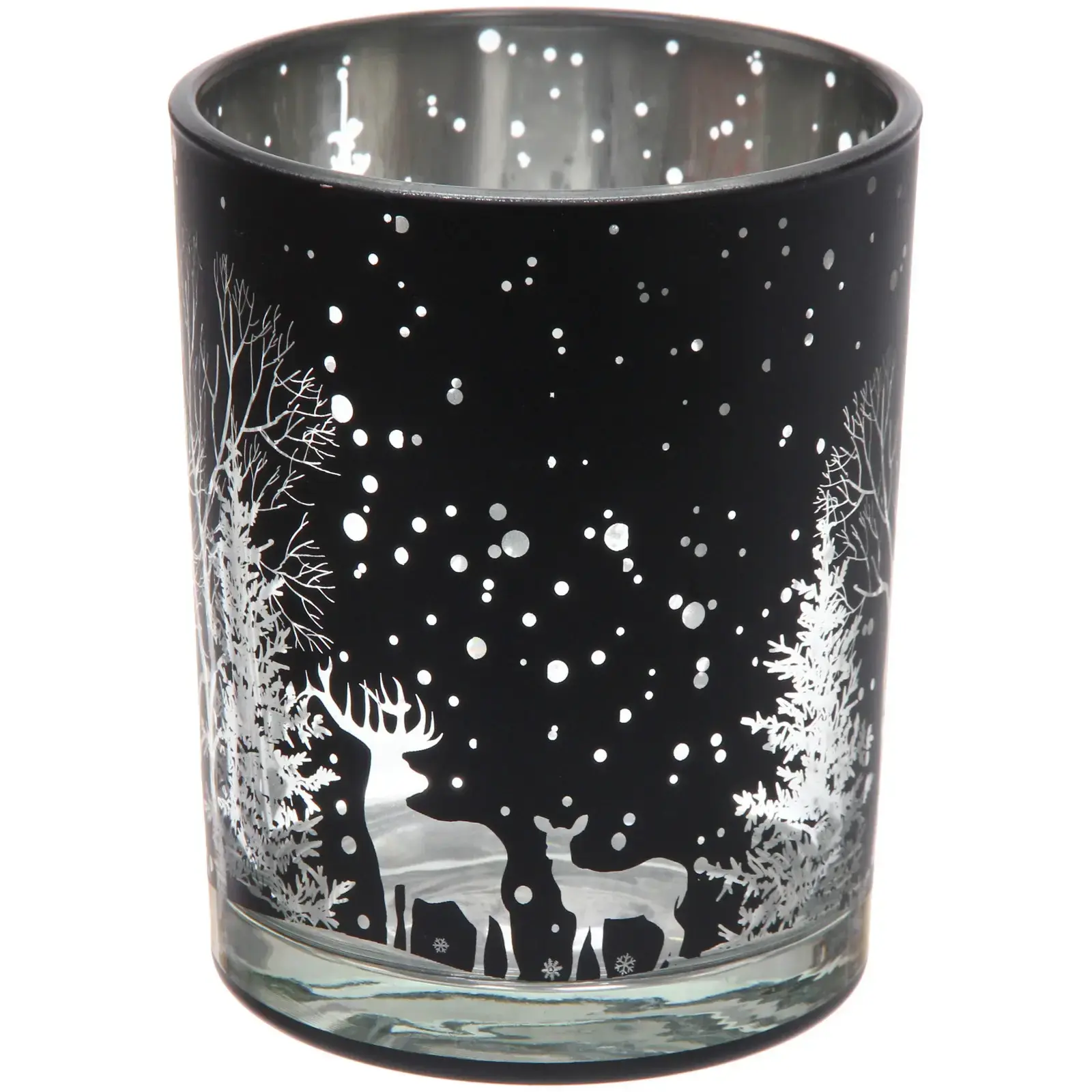 Создайте уютную атмосферу в вашем доме с подсвечником «Зимнее сияние». Этот стильный стеклянный подсвечник черного цвета с белыми и серебристыми рисунками станет идеальным дополнением к вашему интерьеру, особенно в зимний период и во время праздников. Его цилиндрическая форма и уникальный дизайн с изображениями оленей, деревьев и снежинок создают волшебное зимнее настроение.