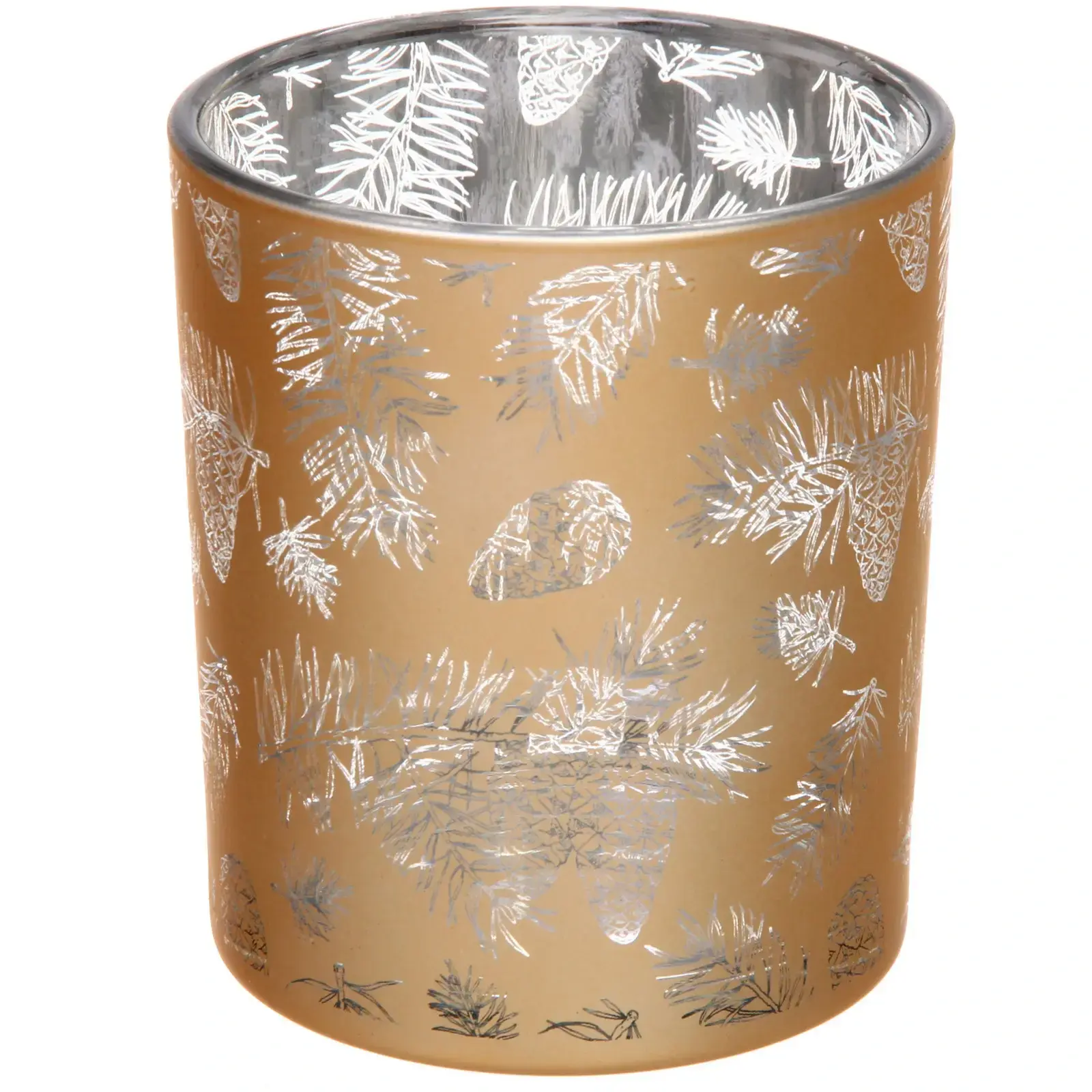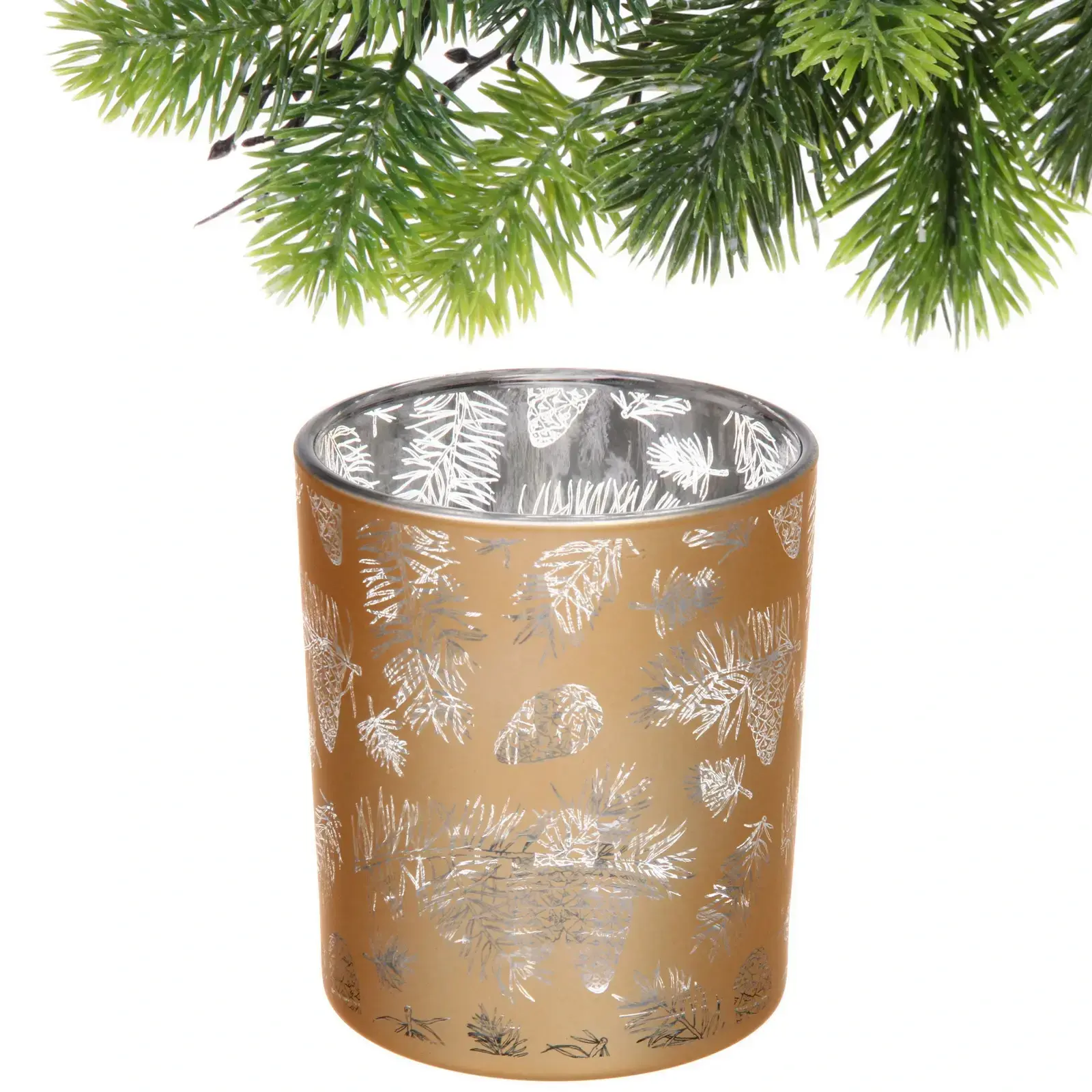 Размеры подсвечника составляют 8,5 см в диаметре и 10 см в высоту, что делает его компактным и удобным для размещения на столе или полке. Золотистый цвет с серебристым узором придаст вашему дому праздничный вид, а зеркальная внутренняя отделка будет красиво отражать свет свечи.