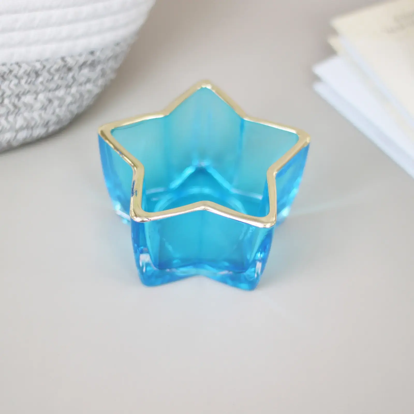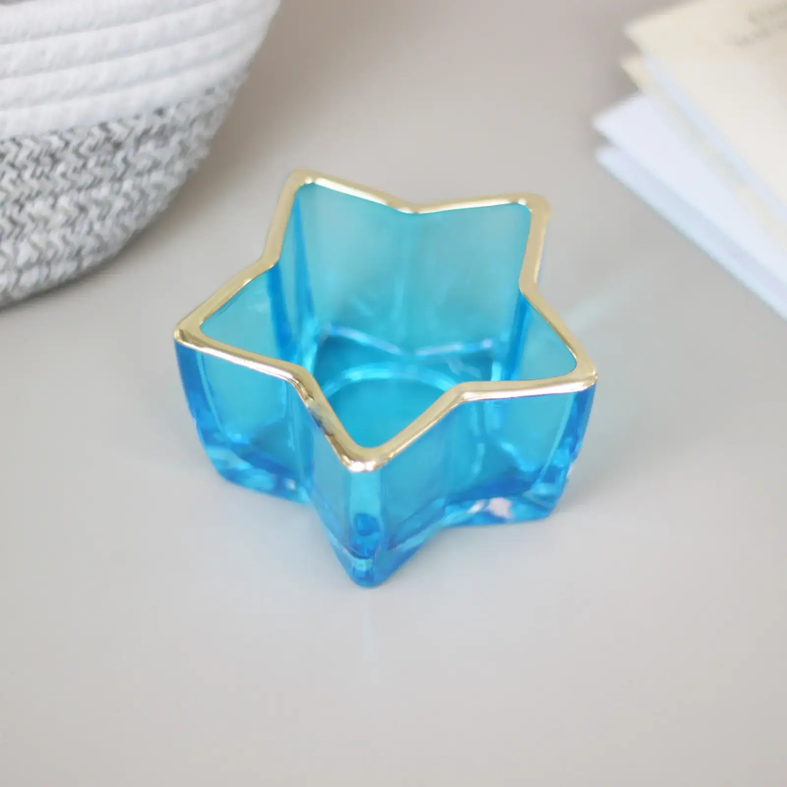 Материал подсвечника — стекло, что обеспечивает хорошую светопередачу и отражение. Форма звезды создаёт красивые светотени, усиливая декоративный эффект. Цвет голубой с золотистой окантовкой подойдёт как к современному, так и к классическому интерьеру.