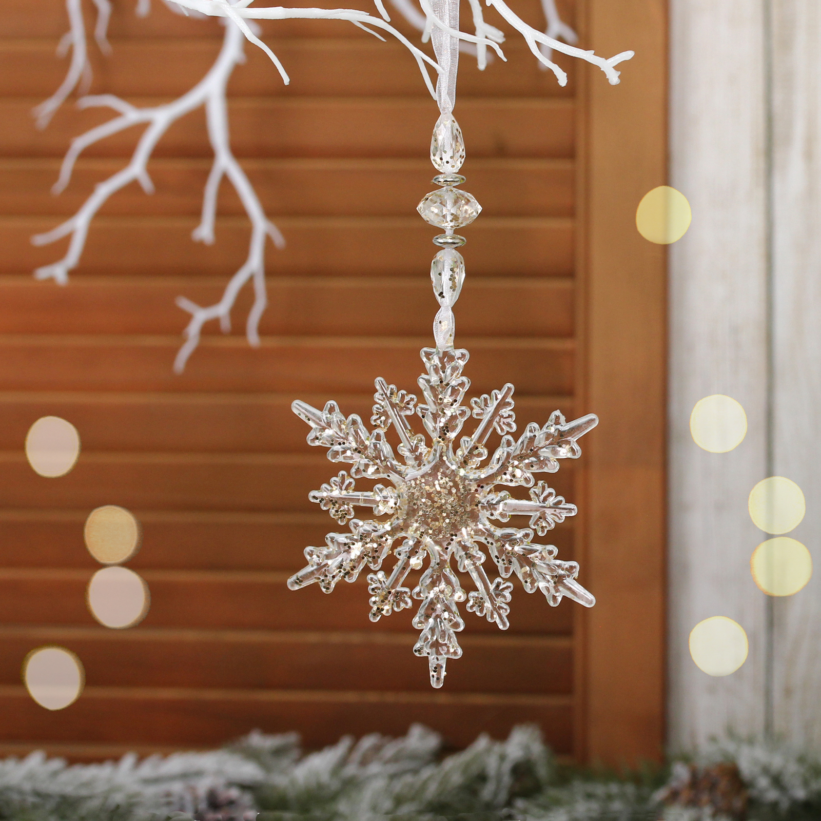 Подвесное украшение «Ажурная снежинка» 16 см, пластик, золотистые блестки, прозрачная лента с бусинами