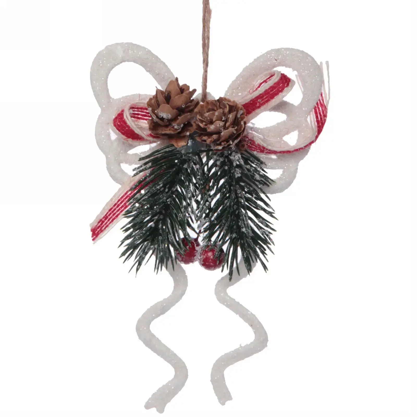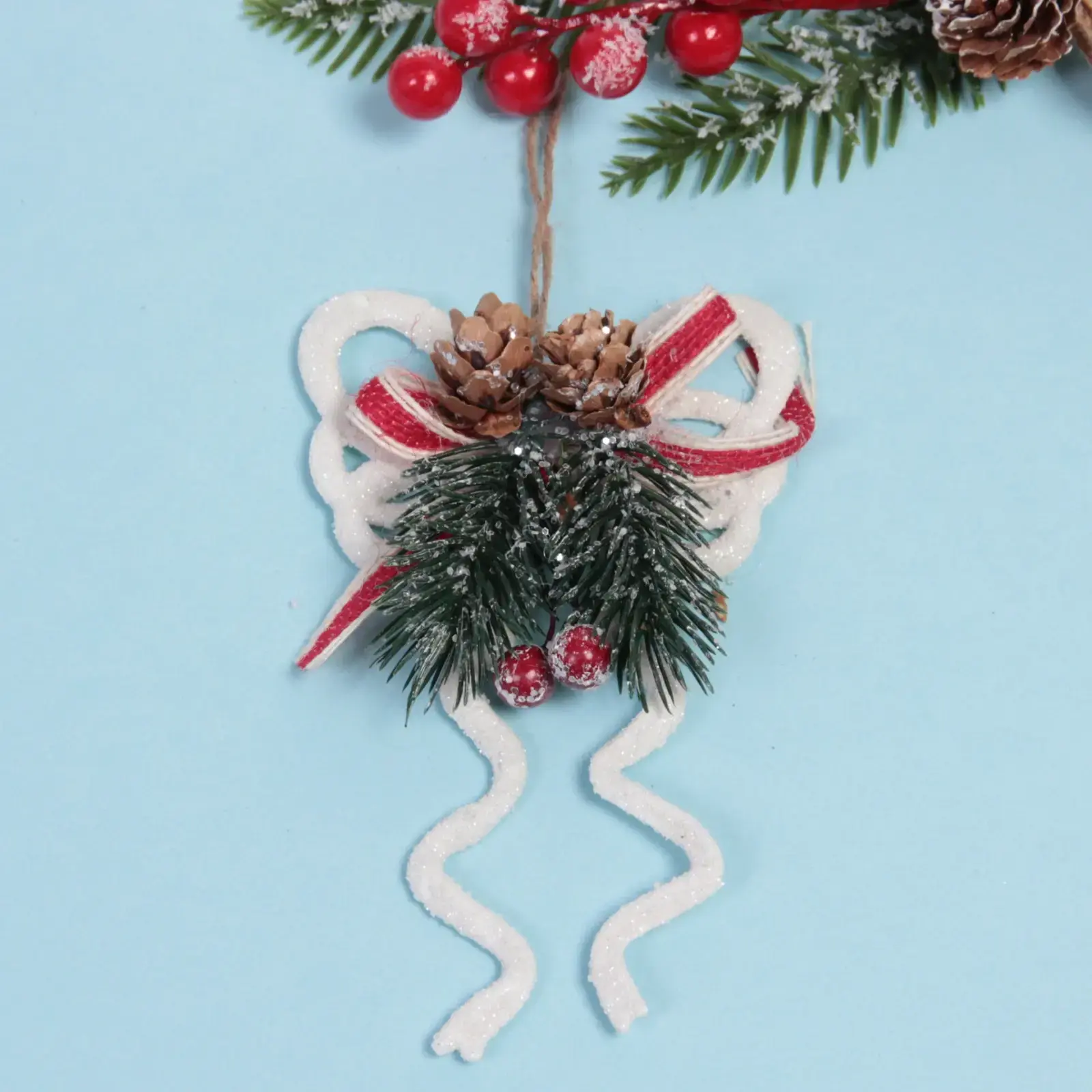 Размер подвески составляет 14*8,5 см, что делает ее заметным, но не громоздким элементом декора. Изготовлена из пластика, что обеспечивает легкость и устойчивость к повреждениям. Подвеска украшена зелеными пластиковыми хвойными элементами и красными ягодами, что добавляет ярких акцентов в общий дизайн.