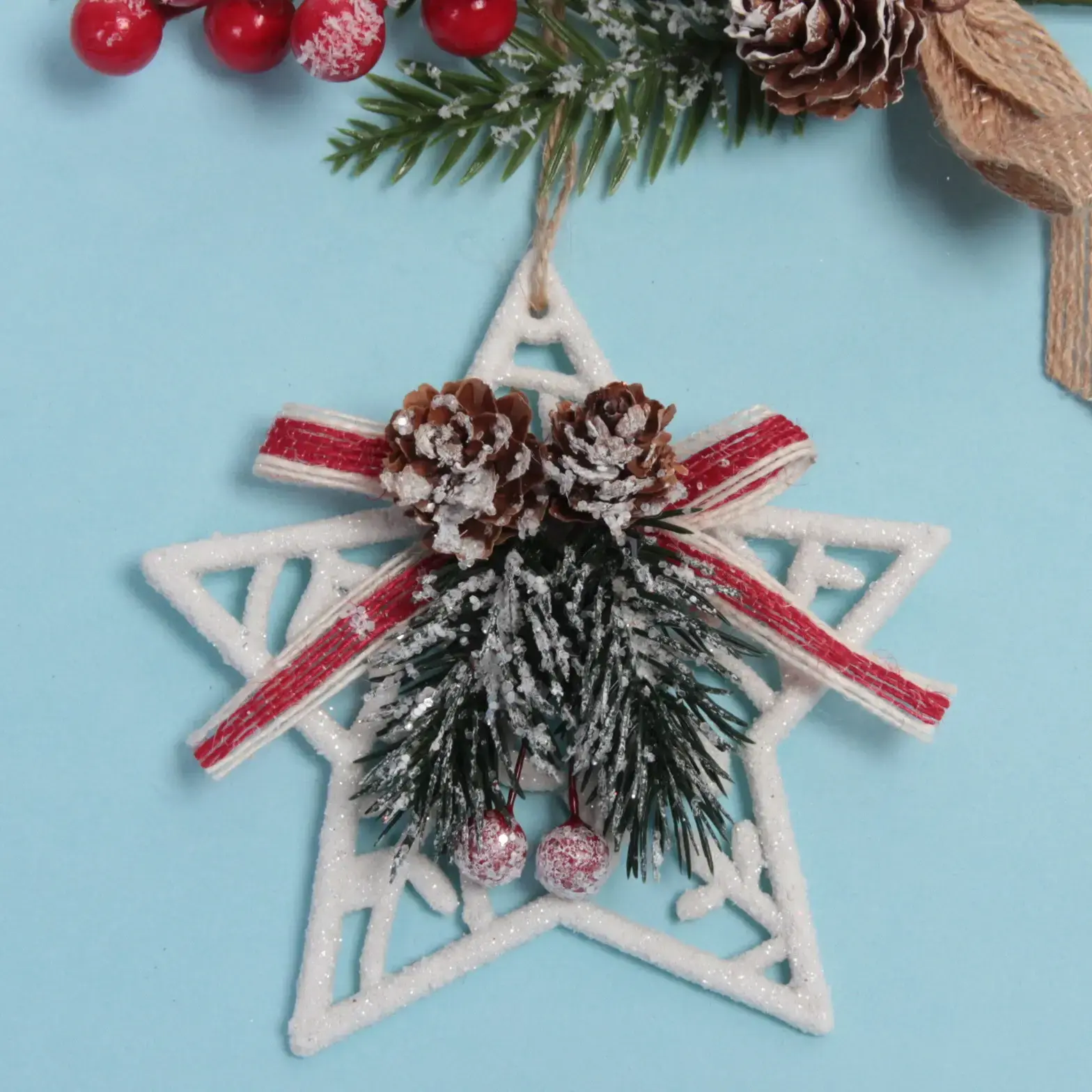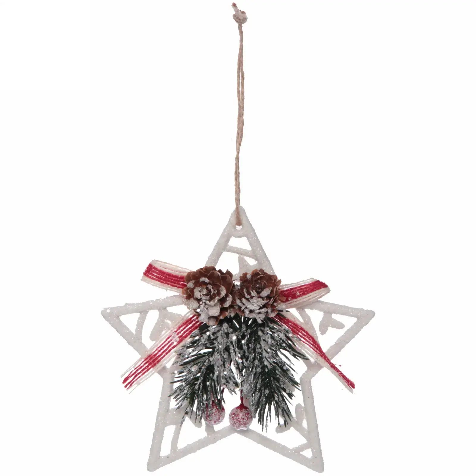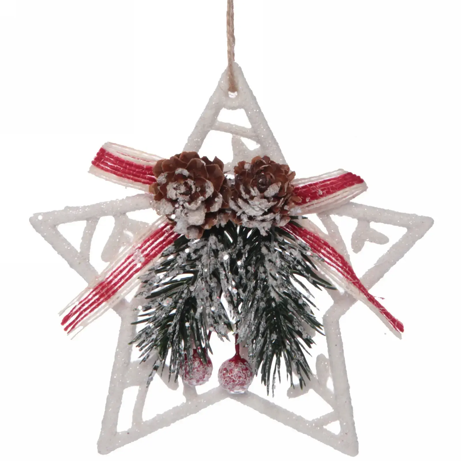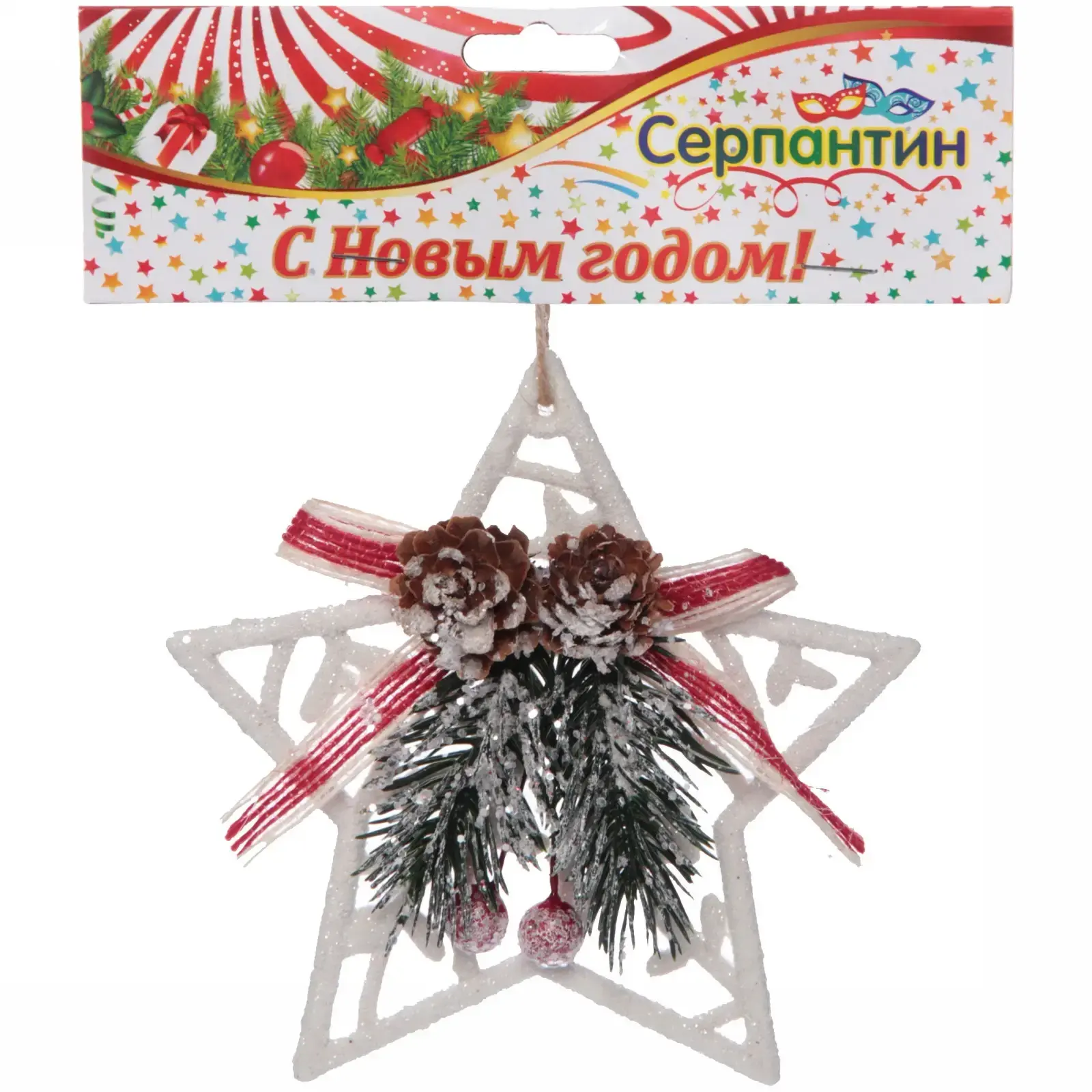 Размер подвески составляет 11,5 см, что делает ее идеальным выбором для украшения как больших, так и маленьких елок. Изготовлена из качественного пластика, что обеспечивает легкость и прочность. Декорирована красными и белыми ленточками, шишками и зелеными веточками, что добавляет ей праздничного настроения.